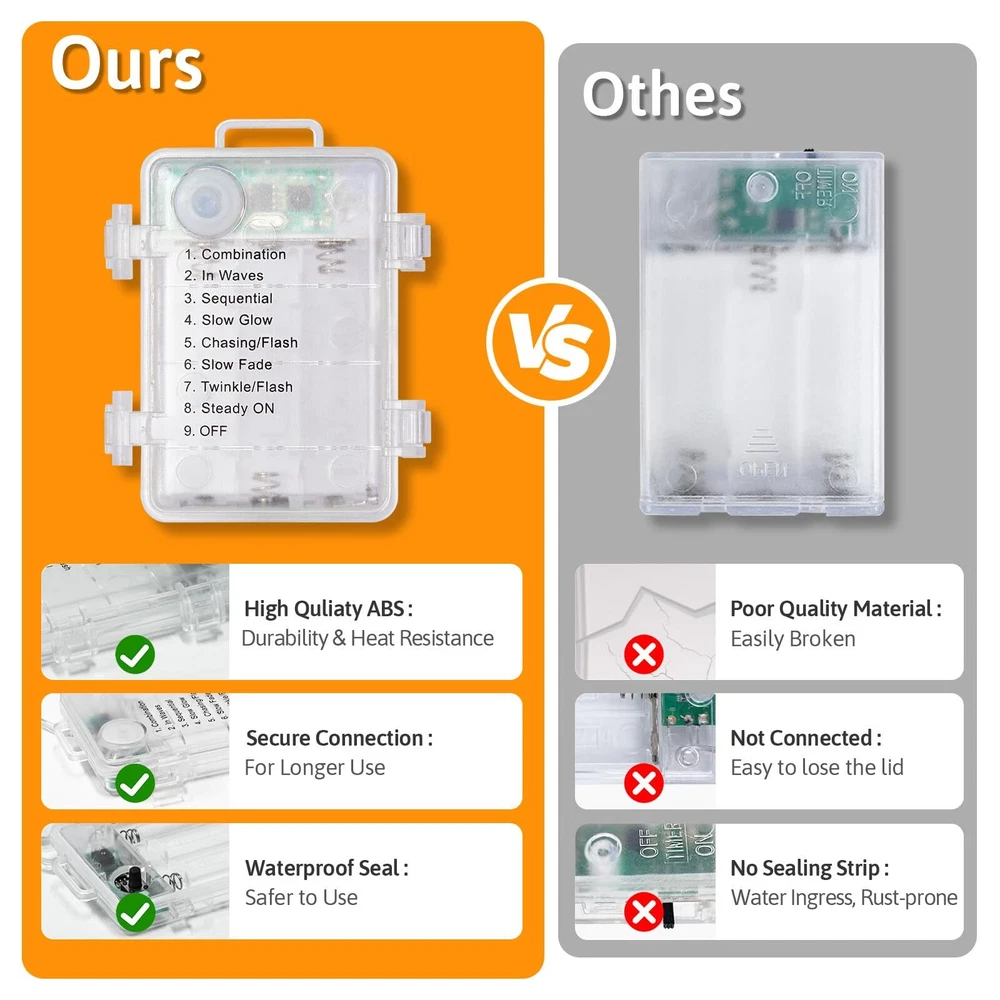 33ft 100 LED Fairy Lights Battery Operated with Remote, Battery Powered String Lights, Waterproof Twinkle Fairy Lights for Bedroom DIY Party Wedding Indoor Outdoor Christmas Decorations 1 PACK Remote Control Fairy Lights: The Multifunctional battery operated lights come with an upgraded remote control for added convenience. You can use the remote to switch between 8 flashing modes, adjust brightness, and set a timer (6 hours on, 18 hours off) to meet your different lighting mode and brightness needs Waterproof LED Fairy Lights: Fairy lights battery operated are perfect for outdoor use, shining brightly regardless of rain or damp conditions. Especially during Christmas, battery string lights can create a dazzling light show no matter the weather Flexible Copper Wire: Fairy lights battery operated feature 100% pure copper wire, unlike many on the market that use alloy wire disguised as copper. This genuine copper wire can be bent over 1,500 times without breaking and easily shaped Led fairy lights into any design you prefer. Enjoy DIY fun with family and friends Ultra-bright: Twinkle lights battery operated use bigger and brighter LED compared to fairy lights. String lights battery powered have an LED lifespan of over 100,000 hours, far exceeding the other fairy lights. High-quality string lights enhance your Christmas experience, allowing you to adjust the lighting with a remote control to create a dazzling Christmas light show tailored to your needs Wide Application Fairy Lights: Twinkle lights battery operated can easily cover large-scale scenes like yard, garden, fence, rooftop, patio, party, wedding, and bedroom making battery string lights ideal for indoor outdoor decor. Led fairy lights also add a touch of elegance to items such as mason jar, bouquet, centerpiece, closet, wreath, and mirror. Battery powered fairy lights are also an excellent choice for Christmas decor