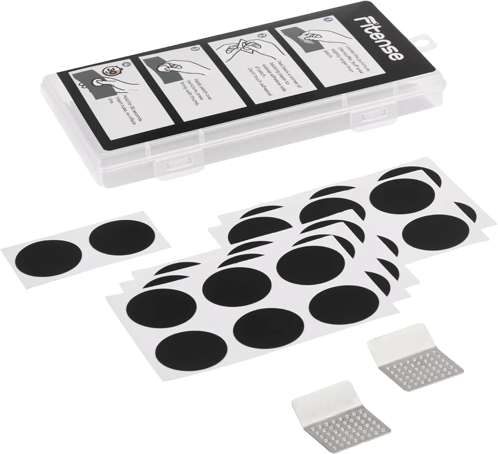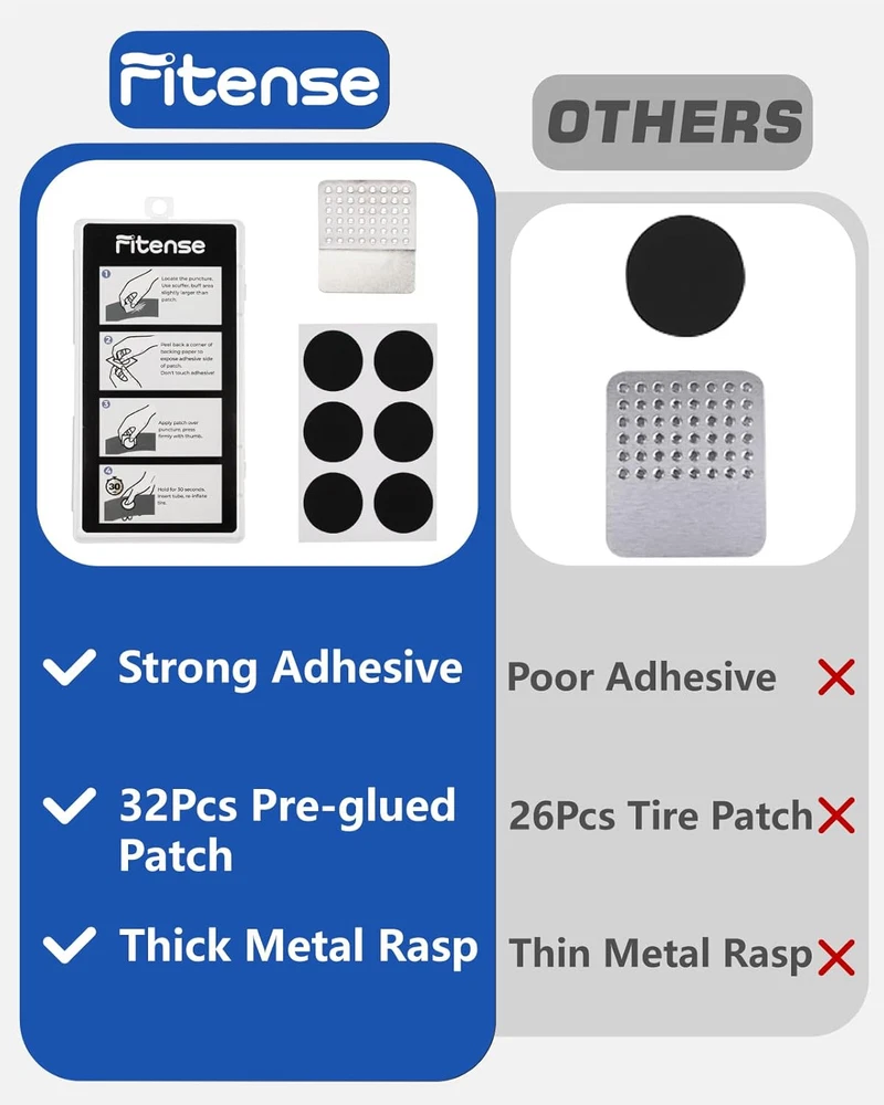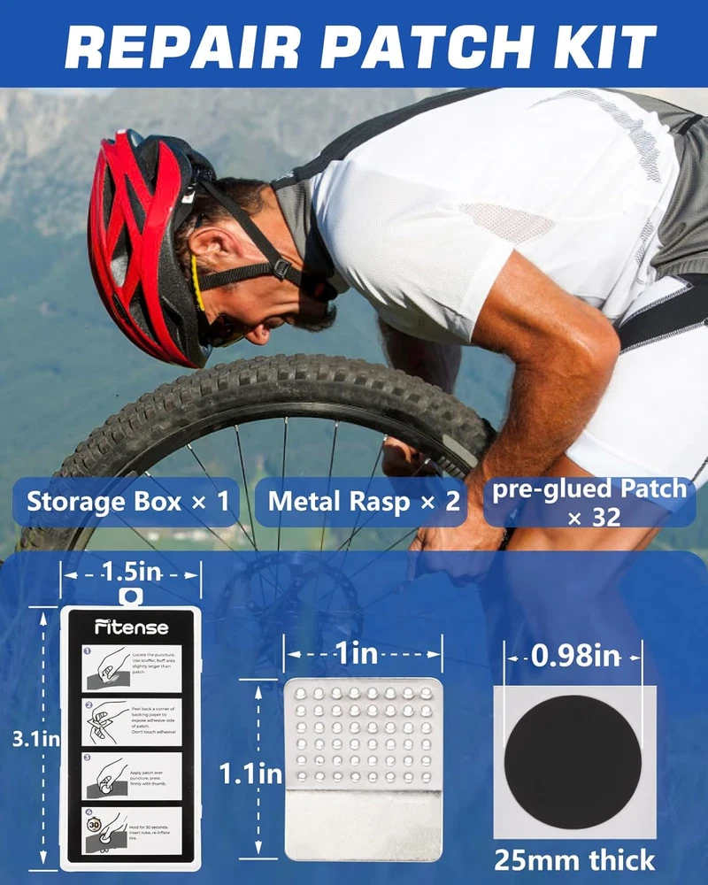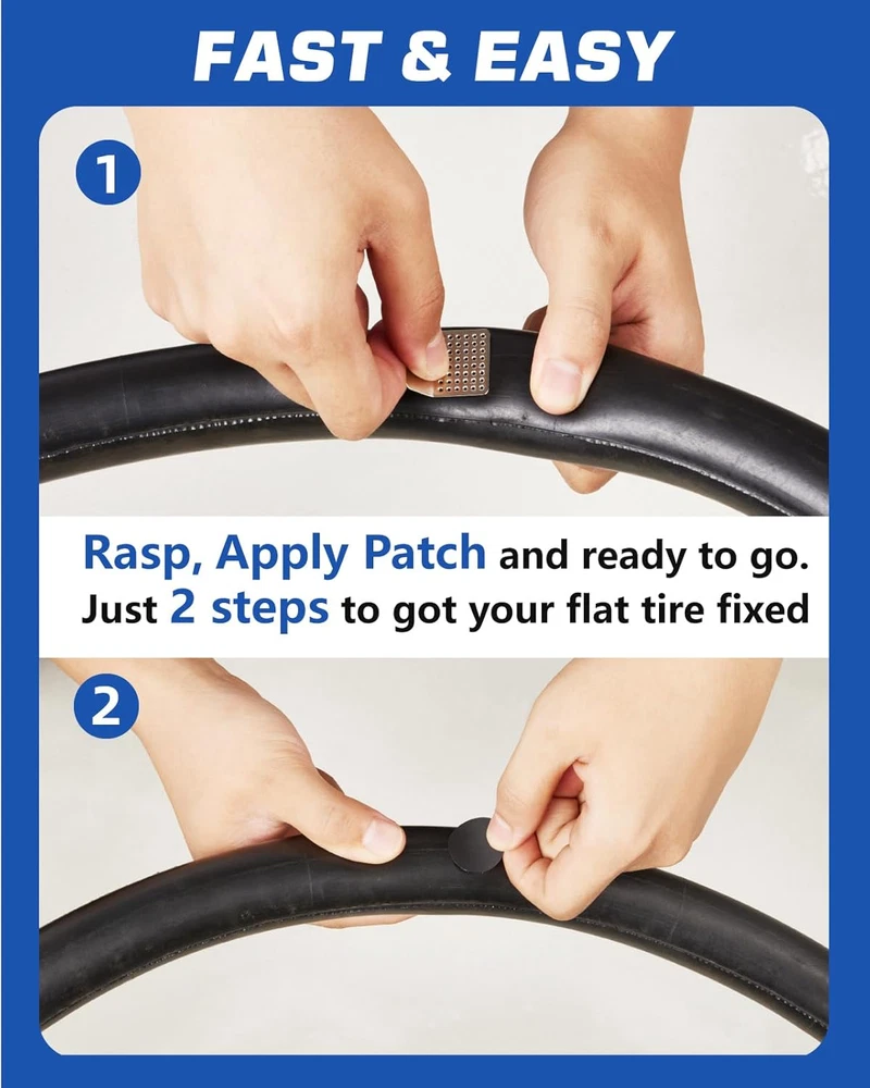 PROFESSIONAL REPAIR PATCH KIT: This bike tire patch kit includes 32 pieces pre glued patchs , 2 pcs metal rasp PREMIUM QUALITY TIRE PATCHES:Bike tire patch are made of high quality natural rubber, the adhesive-free patches adhere perfectly to the inner tube of the bicycle, which ensures a strong bond between the patches and the inner tube, effectively sealing punctures caused by nails, glass shards or other sharp objects, durable and long-lasting QUICK REPAIR PATCH PROCESS: Easily repair a tire inner tube with our bicycle tire patch kit. Sand the area around the puncture, and then firmly attach the patch to the puncture RELIABLE AND PORTABLE: This bike patch repair kit comes with a compact storage case to keep all components organized and portable. With our portable bike tire repair kit, you can ride with confidence MULTIFUNCTIONAL COMPATIBILITY: This bicycle tire patch repair kit and glue kit can be used to repair bicycle, motorcycle, BMX bike, stroller and wheelchair inner tubes for a wide range of vehicles and inflatables Product Description
