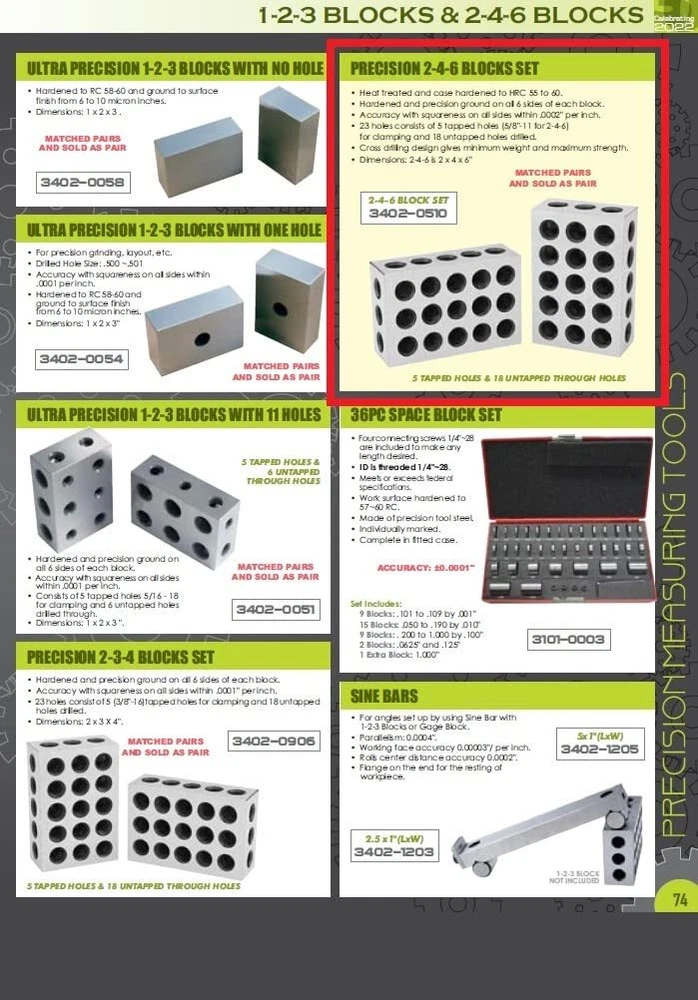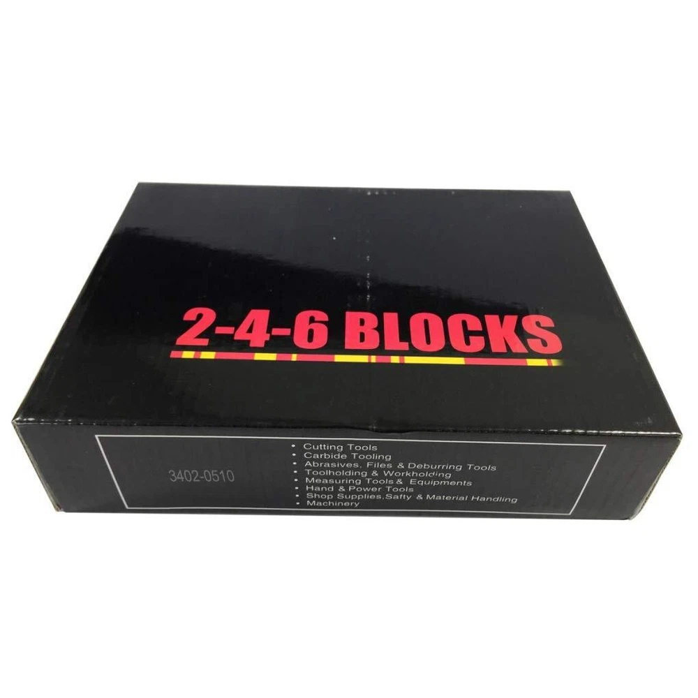 Heat treated and case hardened to HRC 55 to 60. Hardened and precision Ground on all 6 sides of each block. Accuracy with squareness on all sides within .0002" per inch. 23 holes consists of 5 tapped holes that are 5/8"-11 for clamping and 18 untapped holes. Cross drilling design gives minimum weight and maximum strength. Hardened and precision Ground on all 6 sides of each block Accuracy with squareness on all sides within .0002" per inch 23 holes consists of 5 tapped holes that are 5/8"-11 for clamping and 18 untapped holes Cross drilling design gives minimum weight and maximum strength
