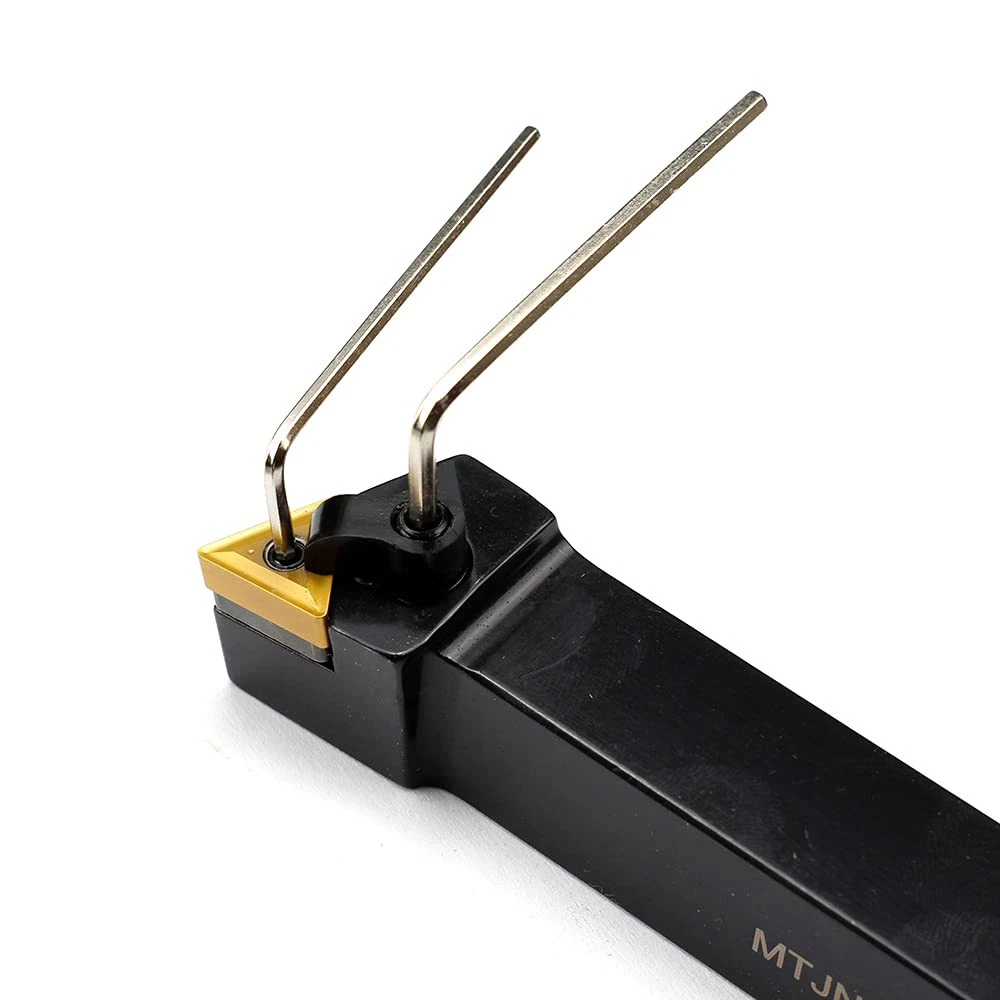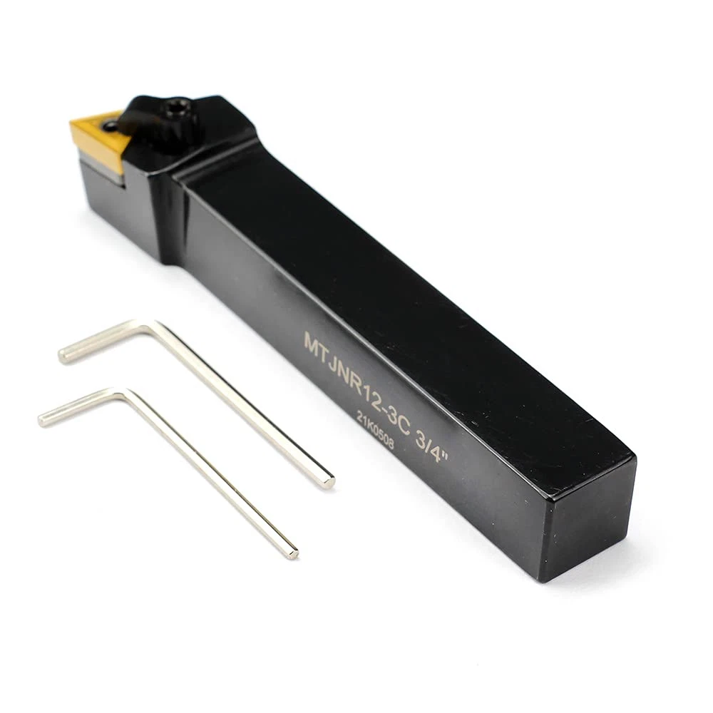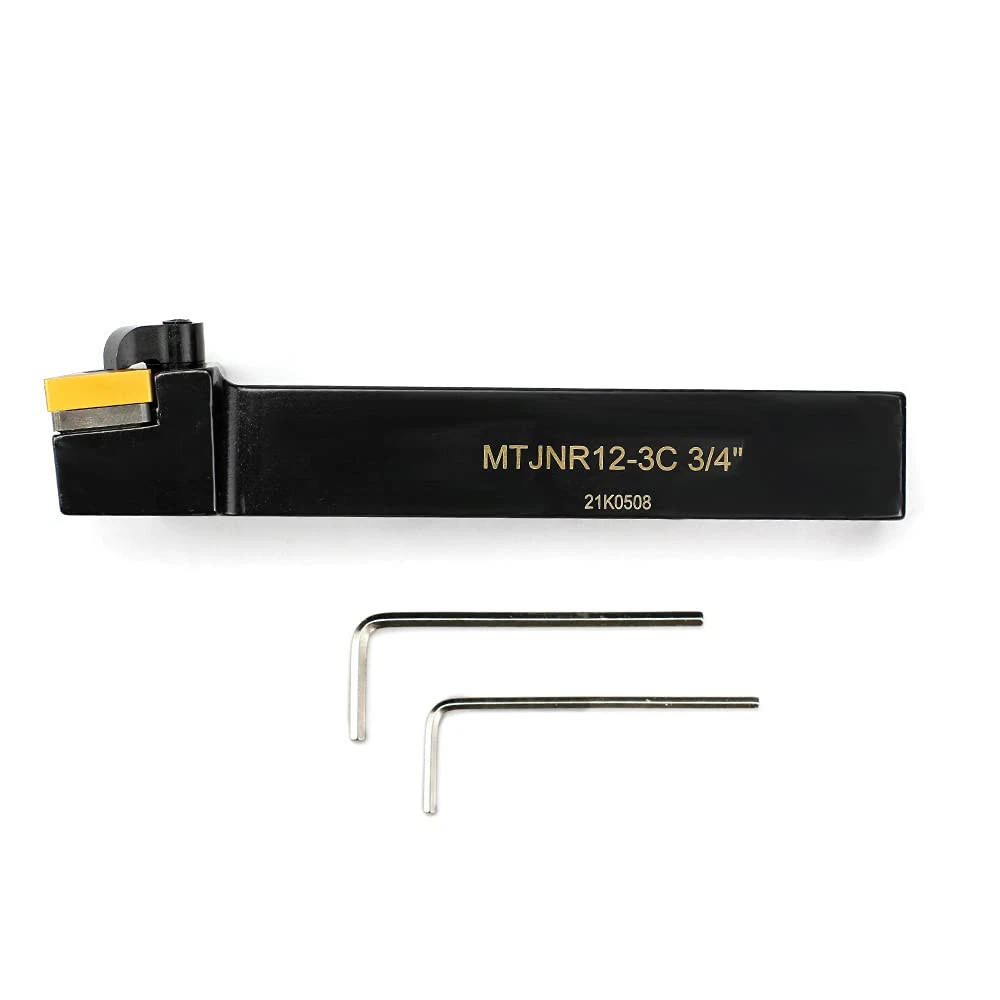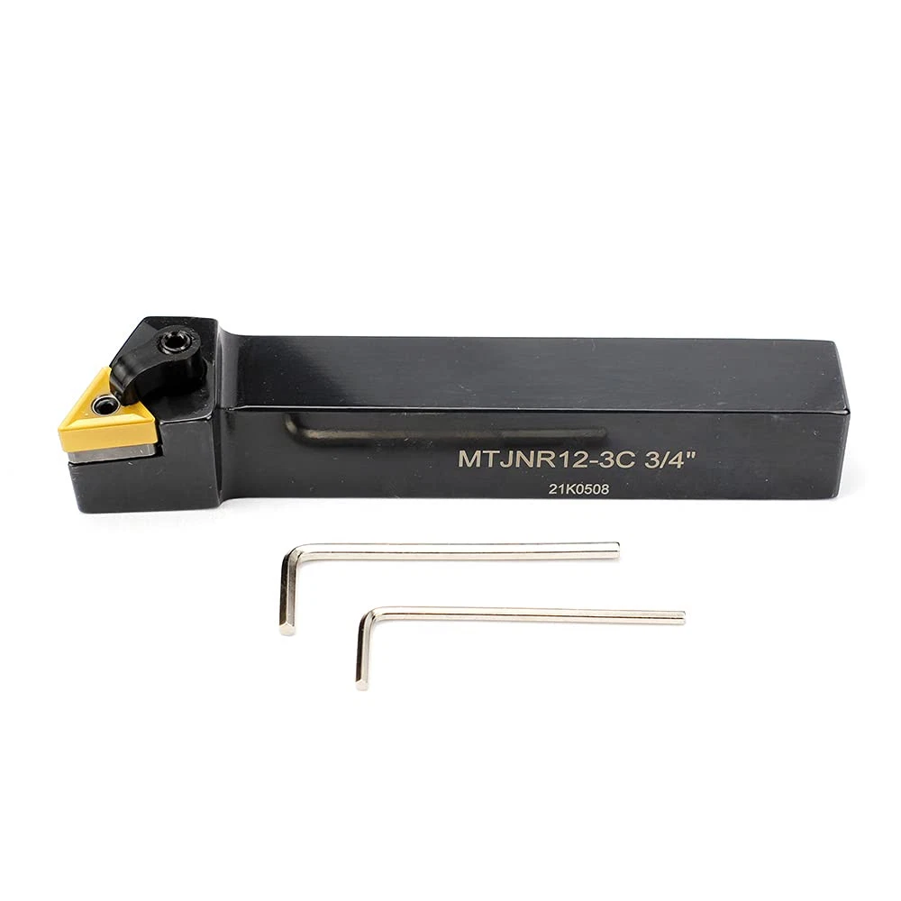 MTJNR 12-3C Right Hand Turning Tool Holder,3/4”Shank ,5” Length ,negative 3 degree lead angle Turning holder is made of HSS,carbide insert is made of solid carbide with tin coated, offer long tool life and faster cutting speed, low friction coefficient, good wear resistance Indexable Turning Holders use with TNMG, TNMA, or TNMM-32 style negative inserts MTJNR 12-3C Lathe Tool Holder,93 degree,clanping& Tool style for turning MTJNR 12-3C indexable tool holder for external contouring, profiling and facing from light roughing to finishing