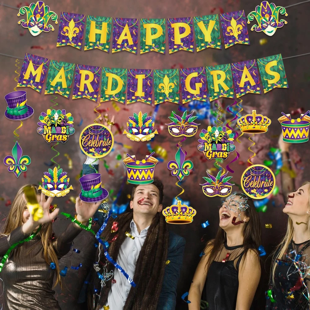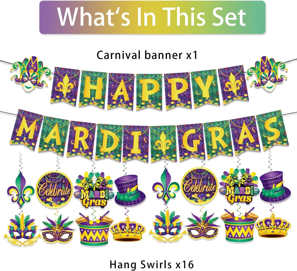 Cartoon Character: Mardi Gras Included Components: Birthday Banner, Cutouts, Mardi Gras Decor Hanging Swirls Brand: Does not apply Color: Green, Purple, Gold Item Weight: 3.84 ounces Shape: Irregular shape Country of Origin: China Theme: Mardi Gras Pattern: Mardi Gras Occasion: Birthday Type: Does not apply Material: Cardstock, Paper