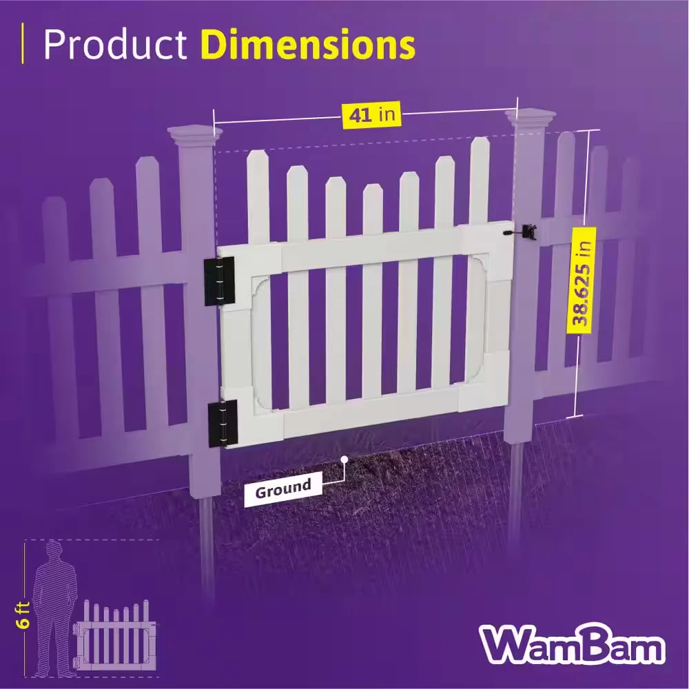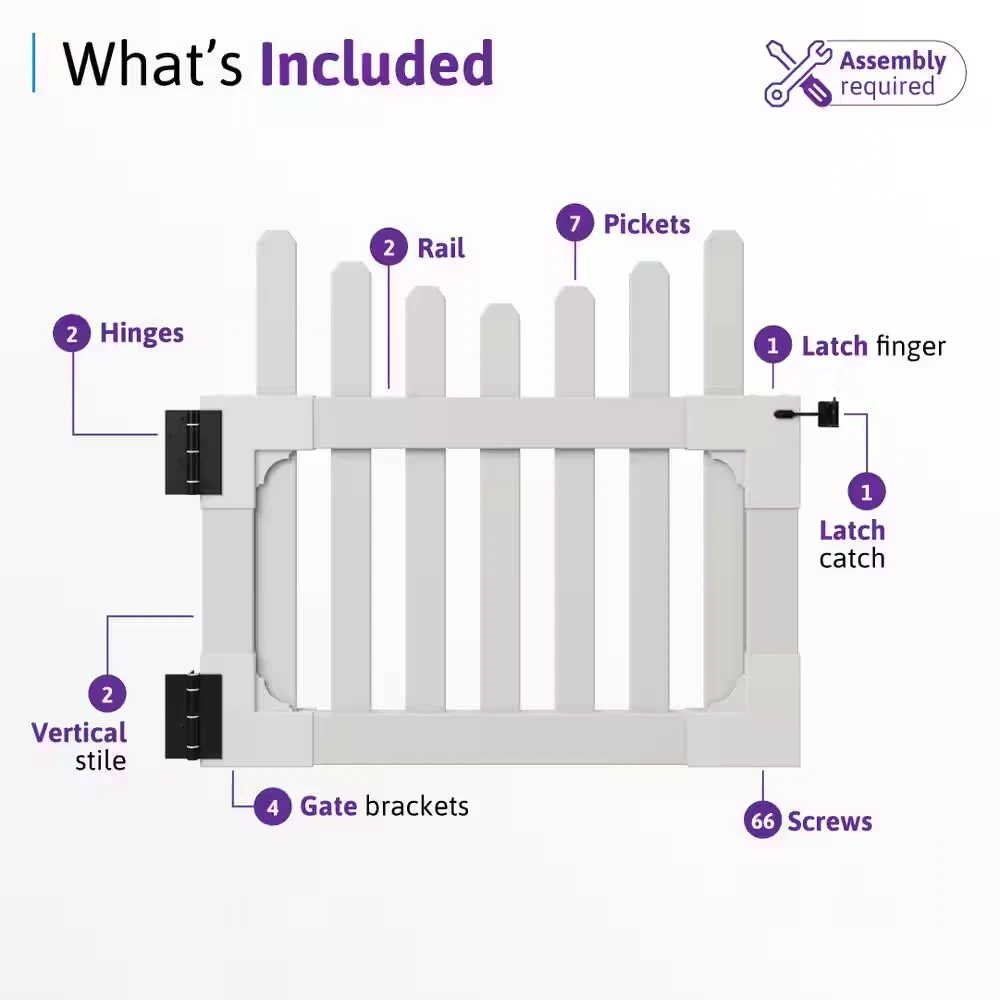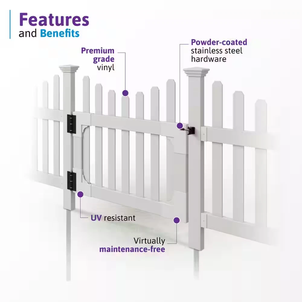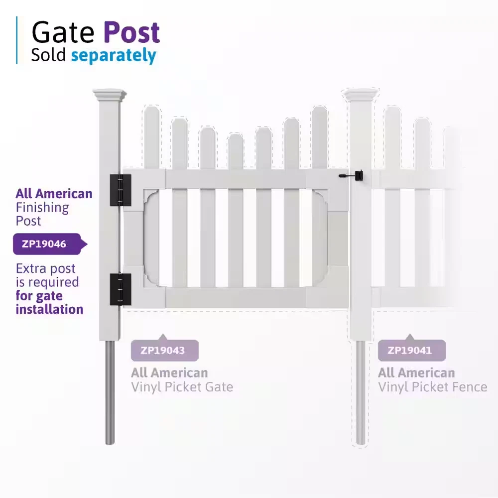 Permanent & Sturdy - Premium grade vinyl wind Tested up to 75 MPH Limited Lifetime Warranty that you can trust DIY Friendly - no-dig fence; no concrete & no experience required Make a great first impression with the All American Vinyl Picket Gate. This classic gate is designed to match the No-Dig All American Vinyl Fence, offering a cohesive and inviting look for any yard or garden.Made from premium, weather-resistant vinyl, it offers the classic look of painted wood-without the upkeep. It won't crack, warp, or yellow, and stays beautiful for years.Installation is simple with included hardware: adjustable hinges, spring-loaded latch (operable from both sides), and all necessary components. Assembly takes about 60 minutes with basic tools (posts sold separately, item ZP19046). Easy to install, built to last-complete your fence project today.