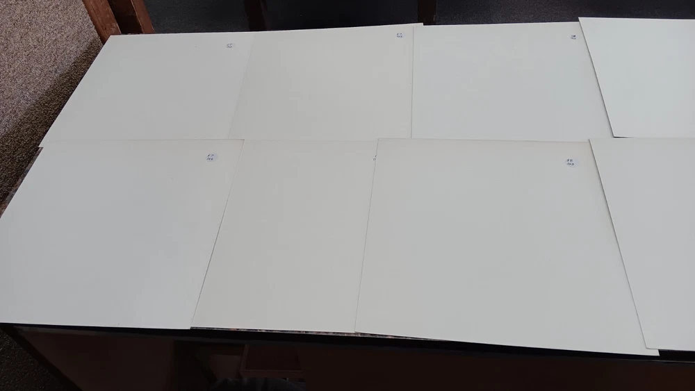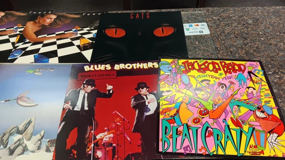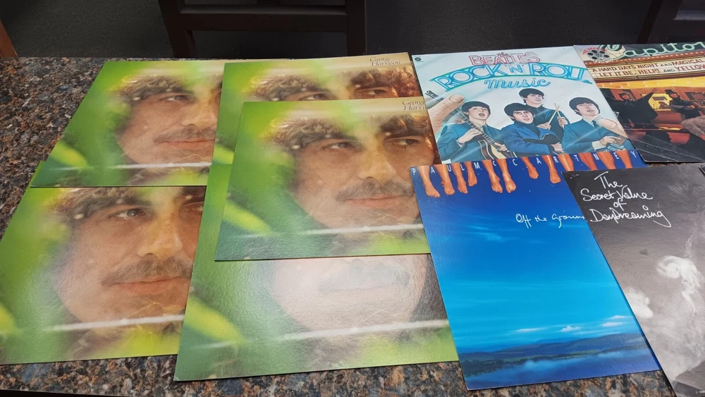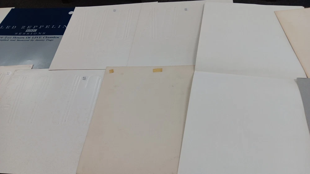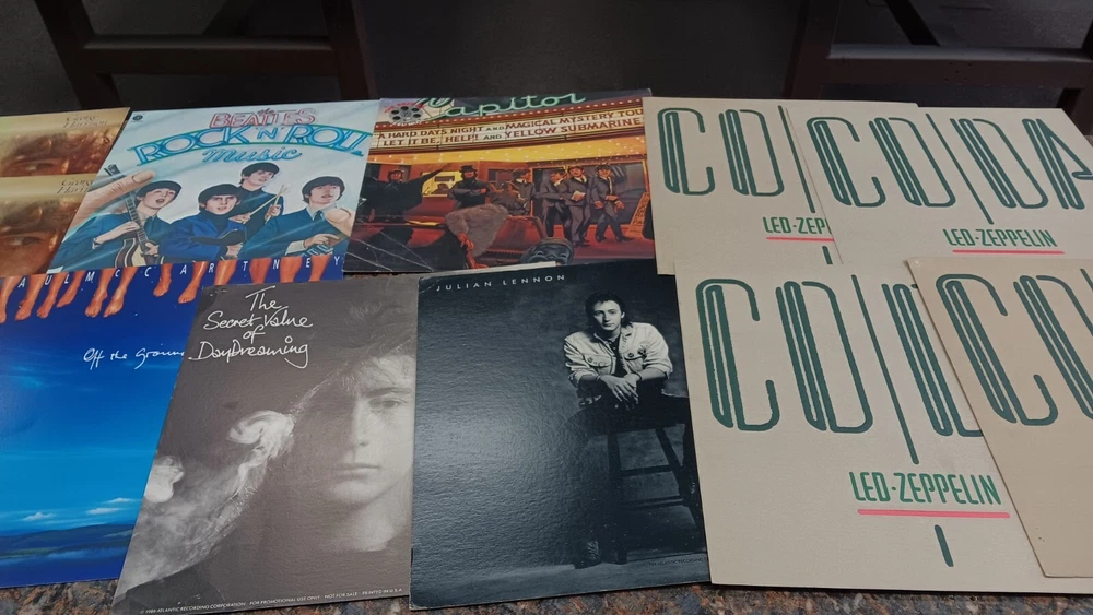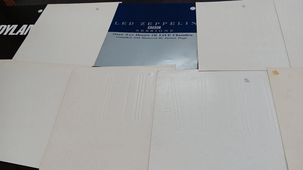 Lot of 35 album cover flats (not albums with records). Price sticker on back of flats. Some might be two sided. Please see all the pictures for condition, some might be wrinkled, have pin holes, edge wear, tape, were put on a wall, or have writing on them. Pictures of backs included. 35 flats in total. You will receive the flats pictured: 5 - George Harrison 1 - Paul McCartney 1 Beatles Rock n Roll 1 Beatles 1 Julian Lennon - Scret 1 Julian Lennon - Valotte 4 Led Zeppelin - Coda 1 Led Zeppelin - BBC Sesions 1 Deep Purple 2 Queen - Flash Gordon 1 Bob Dylan 2 The Police 1 Ironhorse 2 Billy Thorpe 2 Whitesnake 2 Utopia 2 Touch 2 Yes 1 Cats 1 Blue Brothers 1 Jackson Band - Beat Crazy