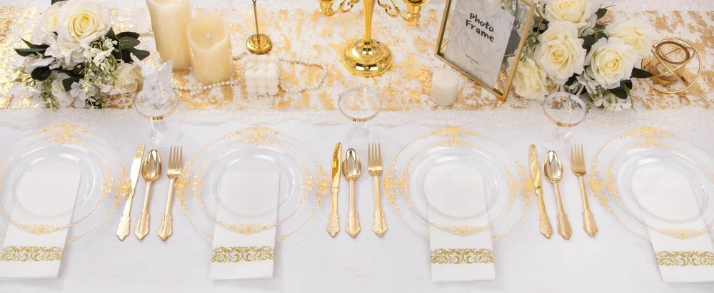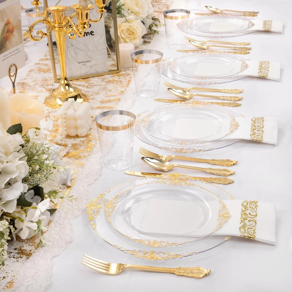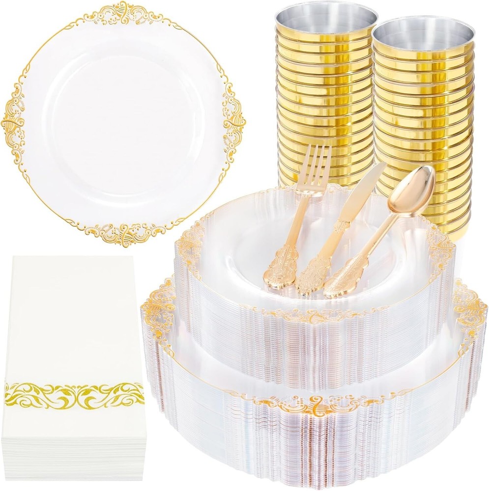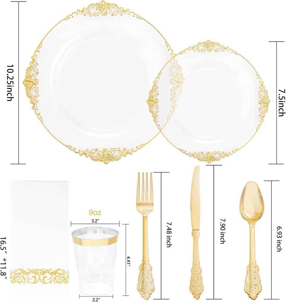350PCS Clear Gold Plastic Plates - Gold Plastic Dinnerware Sets for 50 Guests - 100 Gold Disposable Plates, 150 Gold Plastic Silverware, 50 Cups, 50 Napkins for Wedding & Party & Thanksgiving Elegant Design: This clear and gold plastic plates with its Baroque-inspired design brings an unexpected touch of luxury to the realm of single-use tableware. This gold plastic plates combines intricate and ornamental motifs typical of the Baroque period, offering a unique blend of historical elegance and practical convenience. Premium Quality: Made from premium food-safe plastic, these gold plastic dinnerware sets are designed for one-time use, making them perfect for large-scale events, parties, or catered affairs where ease of cleanup is paramount. Despite being disposable, our clear gold plates maintain a sturdy construction that can hold a variety of meal portions without bending or breaking under weight. Great Value: Although intended for single-use, these Baroque-styled clear and gold rim plates offer a cost-effective alternative compared to traditional porcelain or ceramic ware. This gorgeous gold plates allows hosts to create an opulent atmosphere without the worry of breakage or the need for extensive post-event washing. Perfect for Any Occasions: Our gold party plates are designed to elevate any event with a touch of elegance, whether it's a birthday, wedding, anniversary, party or any other special occasions. The magnificence of our plastic plates will make your party perfect! Versatile Functionality: Ideal for a wide array of culinary presentations, from appetizers to main courses and desserts, these stylish yet practical disposable plates for wedding party can effortlessly accommodate various types of food while maintaining the sophisticated atmosphere of your event. Our wedding plates want to give you a perfect holiday experience! Where Every Celebration Shines