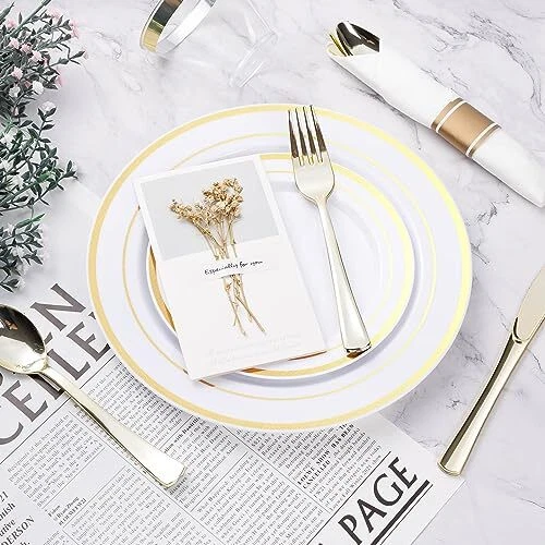PERFECT DIMENSION - Seamlessly fitting into every occasion, this exceptional party plate set is the perfect choice. When you invest in this package, you'll receive 50 dinner plates measuring 10.25 inches, 50 salad plates at 7.5 inches, 50 sets of gold silverware with pre-rolled napkins, and 50 cups at 9 oz. DURABLE & BPA FREE - Constructed for durability and certified BPA-free, our plastic plates and silverware are manufactured from heavy-duty materials, ensuring they meet the highest food-grade standards. Feel free to utilize these gold plastic charger plates to serve hot foods such as pasta and turkey. VEERSATILE OCCASSIONS - Tailor-made for a variety of events, the elegant design and classy color scheme of these party supplies elevate any occasion. Be it weddings, anniversaries, birthdays, or bachelorette parties, the timeless gold color adds an air of sophistication. The convenience of disposable plates also means less cleanup hassle, particularly valuable for party planners looking to save time. ELEGANT DESIGN - featuring classic white plates adorned with timeless gold rims, effortlessly integrate into any event, resembling authentic ceramic plates. These disposable plates and gold silverware sets exude a classic, timeless aura, much like the cherished memories they help create for guests. CONVENIENT TO USE - No more fussing over pre-party style coordination, whether you're a planner or a host. Once the event is over, just dispose of disposable plates for a quick cleanup. Moreover, these reusable plastic plates are easy to clean and store, adding an extra layer of convenience. Make entertaining a breeze today!