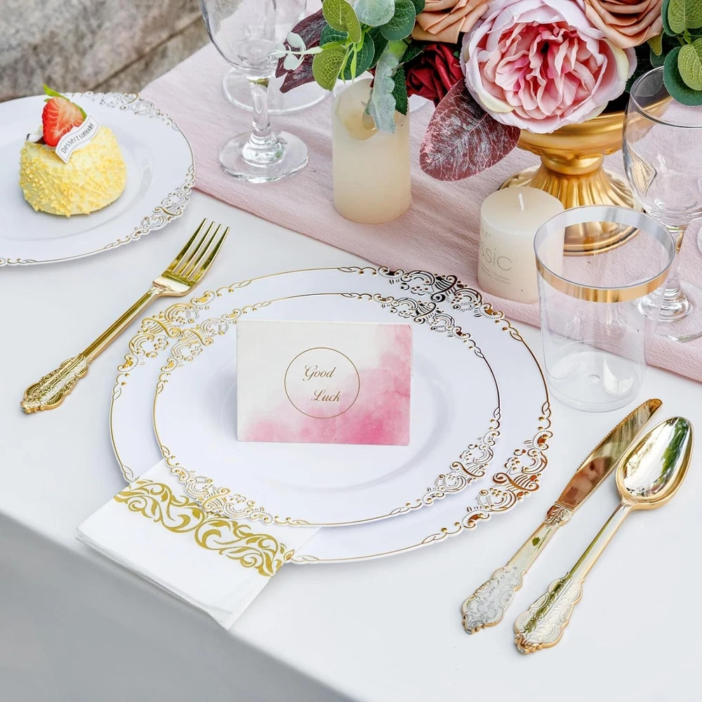 350PCS Gold Plastic Plates - Gold Plastic Dinnerware Sets for 50 Guests - 100 Gold Disposable Plates, 150 Gold Plastic Silverware, 50 Cups, 50 Napkins for Wedding & Party & Thanksgiving 50 Guests Value Pack : Served for 50 white and gold plastic plates include 50 dinner plates, 50 dessert plates, 50 knives, 50 forks, 50 spoons, 50 cups and 50 napkins. Our gold plastic plates are great choice for weddings and parties. Premium Quality: White gold plates are made of heavy plastic and resistant to breaking, bending and snapping. And gold plastic plates are food grade plastic, BPA free, non-toxic. Hold a happy party for your guests with these exquisite clear white and gold plates! Reusable & Convenience: White with gold rim plates can be reused and will look as good as new after washing. White plastic plates are also disposable plates, so they can be discarded after use, which is very convenient to use, saving time and eliminating the need to wash dishes. I hope our white gold plastic plates can bring you a good use experience and bring you a convenient life. Perfect For Any Occasion: These white disposable plates are designed for using at parties, weddings, luncheons, family gatherings, engagement parties, BBQs, Thanksgiving day, dinners, reunions, birthdays, fiestas, retirement celebrations, picnics, buffets, catering, food services and more! There is always a time when disposable gold plastic plates sets are convenient. Convenient To Use: Table covers intended for buffet tables, Plastic utensils are NOT suitable for boiling hot liquids, Microwave use, or Dishwasher use. Convenient to serve the guests, and their transparent style offers exceptional versatility, working well for casual and upscale gatherings alike. Where Every Celebration Shines