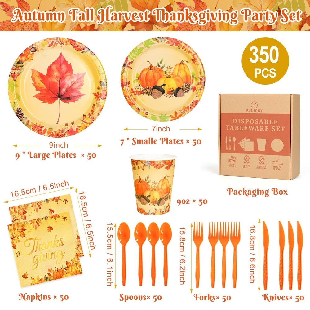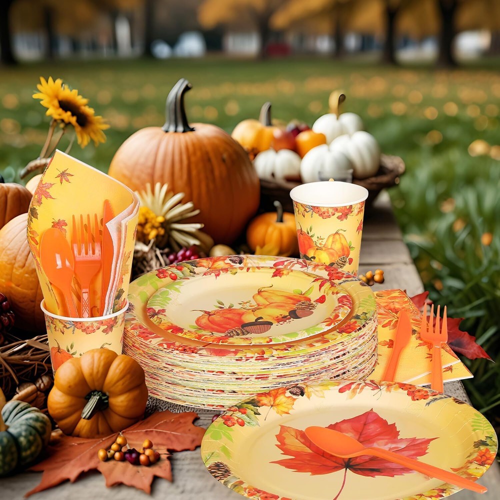 350-Piece Fall Dinnerware Set for Thanksgiving & Autumn Parties – Plates, Napkins, Decorations