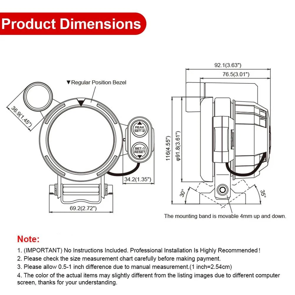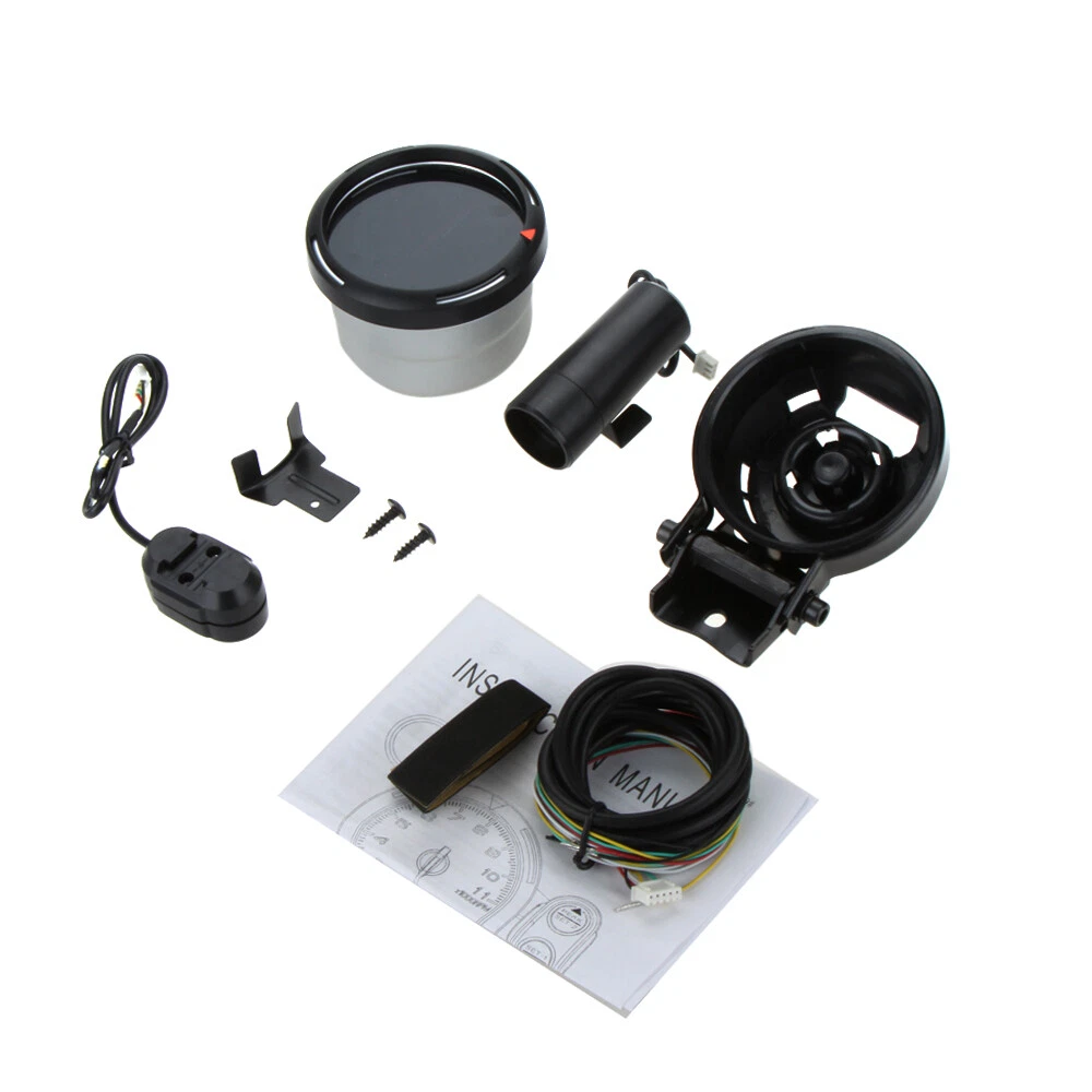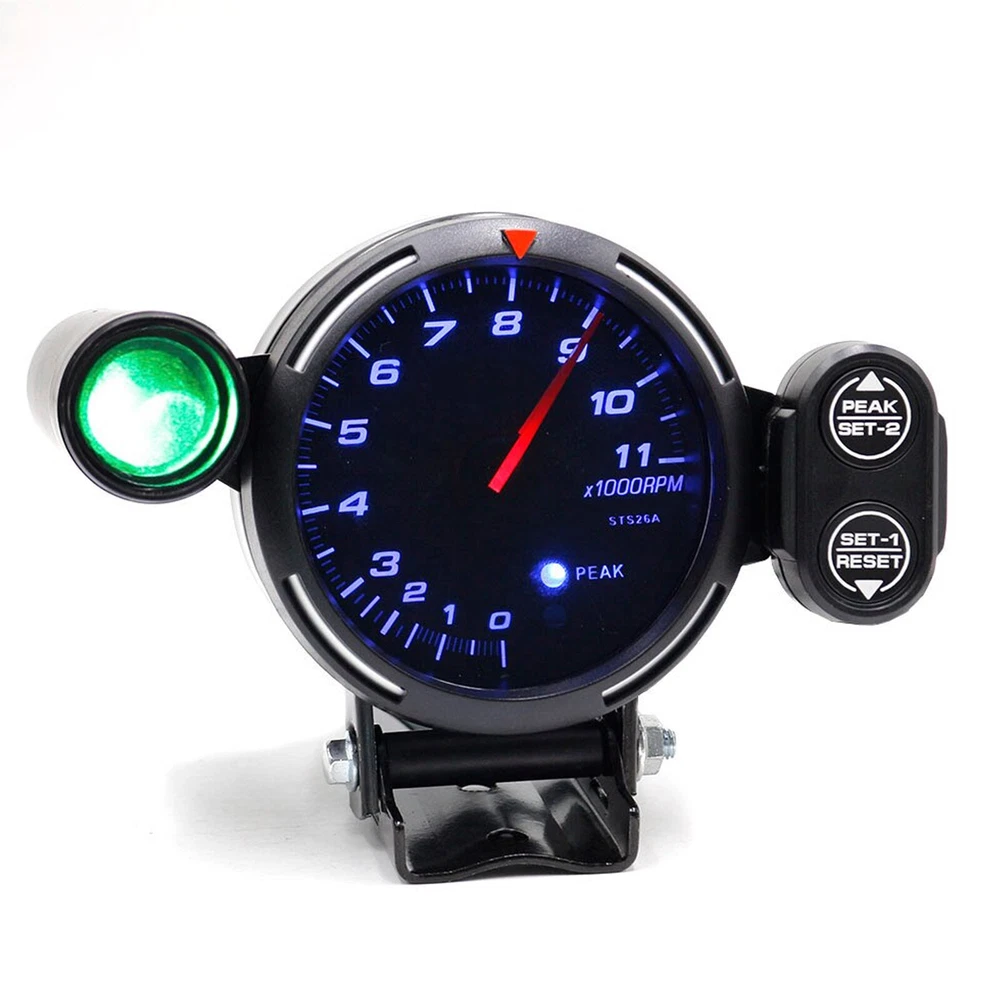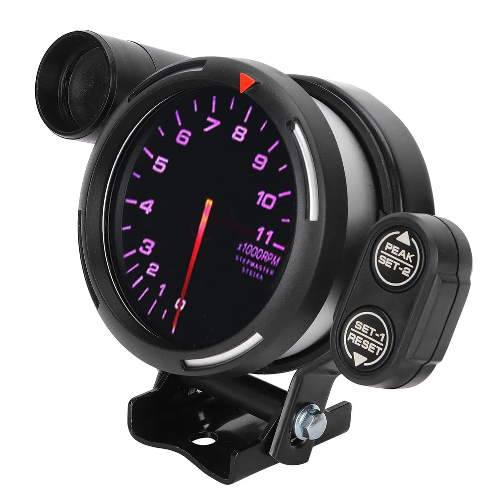 Features: 3.5" diameter, with black face, smoked lens and super bright LED background light. 0-11,000 RPM measurement, shift light RPM is adjustable. The stepping motor is sufficient for quick response of all sorts of professional motor sports. The gauge dial is invisible while the ignition switch is off. Once the ignition switch is turned on, a clear display appears by colored LED illumination. The gauge dial and the needle pointer provide high visibility. When the RPMs are exceeded, the warning LED blinks/lights up and the warning buzzer sounds. Peak memory function: the maximum RPM during driving can be stored and checked later. The gauge is clinched by using the exclusive mounting band and back base. Specifications: Color: Black + Silver Material: Aluminium Gauge Display: Blue LED Shift light: Green First and then turn Red Measurement Range: 0~11,000 RPM Powered By: 12V Switch Unit Length: Approx. 5cm / 2" Indicator Size: 7.62 * 3cm / 3 * 1.2in (L * W) Diameter: Approx. 88mm / 3.5" Gauge Weight: 137g / 4.82oz Package Size: 21.5 * 15.5 * 12.5cm / 8.46 * 6.1 * 4.92in (L * W * H) Package Weight: 681g / 24.03oz Package List: 1 * Tachometer Gauge 1 * Indicator 1 * Switch Unit 1 * Back Base 1 * Regular Position Bezel 1 * Attachment for Switch Unit 1 * Mounting Rubber 1 * Bundle of Line 2 * Pieces of Double Sided Tape 2 * Taping Screws 1 * User Manual(English) Note: About the problem of adjusting the pointer to zero:First, turn on the meter, wait for the pointer to go to the middle position, then turn off the power and turn it on again, the pointer will go to zero automatically.