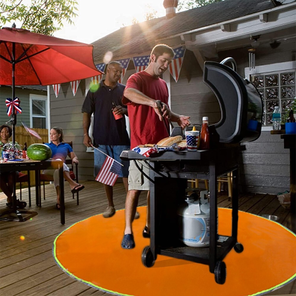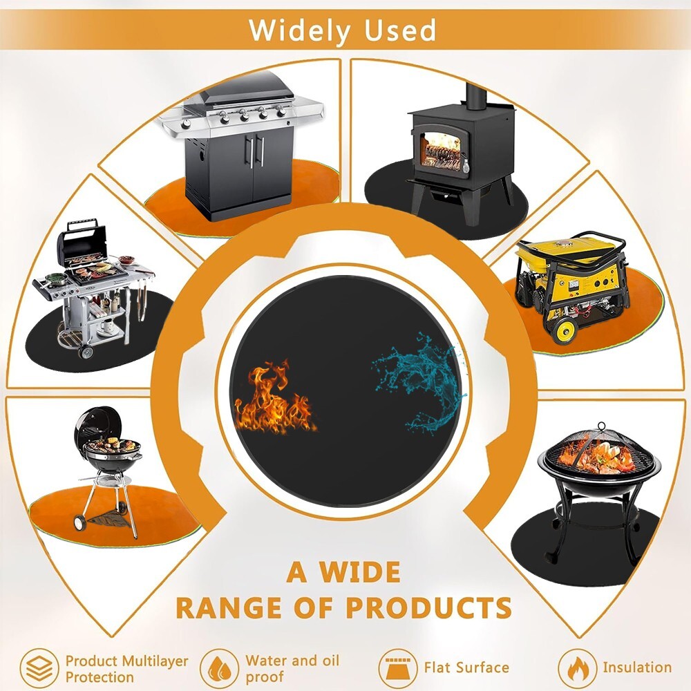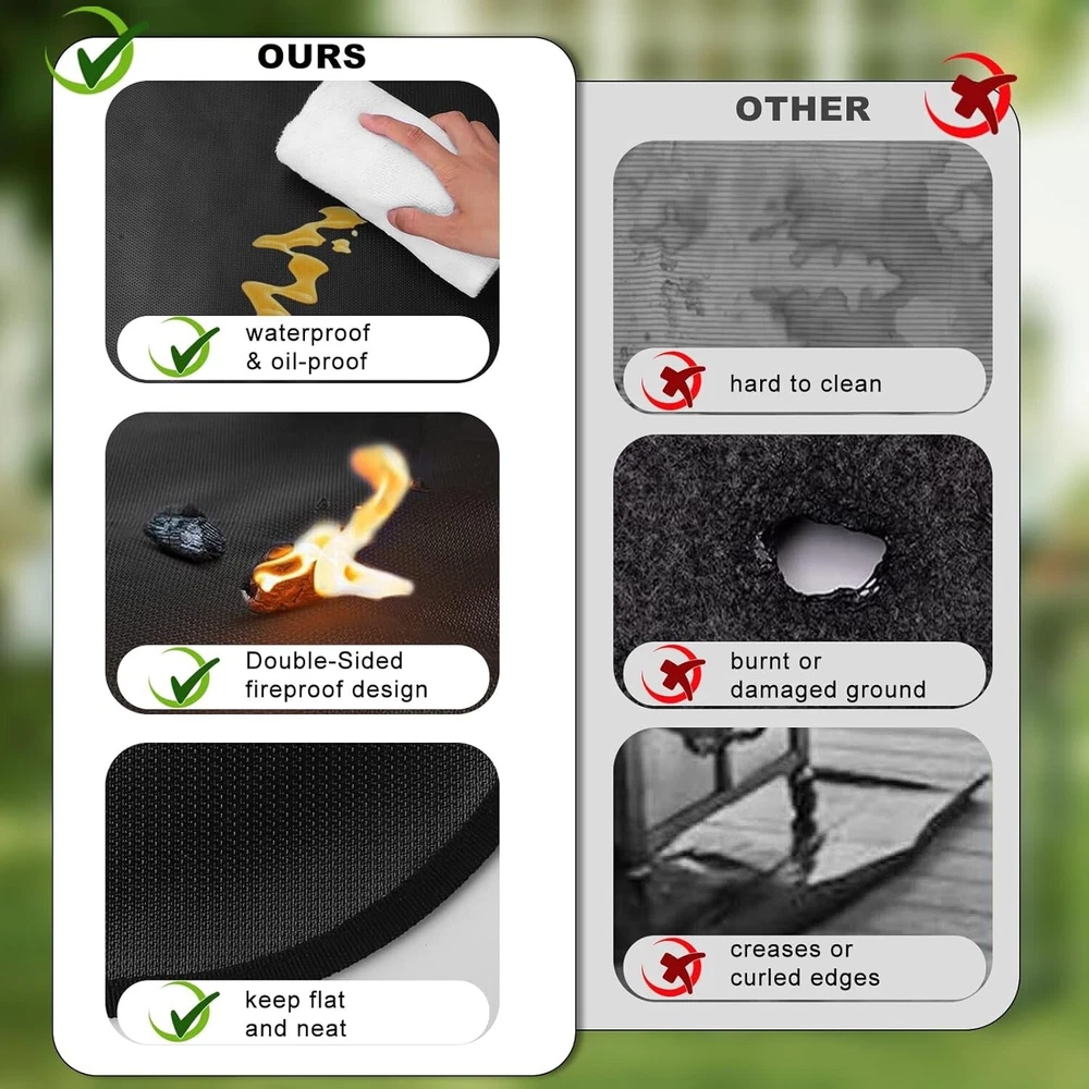 Fireproof and waterproof: Fireproof mat is made of silicone coated fiberglass which stands up the temperature up to 1000℉. Fire pit mat is not only fireproof but also waterproof, grease does not stick to them and they are easy to clean. It can perfectly protect your deck and lawn, allowing you to easily enjoy barbecue. Protects your deck and lawn: Charcoal fires can cause irreparable damage to deck and lawn, a fireproof, heat-resistant fire pit mat is perfect for protecting your patio,lawn,composite decking,grass,yard,wood, cement, brick, and decorative stone. It keeps your outdoor floor patio or deck safe from bursting embers and dripping grease. 35" diameter circle: perfect for fire pits, flat top gas, propane burners and charcoal grills of all shapes from 22" - 36". To ensure the best fit for your grill, please measure the width and depth of your grill before placing your order. Please do not place the heat source directly on the fire mat. Durable & Portable:The black silicone coated fireproof material not only makes it easy to remove grease stains from your mats, but it can be used multiple times. The collapsible design of the fire mat makes it easy to store and transport, so you can easily take it to parties, picnics, camping trips, barbecues or anywhere else. Its black design makes it a perfect match for any barbecue/deck combination.
