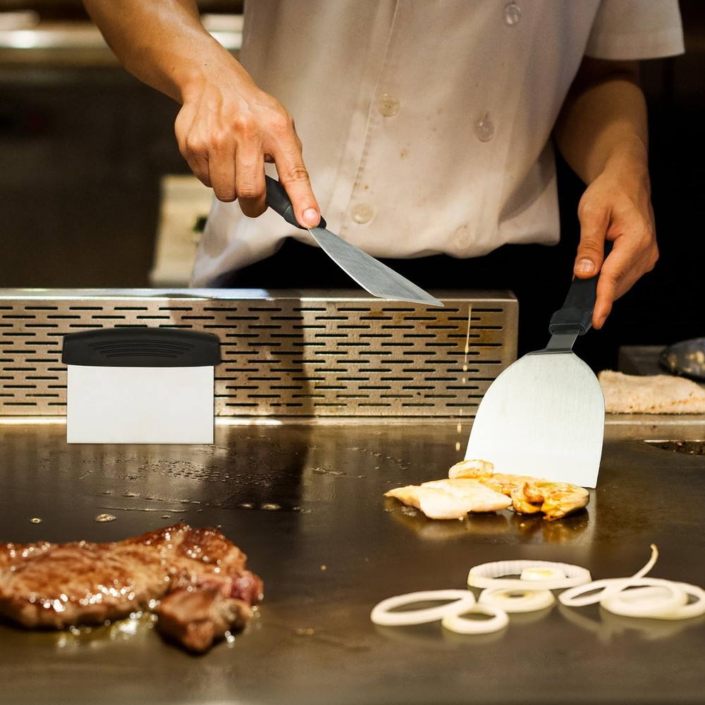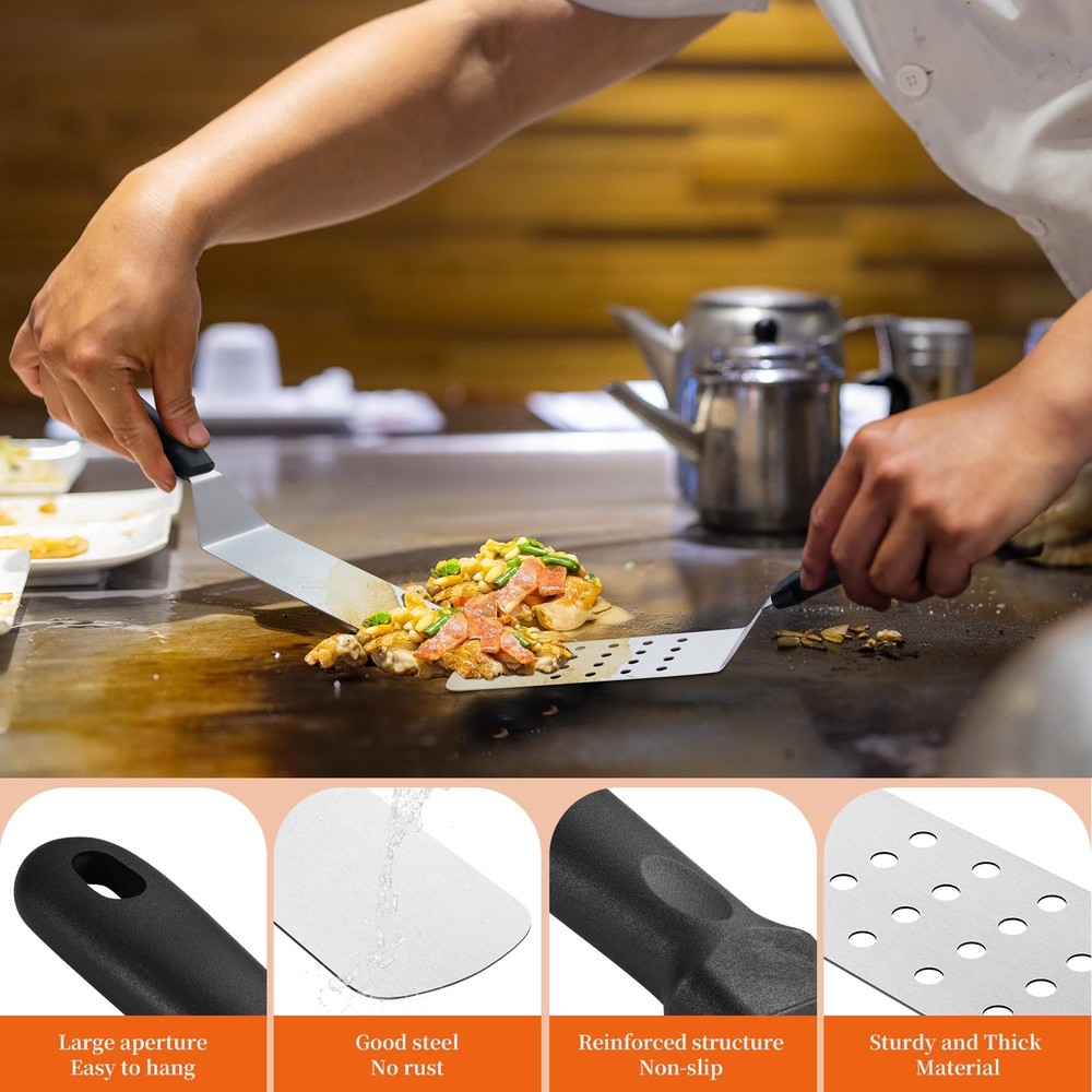 Griddle Accessories Kit,35 PCS BBQ Accessories for Blackstone and Camp Chef,Stainless Steel Flat Top Grill Accessories with Carry Bag,Griddle Dome Spatula Set with Burger Press for Outdoor 【Upgrated Professional Barbecue Tools Set】The Griddle Accessories Set has all the grill tools you need. It includes 1* Long Griddle Spatula, 1* Long Slotted Spatula, 1*Large Gurger Turner, 1*Griddle Chopper, 1*Griddle Spatula, 1*Slant Edge Scraper, 2*Basting Cover, 1*Griddle Press, 1*Carry Bag, 1*Long Grill Tong, 1*Basting Brush, 2* Squeeze Bottle, 1*Grill Thermometer, 1*Meat Knife, 1*Cleaning Brush, 2*Spice Shakers,2* Egg Rings,4* Corn Fork,10* Hanging Hooks. 【Premium Stainless Steel】Our Flat Top Griddle Accessories Set are made of high-quality stainless steel material, heat-resistant and rust-proof, safer and more durable than other barbecue accessories. So you can easy enjoy your grilling, camping or cooking without worry about your tools bending, breaking or rusting again. What is more, bbq set tools are easy to clean and dishwasher safe, more convenience. 【Ergonomic & Heat-Resistant Handles】Our flat-top griddle accessory set boasts ergonomic handles for adult comfort. Extended & heat-resistant, they secure your grip & block heat transfer for safe high-temp cooking. Dry after cleaning to prolong life. 【Essential Griddle Accessories Kit】Designed for the ultimate griddle chef, our comprehensive set includes a scraper, spatulas, and oil bottles - indispensable tools for all griddle tasks. Includes scraper, spatulas, oil bottles, & 12.6” basting cover. Grill press ensures even searing. Set streamlines kitchen tasks, enhances grilling. Covers all from burger flips to meat basting, making meal prep effortless. Elevate your grilling with this must-have kit. 【Easy to Storage & Carry】All of the grill gadgets are packed in a compact storage bag. Each tool can be placed in an orderly manner and better protected in the compact storage bag. Easy to store and can take it anywhere anytime to comping or picnic. Convenient hangers are provided for easy storage and food grade grill tools are easily cleaned with warm, soapy water. Now anyone,newbie or master griller can enjoy grilling much faster,easier,cleaner. 【Perfect Family Gift】This practical barbecue tools set is for most grills and suitable for indoor and outdoor cooking. It can meets all the essentials of your daily backyard barbecue and camping activities. Whether you are in the kitchen, your backyard, or out camping. Provide a portable, professional,fantanstic gift set for your famlily. You can enjoy BBQ time with your famlily and friend easily.