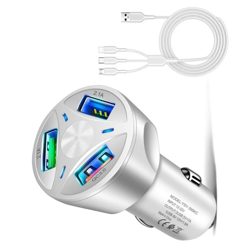 Features: USB 3-port car with fast charging cable splitter cord, to meet different needs. Newly 3 interfaces with sufficient output, safe and environmentally friendly. Multiple port, 3 USB working simultaneously, can multiple devices simultaneously. Build in intelligent chip, multiple protections, better protect your devices. Suitable for various digital products such as phones, tablets, laptops, MP4 players, cameras. Specifications: Material: ABS+Electronics Color: white, black(optional) Size: approx. 36x70mm/1.42x2.75inch Cable length: about 120cm/3.9ft Input: 12V-32V Output: 3USB 5V 7A ; 1USB 9V/12V 1.8A Power: 35W Package Includes: 1Pc 3-Port USB Car 1Pc Charging Cable note: Please allow 1-2cm errors due to manual measurement. Please allow for slight color differences due to different display resolution.