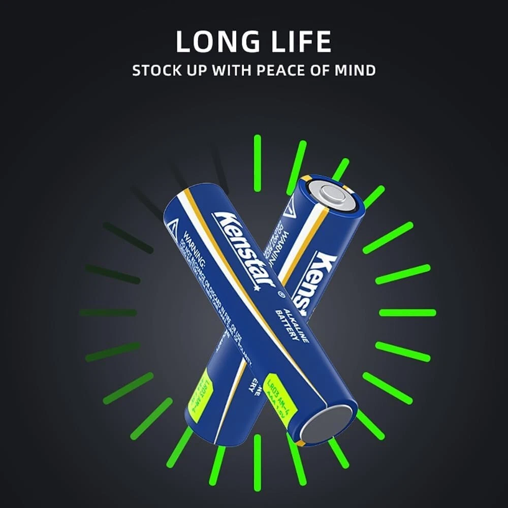 Kenstar AAA Batteries 36 Pack, High-Performance Alkaline Triple A Battery for Household and Office Devices, 1.5 Volt, Leakproof, Long Lasting, 10-Year Shelf Life Number of Batteries 36 AAA batteries required. (included) Battery Cell Composition Alkaline Recommended Uses For Product TV Remote Unit Count 36.0 Count About this item Reliable Power: Kenstar AAA alkaline batteries, offering a 870 mAh capacity and 10-year shelf life, provide long-lasting and dependable power for various devices like remotes, game controllers, and smart home gadgets. Premium Quality: These batteries feature a double-layer internal structure encased in stainless steel, ensuring 100% leakproof operation and added durability. Eco-Friendly Choice: Kenstar's 1.5V AAA batteries are free from mercury and cadmium, making them an environmentally conscious option for your family.