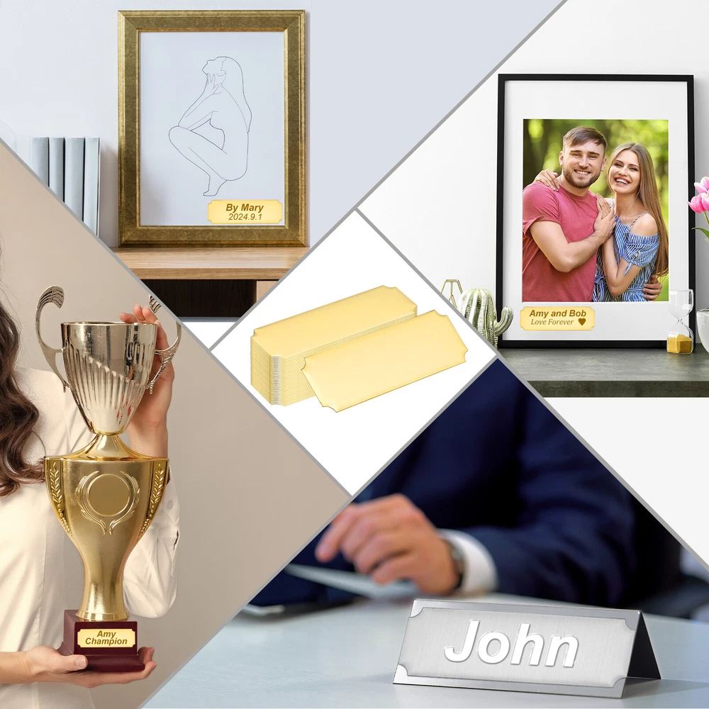 Document Our engraved nameplates are perfect for mounting on plaques, picture frames, sweaters, trophies, bags, display boxes, flag cases, and anything else.SpecificationMaterial: Stainless SteelColor: Gold ToneSize: 7.6 x 2.5 cm/3 x 1 Inch(L*W)Thickness: 0.4 mm/0.02 InchPacking List: 36 Pcs x Engraved NameplateAdvantageOur engraved nameplates are made of brushed stainless steel which is durable, stable, not easy to fade, rust, or break, and can be used for a long time. With a smooth surface, it will not scratch your skin.The right thickness makes the plate stronger and allows for deeper engraving. These elegant nameplates have a beautiful luster and a simple design. Suitable for various crafts to add brilliance.The protective film design can effectively prevent scratches. The adhesive backing design allows you to stick this nameplate anywhere without any tools and it can be firmly on the objects.InstructionPlace a metal workbench block underneath the blank stamping tags for better stamping.NOTE:1. There may be light scratches and blemishes due to shipping, but they can be polished.2. Only for laser engraving, not suitable for mechanical engraving.3. Please remove the protective film before use. 36 Pcs 3" x 1" Engraved Name Plate Picture Frame Label Art Tag, Gold Tone Our engraved nameplates are perfect for mounting on plaques, picture frames, sweaters, trophies, bags, display boxes, flag cases, and anything else. Specification Material: Stainless Steel Color: Gold Tone Size: 7.6 x 2.5 cm/3 x 1 Inch(L*W) Thickness: 0.4 mm/0.02 Inch Packing List: 36 Pcs x Engraved Nameplate Advantage Our engraved nameplates are made of brushed stainless steel which is durable, stable, not easy to fade, rust, or break, and can be used for a long time. With a smooth surface, it will not scratch your skin. The right thickness makes the plate stronger and allows for deeper engraving. These elegant nameplates have a beautiful luster and a simple design. Suitable for various crafts to add brilliance. The protective film design can effectively prevent scratches. The adhesive backing design allows you to stick this nameplate anywhere without any tools and it can be firmly on the objects. Instruction Place a metal workbench block underneath the blank stamping tags for better stamping. NOTE: 1. There may be light scratches and blemishes due to shipping, but they can be polished. 2. Only for laser engraving, not suitable for mechanical engraving. 3. Please remove the protective film before use. Hot Item Payment 1.We accept eBay payment . 2.Payment must be received within 7 business days of auction closing. Shipping 1.We ship to your eBay or Paypal address. Please make sure your eBay and Paypal address is correct before you pay. 2.Items will be shipped within 1-3 business day when we received payment. 3.Delivery time depends on destination and other factors. Description Policy 36 Pcs 3" x 1" Engraved Name Plate Picture Frame Label Art Tag, Gold Tone Our engraved nameplates are perfect for mounting on plaques, picture frames, sweaters, trophies, bags, display boxes, flag cases, and anything else. Specification Material: Stainless Steel Color: Gold Tone Size: 7.6 x 2.5 cm/3 x 1 Inch(L*W) Thickness: 0.4 mm/0.02 Inch Packing List: 36 Pcs x Engraved Nameplate Advantage Our engraved nameplates are made of brushed stainless steel which is durable, stable, not easy to fade, rust, or break, and can be used for a long time. With a smooth surface, it will not scratch your skin. The right thickness makes the plate stronger and allows for deeper engraving. These elegant nameplates have a beautiful luster and a simple design. Suitable for various crafts to add brilliance. The protective film design can effectively prevent scratches. The adhesive backing design allows you to stick this nameplate anywhere without any tools and it can be firmly on the objects. Instruction Place a metal workbench block underneath the blank stamping tags for better stamping. NOTE: 1. There may be light scratches and blemishes due to shipping, but they can be polished. 2. Only for laser engraving, not suitable for mechanical engraving. 3. Please remove the protective film before use. Hot Item Payment 1.We accept eBay payment . 2.Payment must be received within 7 business days of auction closing. Shipping 1.We ship to your eBay or Paypal address. Please make sure your eBay and Paypal address is correct before you pay. 2.Items will be shipped within 1-3 business day when we received payment. 3.Delivery time depends on destination and other factors.