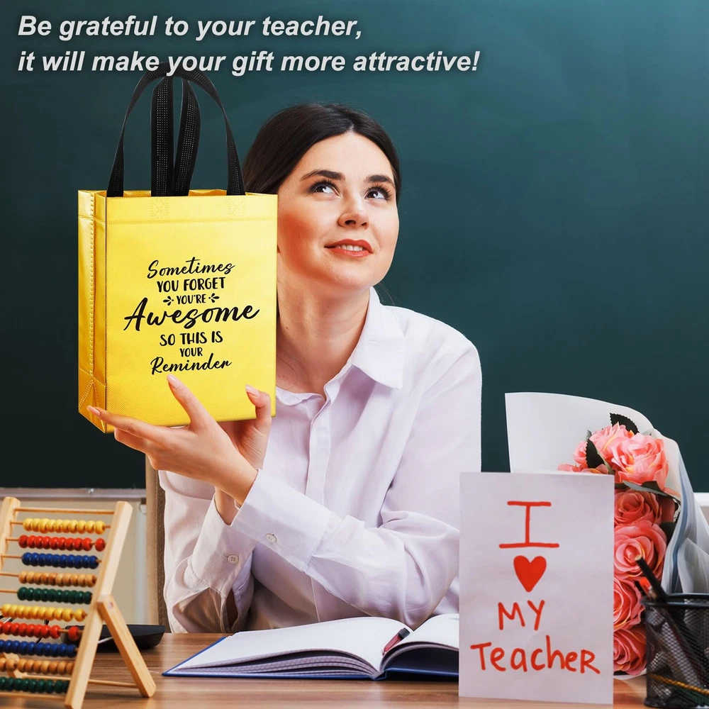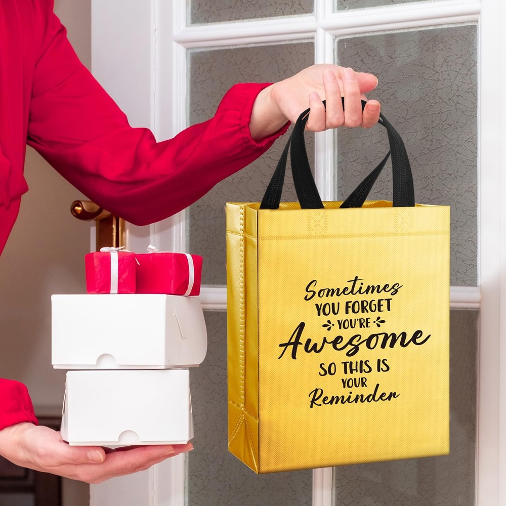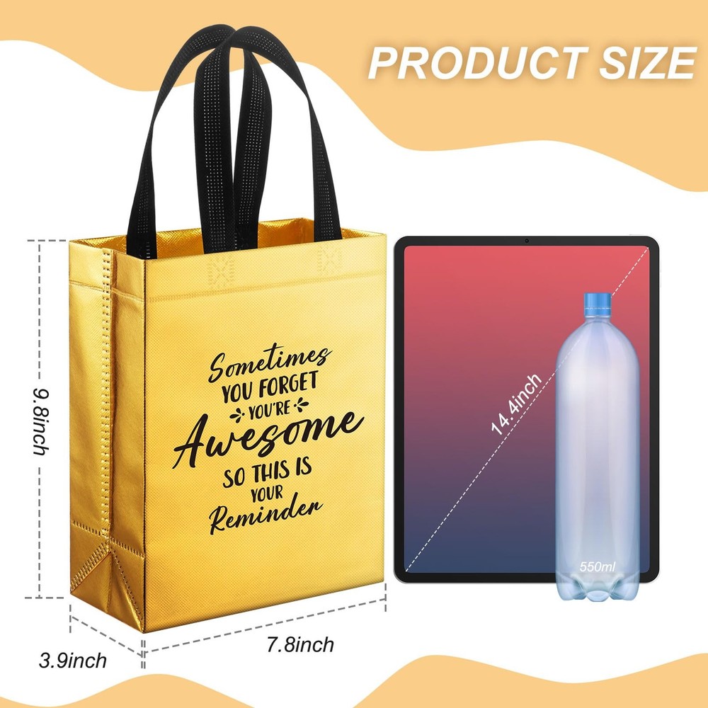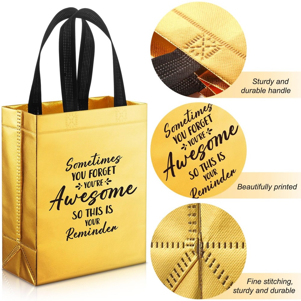 .. 36 Pcs Gift Bags - The package includes 36 pcs gold glossy reusable gift bags, the bag size is 10x8x4 inches(25x20x10cm); Sufficient quantity and suitable size, perfect as a gift bag Printed with Inspiring Words - Each gold gift bag is printed with the words'sometimes you forget you're awesome, so this is your reminder', unique design as a gift bag that deeply influences the recipient Non-woven Fabrics Material - These bling gold bags are Manufactured with high quality non-woven fabric,These frosted bags are sturdy and the soft handles make these bags easy and comfortable to carry Shiny Surface - The surface is shiny and bling, the gold color of the gift bag gives it a luxurious and high-end look, perfect for making your gifts look more special Versatility - These bags can be used as gift bags, shopping bags, promotional bags, handbags and more, suitable as birthday gift bag, thank you gift bag, employee gift bag, coworker gift bag, teacher gift bag, colleague gift bag, volunteer gift bag, women gift bag, nurse gift bag, students gift bag