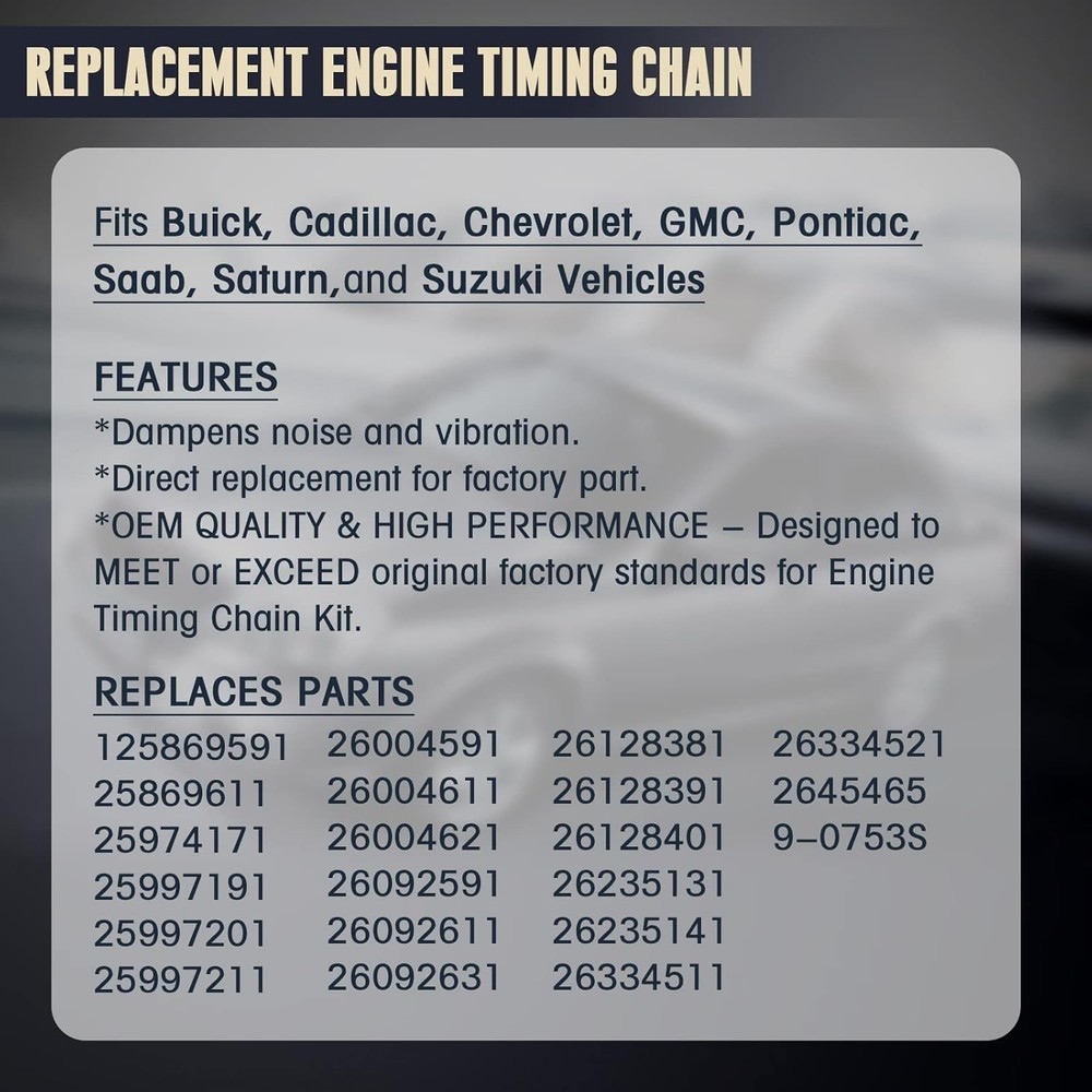 3.6 Timing Chain Kit w/Chain Guide Tensioner Sprocket for 2.8L 3.0L 3.6L Chevy Equinox Malibu Traverse GMC Acadia Cadillac CTS SRX Buick Enclave V6 Engine Engine Timing Set Replace # 9-0753S 9-0753sx 3.6 Timing Chain Kit, also known as Timing Kit. It's a major component in your engine. If you have a rattling noise from front of engine, or noisy timing chains, or timing related fault codes in ECU, and all problems related to timing chains, tensioners, phasers, or guides, you may consider replace you Engine Timing Chain Set with these 【COMPATIBLE】:This 2.8 3.0 3.6 Engine Timing Chain Kit fits for Buick Allure/Enclave/LaCrosse,Cadillac ATS/CTS/SRX/STS/XTS,Chevrolet Camaro/Caprice/Captiva Sport/Colorado/Equinox/Impala/Malibu/Traverse,GMC Acadia/Canyon/Terrain,Pontiac G6/G8/Torrent,Saab 9-3/9-4X/9-5; More detail, please check below description 【REPLACE PART】1255861,1262514,1263352,12559919,12559920,12559921,12586959,12597417,12600459,12600462,12609259,12609261,12609263,12612838,12612839,12612840,12623513,12633451,12645465,126600461,9-0753S; Direct replacement for the factory engine timing chain on your vehicle.According to the original factory specifications.Perfect match for the original car 【IMPORTANT NOTE】: Before placing your order, please check the fitment details in the Amazon Fitment Filter System (located in the top left corner) or use your vehicle’s year, make, and model to confirm that our 2.8,3.0,3.6 Engine Timing Chain Kit is compatible with your car You will receive 1 set of 3.6 Timing Chain Kit.Our automotive replacement engine timing part sets & kits undergo rigorous testing to ensure your engine operates smoothly for years to come › See more product details 3.6 Timing Chain Kit undergoes rigorous testing to ensure your engine runs smoothly for years to come. With reliable quality and high cost-performance, our 3.6L Timing Chain Kit has been consistently recommended by Amazon over the years. Replace Part Number:1255861,1262514,1263352,12559919,12559920,12559921,12586959,12597417,12600459,12600462,12609259,12609261,12609263,12612838,12612839,12612840,12623513,12633451,12645465,126600461,9-0753S 3.6 timing chain kit Fitment Model/Year: 2008 Buick Allure / 2010 Buick Allure / 2010 Buick Allure / 2008 Buick Enclave / 2009 Buick Enclave / 2010 Buick Enclave / 2011 Buick Enclave / 2012 Buick Enclave / 2013 Buick Enclave / 2014 Buick Enclave / 2015 Buick Enclave / 2007 Buick LaCrosse / 2008 Buick LaCrosse / 2010 Buick LaCrosse / 2011 Buick LaCrosse / 2012 Buick LaCrosse / 2013 Buick LaCrosse / 2014 Buick LaCrosse / 2015 Buick LaCrosse / 2013 Cadillac ATS / 2014 Cadillac ATS / 2015 Cadillac ATS / 2007 Cadillac CTS / 2008 Cadillac CTS / 2009 Cadillac CTS / 2010 Cadillac CTS / 2011 Cadillac CTS / 2012 Cadillac CTS / 2013 Cadillac CTS / 2014 Cadillac CTS / 2015 Cadillac CTS / 2010 Cadillac CTS / 2011 Cadillac CTS / 2012 Cadillac CTS / 2013 Cadillac CTS / 2014 Cadillac CTS / 2007 Cadillac SRX / 2008 Cadillac SRX / 2009 Cadillac SRX / 2012 Cadillac SRX / 2013 Cadillac SRX / 2014 Cadillac SRX / 2015 Cadillac SRX / 2010 Cadillac SRX / 2011 Cadillac SRX / 2007 Cadillac STS / 2008 Cadillac STS / 2009 Cadillac STS / 2010 Cadillac STS / 2011 Cadillac STS / 2013 Cadillac XTS / 2014 Cadillac XTS / 2015 Cadillac XTS / 2010 Chevy Camaro / 2011 Chevy Camaro / 2012 Chevy Camaro / 2013 Chevy Camaro / 2014 Chevy Camaro / 2015 Chevy Camaro / 2012 Chevy Caprice / 2013 Chevy Caprice / 2014 Chevy Caprice / 2015 Chevy Caprice / 2011 Chevy Captiva Sport / 2012 Chevy Captiva Sport / 2013 Chevy Captiva Sport / 2014 Chevy Captiva Sport / 2015 Chevy Captiva Sport / 2010 Chevy Captiva Sport / 2008 Chevy Captiva Sport / 2009 Chevy Captiva Sport / 2015 Chevy Colorado / 2008 Chevy Equinox / 2009 Chevy Equinox / 2013 Chevy Equinox / 2014 Chevy Equinox / 2015 Chevy Equinox / 2010 Chevy Equinox / 2011 Chevy Equinox / 2012 Chevy Equinox / 2012 Chevy Impala / 2013 Chevy Impala / 2014 Chevy Impala / 2015 Chevy Impala / 2008 Chevy Malibu / 2009 Chevy Malibu / 2010 Chevy Malibu / 2011 Chevy Malibu / 2012 Chevy Malibu / 2009 Chevy Traverse / 2010 Chevy Traverse / 2011 Chevy Traverse / 2012 Chevy Traverse / 2013 Chevy Traverse / 2014 Chevy Traverse / 2015 Chevy Traverse / 2007 GMC Acadia / 2008 GMC Acadia / 2009 GMC Acadia / 2010 GMC Acadia / 2011 GMC Acadia / 2012 GMC Acadia / 2013 GMC Acadia / 2014 GMC Acadia / 2015 GMC Acadia / 2011 GMC Acadia / 2012 GMC Acadia / 2013 GMC Acadia / 2014 GMC Acadia / 2015 GMC Acadia / 2015 GMC Canyon / 2013 GMC Terrain / 2014 GMC Terrain / 2015 GMC Terrain / 2013 GMC Terrain / 2014 GMC Terrain / 2015 GMC Terrain / 2010 GMC Terrain / 2011 GMC Terrain / 2012 GMC Terrain / 2011 GMC Terrain / 2012 GMC Terrain / 2007 Pontiac G6 / 2008 Pontiac G6 / 2009 Pontiac G6 / 2008 Pontiac G8 / 2009 Pontiac G8 / 2008 Pontiac Torrent / 2009 Pontiac Torrent / 2006 Saab 9-3 / 2007 Saab 9-3 / 2008 Saab 9-3 / 2009 Saab 9-3 / 2011 Saab 9-4X / 2010 Saab 9-5 / 2011 Saab 9-5 / No Additional Cost: You pay nothing for repairs – parts, labor, and shipping included. Coverage: Plan starts on the date of purchase. Drops, spills and cracked screens due to normal use covered for portable products and power surges covered from day one. Malfunctions covered after the manufacturer's warranty. Easy Claims Process: File a claim anytime online or by phone. Most claims approved within minutes. We will send you an e-gift card for the purchase price of your covered product. In some instances, we will replace or repair it. Product Eligibility: Plan must be purchased with a product or within 30 days of the product purchase. Pre-existing conditions are not covered. Terms & Details: More information about this protection plan is available within the “Product guides and documents” section. Simply click “User Guide” for more info. Terms & Conditions will be available in Your Orders on Amazon. Asurion will also email your plan confirmation with Terms & Conditions to the address associated with your Amazon account wit