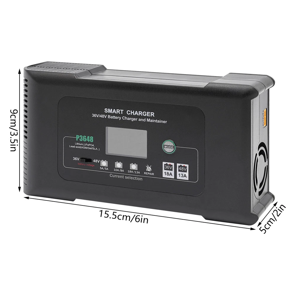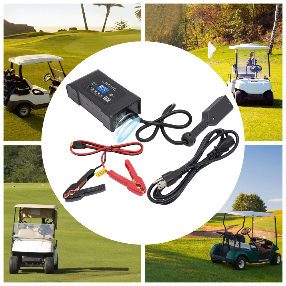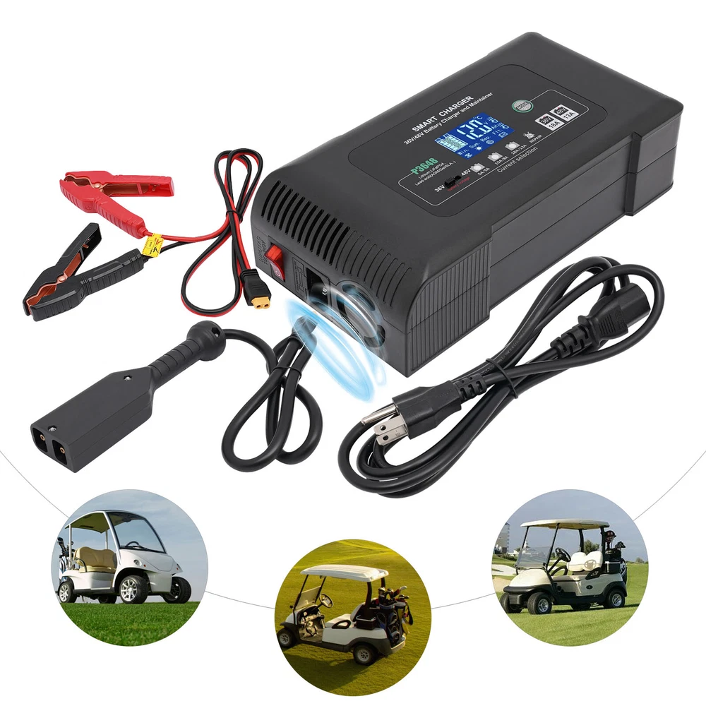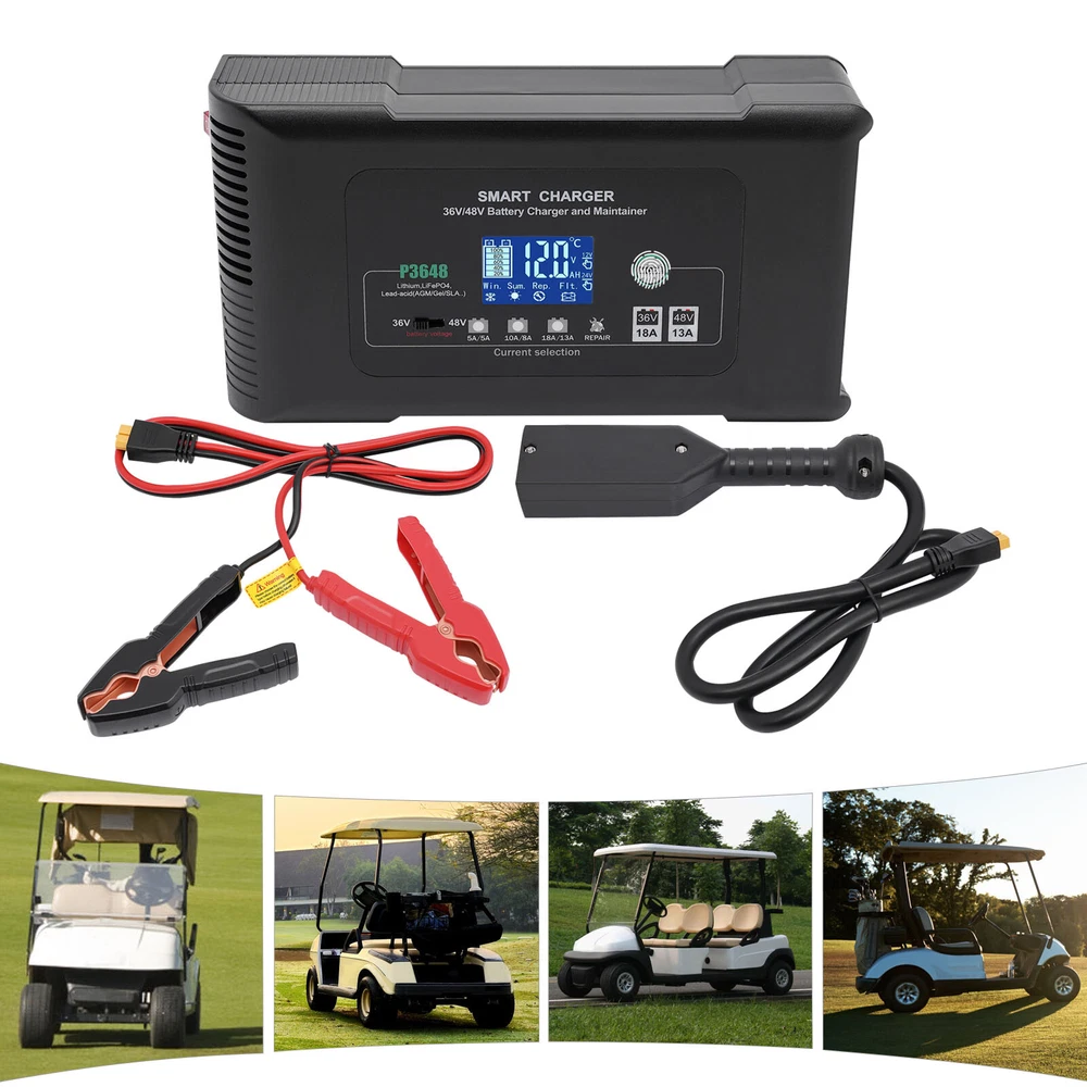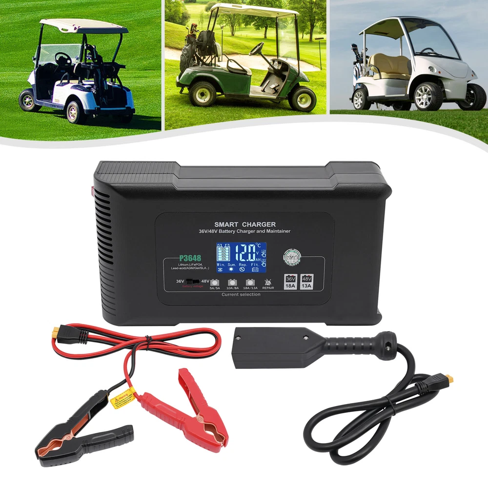 Description This smart charger is engineered to deliver exceptional performance and reliability, making it an essential accessory for any golf enthusiast. Designed with several safety protection functions, a unique repairing mode, a user-friendly touch screen, and excellent heat dissipation performance, our charger can upgrade your charging experience, giving you a piece of mind during the charging process. Key Features High-quality Material: Made of high-quality ABS, this charger is impact-resistant, corrosion-resistant, safe, and fireproof, ensuring long-lasting durability and reliability. Intelligent Charger: The product starts charging after you manually select the charging voltage (36/48V) and charging current (36V 5A, 48V 5A/36V 10A, 48V 8A/36V 18A, 48V 13A). It automatical 36 Volt Golf Cart Charger?Car Battery Charger 36V 18A For Car Golf Cart Description This smart charger is engineered to deliver exceptional performance and reliability, making it an essential accessory for any golf enthusiast. Designed with several safety protection functions, a unique repairing mode, a user-friendly touch screen, and excellent heat dissipation performance, our charger can upgrade your charging experience, giving you a piece of mind during the charging process. Key Features High-quality Material: Made of high-quality ABS, this charger is impact-resistant, corrosion-resistant, safe, and fireproof, ensuring long-lasting durability and reliability. Intelligent Charger: The product starts charging after you manually select the charging voltage (36/48V) and charging current (36V 5A, 48V 5A/36V 10A, 48V 8A/36V 18A, 48V 13A). It automatically enters into trickle charging when full, detects the sulfate layer and acid layer, uses the latest pulse repair function to restore lost performance, and extends the battery life of weak, old, and idle batteries. Easy to Operate: With a large digital screen and touchscreen buttons, it intuitively monitors charging and battery status, and allows you to adjust the voltage and current more conveniently. Efficient Charging: With a max. power output of 36V 18A/48V 13A, this charger ensures quick and efficient charging for your golf cart, allowing you to spend less time waiting and more time on the green. Excellent Heat Dissipation Performance: Multiple heat-sink holes and a built-in cooling fan help it dissipate quickly and extend its service life. High Safety: Equipped with advanced safety protection, including protection from overheating, over-current, overcharge, short circuit, low voltage, and reverse connection, the product is safe to use, providing peace of mind during the charging process. Sleek Design: The black finish and modern design make this charger not only functional but also visually appealing. Portable Design: The compact size (9*5*3in) and lightweight (4.3 lbs) allow you to carry it to charge the battery anywhere and anytime. Protective Package: To prevent the product from being damaged during transportation, we packed it with an anti-collision air column bag to protect your products to the maximum extent possible. In addition, there is a sponge inside the packaging box to provide further protection. Details Alligator Clips: They help connect the positive and negative terminals of the battery better and faster while keeping the connection stable. Long Power Cord: The 6.6ft long power cord provides you more convenient charging service. Application It is suitable for charging Lithium, LiFePO4, and Lead-acid batteries (AGMGEL, SLA, Flooded, WET, EFB, etc.). Specifications Model: P3648 Material: ABS Color: Black Style: Modern Shape: Rectangular Mount Type: Free Standing Assembly Required: Yes Battery Type: Lithium, LiFePO4, Lead-acid(AGM, GEL, SLA, Flooded, WET, EFB, etc...) Plug Type: US Standard AC Input Voltage: 100-240V~50/60Hz Output Voltage: 36V/48V Output Current: 36V Max 18A/48V Max 13A Minimum Start Volt: 26V Current Selection: 36V 5A, 48V 5A/36V 10A, 48V 8A/36V 18A, 48V 13A Power Cord Length: 2m/6.6ft Gross Weight: 2.05kg/4.5lbs Net Weight: 1.95kg/4.3lbs Product Size: 23*12.5*7cm/9*5*3in Package Size: 25.5*23*13cm /10*9*5in Package Included 1* Smart Charger 1* Power Cord 1* Cable With Two Alligator Clips 2* Cable Lugs 1* Adapter 1* English Manual Notes Please read the operating manual completely before use, and pay particular attention to the safety instructions included. Please note that noise during charging is a normal phenomenon as there is an internal cooling fan running. Please note that the repairing mode can not repair severely damaged batteries and is not for Lithium and LiFePO4 batteries. The charging time depends on the battery capacity. Please pay attention to the high voltage and danger in the charger. Non-professional maintenance personnel are not allowed to open the charger by themselves. Keep away from children and do not leave the battery unattended during charging. Be sure to check the polarity of the connector/cable before connecting it to the battery pack. After the battery is fully charged, please first unplug the charger power plug, and then unplug the charger output plug. During charging, the charger and battery shall be used in an indoor environment with good ventilation and heat dissipation. It is strictly prohibited to use them in a humid, high temperature, direct sunlight, and flammable and explosive gas environment. Please do not block the air inlet and outlet or cover the charger. Some space shall be reserved at the air inlet side and air outlet side. Please allow the slight color difference caused by the shooting light and 1-3cm error due to manual measurement, and make sure you do not mind before you order. Payment Delivery details Terms of sales About us Contact us Payment We accept ebay payment 。 Fees such as import duties, taxes are not included in the item price or shipping costs. These charges are the buyer's responsibility. Delivery details Shipping: 2-9 working days to: USA Terms of sales We maintain high s