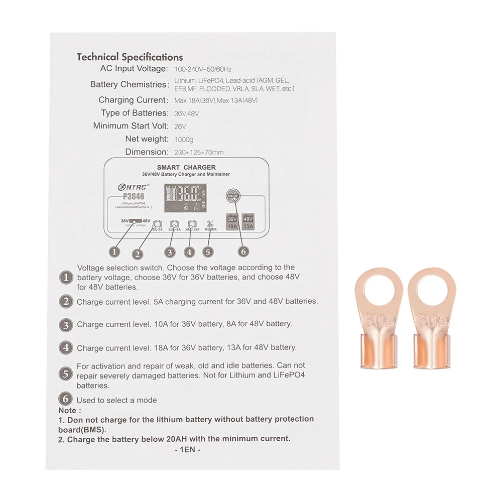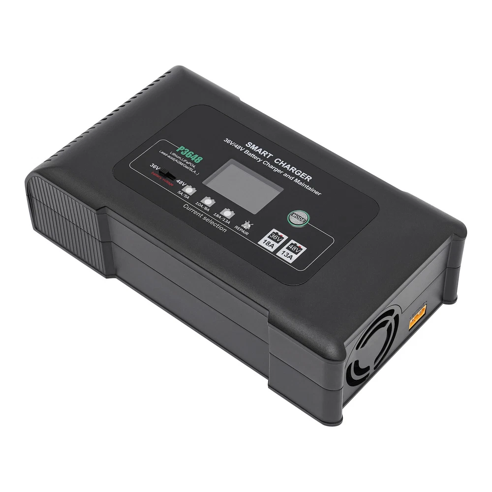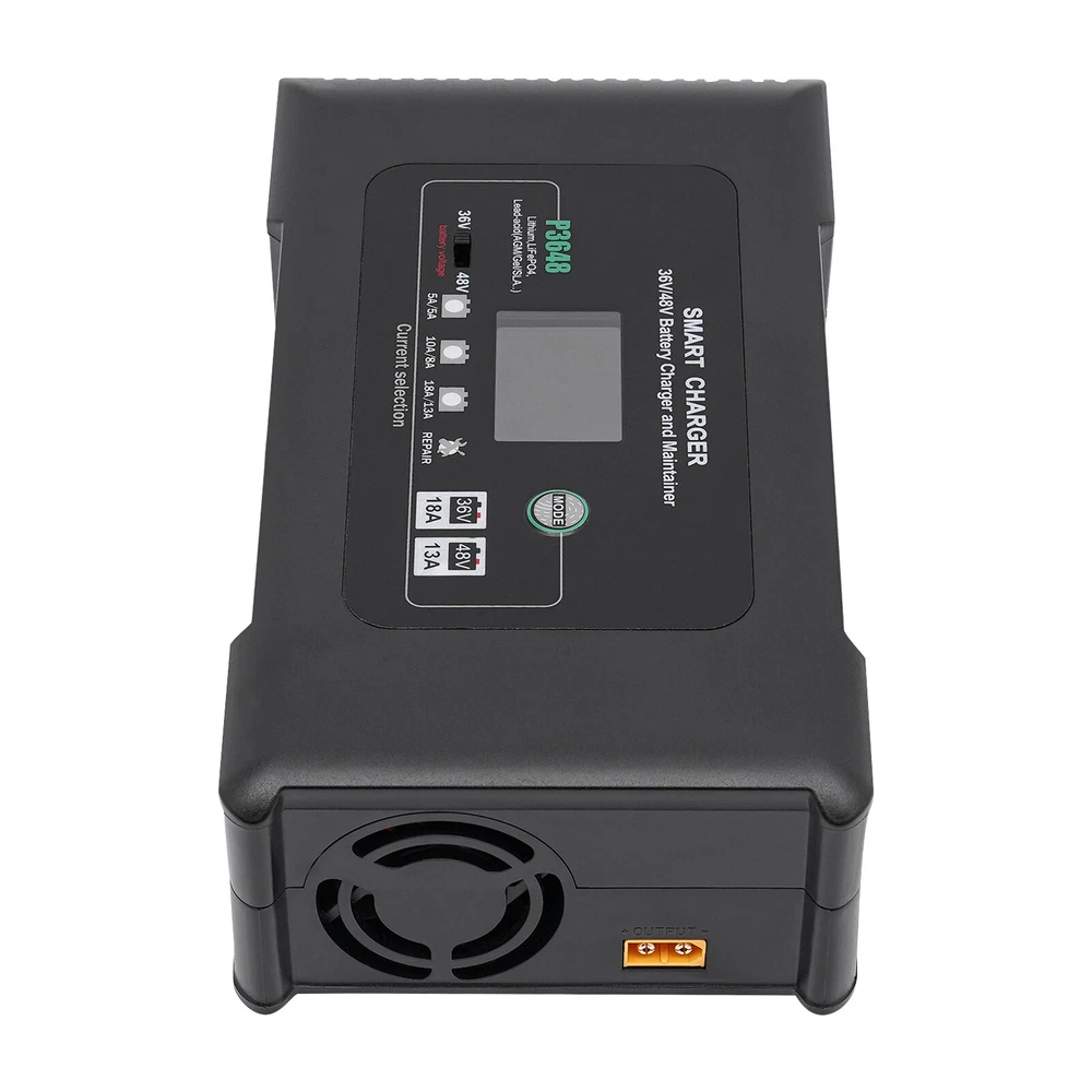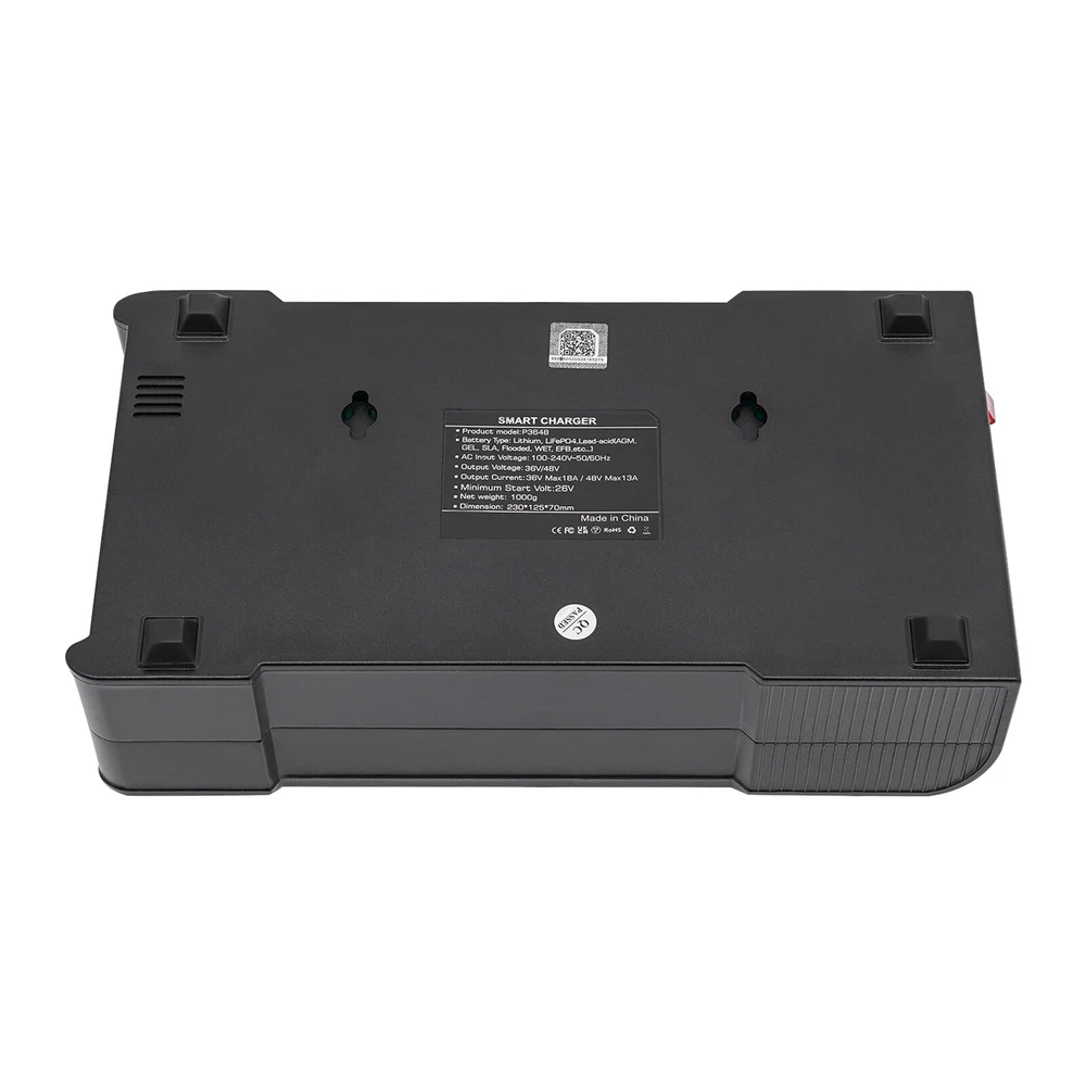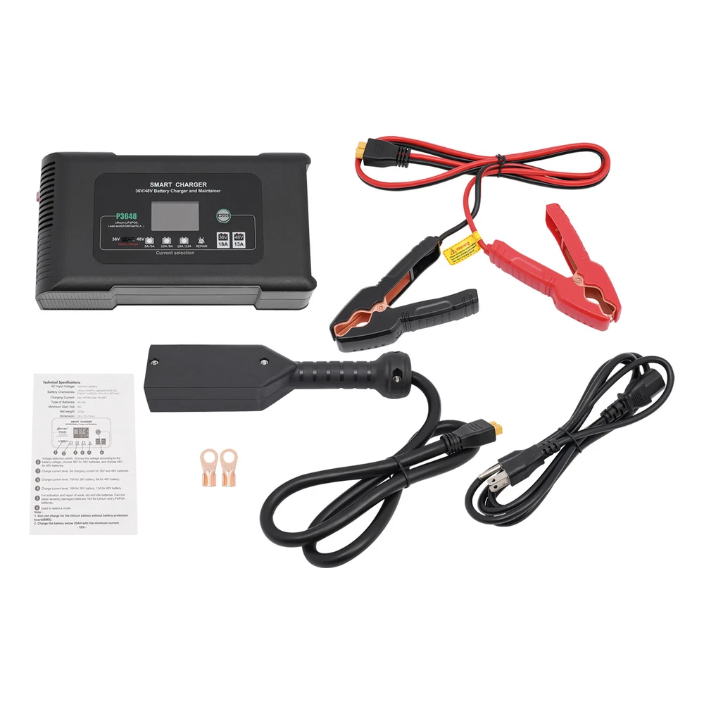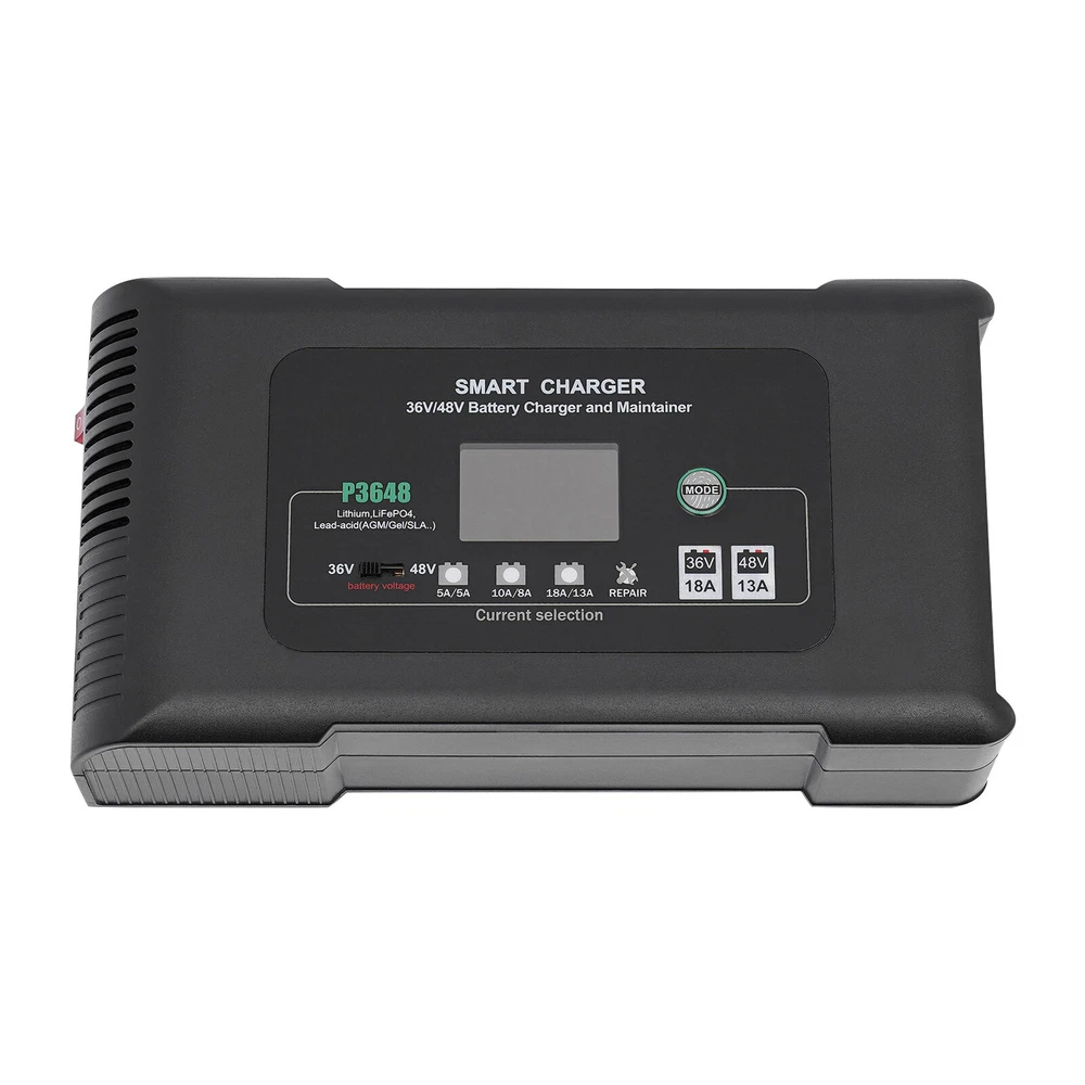 Description This smart charger is engineered to deliver exceptional performance and reliability, making it an essential accessory for any golf enthusiast. Designed with several safety protection functions, a unique repairing mode, a user-friendly touch screen, and excellent heat dissipation performance, our charger can upgrade your charging experience, giving you a piece of mind during the charging process. Key Features High-quality Material: Made of high-quality ABS, this charger is impact-resistant, corrosion-resistant, safe, and fireproof, ensuring long-lasting durability and reliability. Intelligent Charger: The product starts charging after you manually select the charging voltage (36/48V) and charging current (36V 5A, 48V 5A/36V 10A, 48V 8A/36V 18A, 48V 13A). It automatical 36 Volt Golf Cart Charger?Car Battery Charger 36V 18A For Car Golf Cart Description This smart charger is engineered to deliver exceptional performance and reliability, making it an essential accessory for any golf enthusiast. Designed with several safety protection functions, a unique repairing mode, a user-friendly touch screen, and excellent heat dissipation performance, our charger can upgrade your charging experience, giving you a piece of mind during the charging process. Key Features High-quality Material: Made of high-quality ABS, this charger is impact-resistant, corrosion-resistant, safe, and fireproof, ensuring long-lasting durability and reliability. Intelligent Charger: The product starts charging after you manually select the charging voltage (36/48V) and charging current (36V 5A, 48V 5A/36V 10A, 48V 8A/36V 18A, 48V 13A). It automatically enters into trickle charging when full, detects the sulfate layer and acid layer, uses the latest pulse repair function to restore lost performance, and extends the battery life of weak, old, and idle batteries. Easy to Operate: With a large digital screen and touchscreen buttons, it intuitively monitors charging and battery status, and allows you to adjust the voltage and current more conveniently. Efficient Charging: With a max. power output of 36V 18A/48V 13A, this charger ensures quick and efficient charging for your golf cart, allowing you to spend less time waiting and more time on the green. Excellent Heat Dissipation Performance: Multiple heat-sink holes and a built-in cooling fan help it dissipate quickly and extend its service life. High Safety: Equipped with advanced safety protection, including protection from overheating, over-current, overcharge, short circuit, low voltage, and reverse connection, the product is safe to use, providing peace of mind during the charging process. Sleek Design: The black finish and modern design make this charger not only functional but also visually appealing. Portable Design: The compact size (9*5*3in) and lightweight (4.3 lbs) allow you to carry it to charge the battery anywhere and anytime. Protective Package: To prevent the product from being damaged during transportation, we packed it with an anti-collision air column bag to protect your products to the maximum extent possible. In addition, there is a sponge inside the packaging box to provide further protection. Details Alligator Clips: They help connect the positive and negative terminals of the battery better and faster while keeping the connection stable. Long Power Cord: The 6.6ft long power cord provides you more convenient charging service. Application It is suitable for charging Lithium, LiFePO4, and Lead-acid batteries (AGMGEL, SLA, Flooded, WET, EFB, etc.). Specifications Model: P3648 Material: ABS Color: Black Style: Modern Shape: Rectangular Mount Type: Free Standing Assembly Required: Yes Battery Type: Lithium, LiFePO4, Lead-acid(AGM, GEL, SLA, Flooded, WET, EFB, etc...) Plug Type: US Standard AC Input Voltage: 100-240V~50/60Hz Output Voltage: 36V/48V Output Current: 36V Max 18A/48V Max 13A Minimum Start Volt: 26V Current Selection: 36V 5A, 48V 5A/36V 10A, 48V 8A/36V 18A, 48V 13A Power Cord Length: 2m/6.6ft Gross Weight: 2.05kg/4.5lbs Net Weight: 1.95kg/4.3lbs Product Size: 23*12.5*7cm/9*5*3in Package Size: 25.5*23*13cm /10*9*5in Package Included 1* Smart Charger 1* Power Cord 1* Cable With Two Alligator Clips 2* Cable Lugs 1* Adapter 1* English Manual Notes Please read the operating manual completely before use, and pay particular attention to the safety instructions included. Please note that noise during charging is a normal phenomenon as there is an internal cooling fan running. Please note that the repairing mode can not repair severely damaged batteries and is not for Lithium and LiFePO4 batteries. The charging time depends on the battery capacity. Please pay attention to the high voltage and danger in the charger. Non-professional maintenance personnel are not allowed to open the charger by themselves. Keep away from children and do not leave the battery unattended during charging. Be sure to check the polarity of the connector/cable before connecting it to the battery pack. After the battery is fully charged, please first unplug the charger power plug, and then unplug the charger output plug. During charging, the charger and battery shall be used in an indoor environment with good ventilation and heat dissipation. It is strictly prohibited to use them in a humid, high temperature, direct sunlight, and flammable and explosive gas environment. Please do not block the air inlet and outlet or cover the charger. Some space shall be reserved at the air inlet side and air outlet side. Please allow the slight color difference caused by the shooting light and 1-3cm error due to manual measurement, and make sure you do not mind before you order. Payment Delivery details Terms of sales About us Contact us Payment We accept ebay payment 。 Fees such as import duties, taxes are not included in the item price or shipping costs. These charges are the buyer's responsibility. Delivery details Shipping: 2-9 working days to: USA Terms of sales We maintain high s