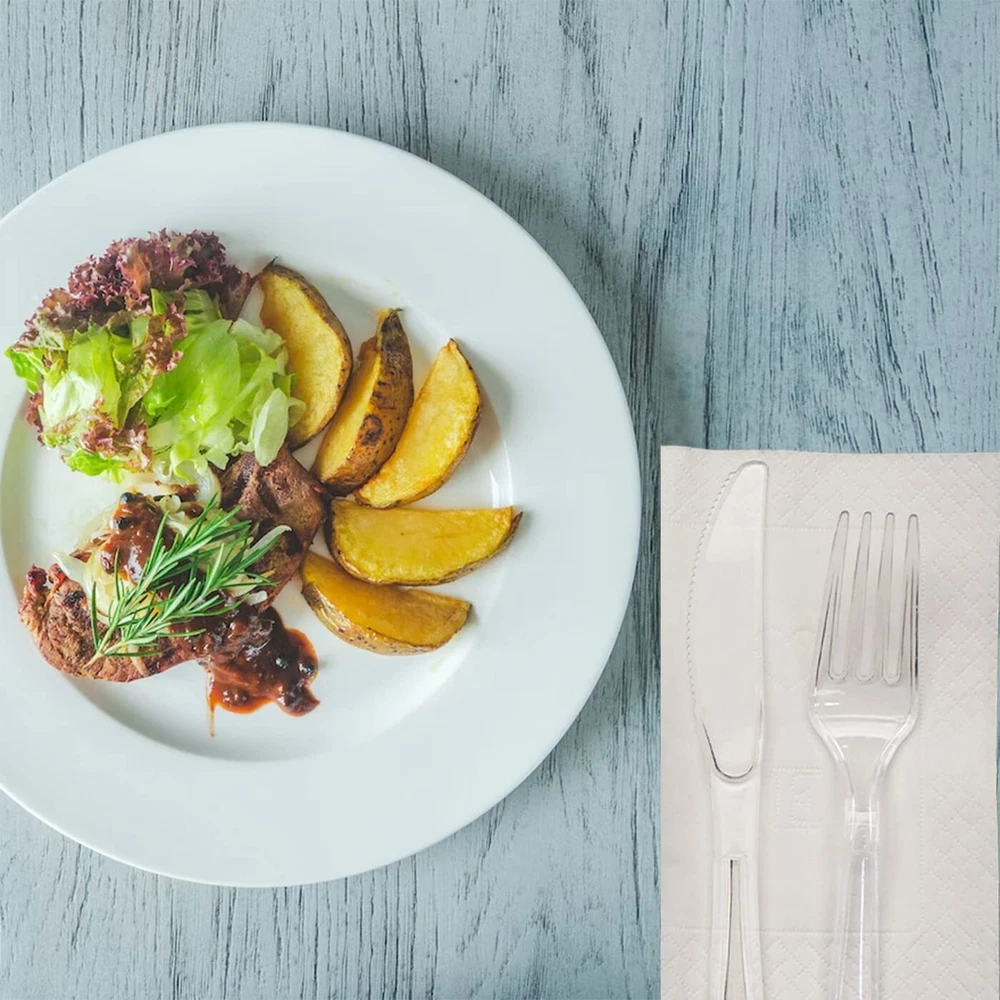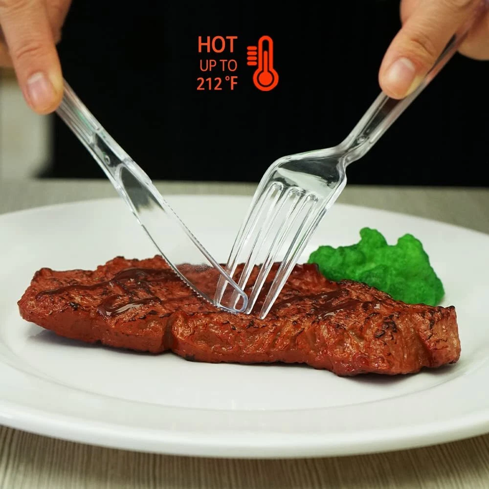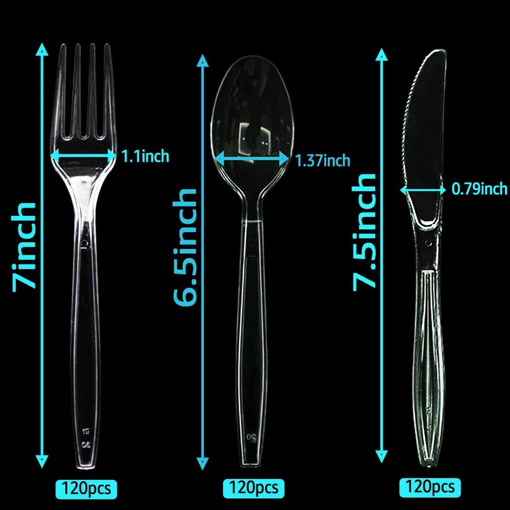 HEAVYWEIGHT AND STRONG - Our plastic silverware set are made of durable and sturdy plastic will not snap or break easily with strength disposable cutlery handle when serving foods like salad, steak, meals, macaroni, peanut, and jelly WASHABLE AND REUSABLE - Plastic forks and spoons knives are sturdy enough that you could wash and reuse after use that they can last long time. Our plastic cutlery have strong and safety teeth to firmly grasp the food, and no scratches to hurt your family PARTY GOT EASIER - When the party is over, plastic utensils tableware makes it easy to clean up, and there is no need to worry about the expensive silverware being thrown away accidentally. You can use the forks plastic disposable everyday, it saves you time from washing dishes constantly COLORLESS AND TASTELESS - The plastic spoons and forks clear can withstand hot food/cold food well without melting or softening, ideal for breakfast, lunch, or dinner service or for desserts. Eelegant clear design makes it easy for you to track who is using which forks AFFORDABLE 360 PLASTICWARE BULK - When you need dinner utensils, look no further than this economical reusable utensils. Disposable serving utensils pack comes complete with 120 fork, 120 spoon, and 120 knife, making it perfectly for your takeout restaurant, cooking, party, party or other catering activities