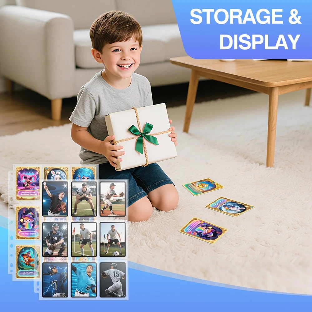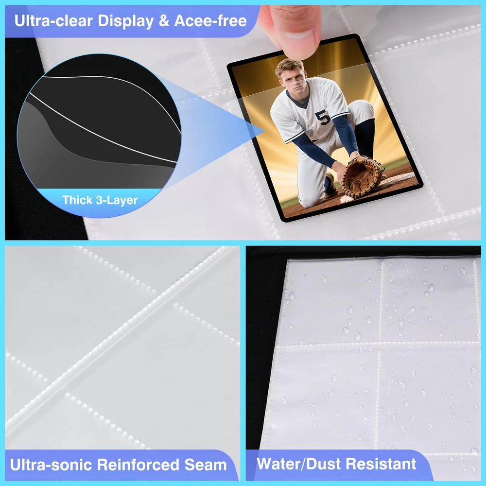 Trading Card Sleeves organize and protect valuable collectible trading cards Application: -Sports Cards (Baseball cards / Football cards/Basketball Cards); -Game Cards (Nintendo cards / MTG cards/Yugioh cards) -Coupons -Business Cards -Mini Photos -Bank Cards Size: -Page:8.86x11.5 Inches -Pocket:2.6x3.6 Inches -Thickness: 0.2mm for each sheet Feature: -Double-sided storage provides Double cards capacity -Using high quality Polypropylene that is Acid-free and NO PVC, harmless for your cards -The Ultrasonic Welding Technology extend the card sleeves durability, and make it won't rip easily Card Protector:9 Pockets for each page ,Double-Sided pages protector match with 3 Ring Binder, suitable for trading cards, sport cards, business cards, coupons, credit cards within 2.68x3.58 inch Transparent: ultra-transparent pockets collect and display your cards orderly and clearly ,no need to take them out when watch them Premium Quality: the material is made of ultra-clear polypropylene with durable quality ,non-toxic, no PVC, harmless for your cards.Ultrasonic Welding Technology and thicker material extend the card sleeves durability, and make it won't rip easily Convenient Use: insert the card with top loading and put the card album horizontal or upward can keep cards from falling After-Sales Service: We will always provide you with a satisfying purchasing experience .if any problem with the products, please feel free to contact us. We will solve it at once