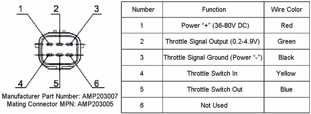 Hall-Effect Throttle Electric Vehicle Speed Signal Device Wide Input Voltage 36-80V DC Including Installation Kit & Mating Connector New in Box Description: HXJS-4805 throttle uses the technology of non-contact sensor. HXJS-4805 is compatible with controllers CURTIS, SEVECON, DANAHER, BOSCH, SIEMENS VDO, DELPHAI, WOODWARD Governors. SPECIFICATIONS: Model: HXJS-4805 Input voltage (volt): 36V-80V±2% DC Signal output: 0.2-4.9V ± 0.1V Water-proof connector Installation kit is included Mating connector is included Net weight: 1.0 kg The "Throttle Switch" is a built-in “limit type” microswitchwhich is an electro-mechanical device, detects the position of the rotating shaft of throttle: Idle status: switch off (normally open) Pedal stepped-down: switch on The "Throttle Switch" is useful for redundant safety: High pedal lockout to prevent unintentional acceleration Switching controller key switch Engaging the main contactor Depending on application purposes, there are multiple wiring methods for connecting the HXJS-4805 throttle to a motor controller or 0-5V signal receiver (for example, an electric proportional valve). In same applications, the “Throttle Switch” may be left to be unconnected. Connector Terminals' Definition: