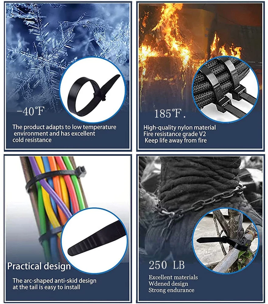 Extra large zip ties Ultra heavy duty zip ties with 250 lbs. Tensile strength handles your toughest jobs. Our large zip ties are wide and strong, will be able to tackle tough outdoor task. UV Resistant Our black zip ties are made of UV resistant nylon 66. Operation temperature range of the -40℉ to 185℉. Cold - Heat Resistant Zipties The zip tie can resist heat and cold, suitable for indoor and outdoor use. Tie wraps Multi-purpose Applications Our plastic cable ties can be used to tie cords and cables for electronics. wire ties can be used to organize electrical wires, PC cords. You can use them to repair garden fences, hang LED lights, etc. Large zip ties quantity:36 inch zip ties pack of 20 250 pound: Heavy duty zip ties for outdoor use max supporting weight/tensile strength Big zip ties :Colour:Black .Length: 36 inch(900 MM). Wide: 0.4 inch(10 MM).This specification has good flexibility and strong tensile force. Raw material:The plastic tie wraps are made of Nylon 66(UL 94V-2 Rating) which is UV resistant. 7-Points : UV-resistant,antioxidant,resist heat ,Rain proof Prevent-freezing, durability and weatherproof, so in snow and direct sunlight is not a problem.