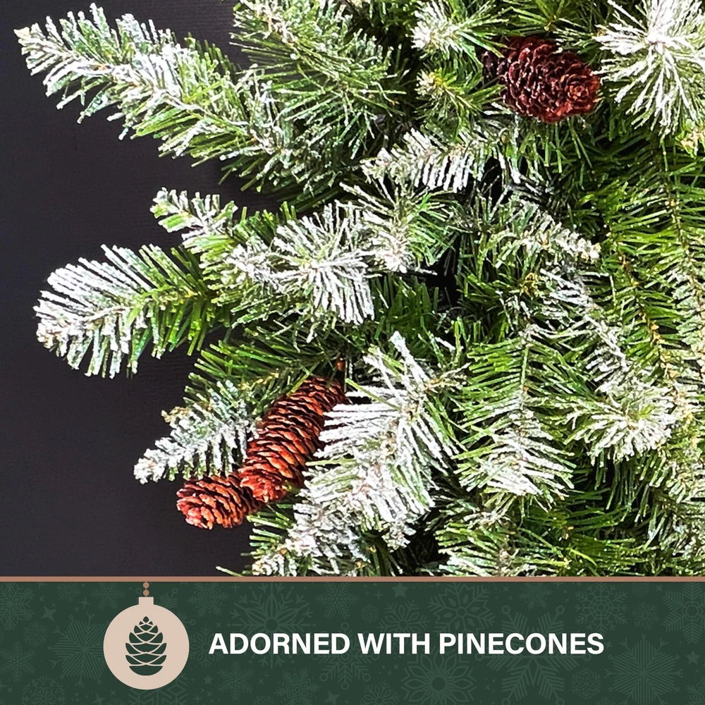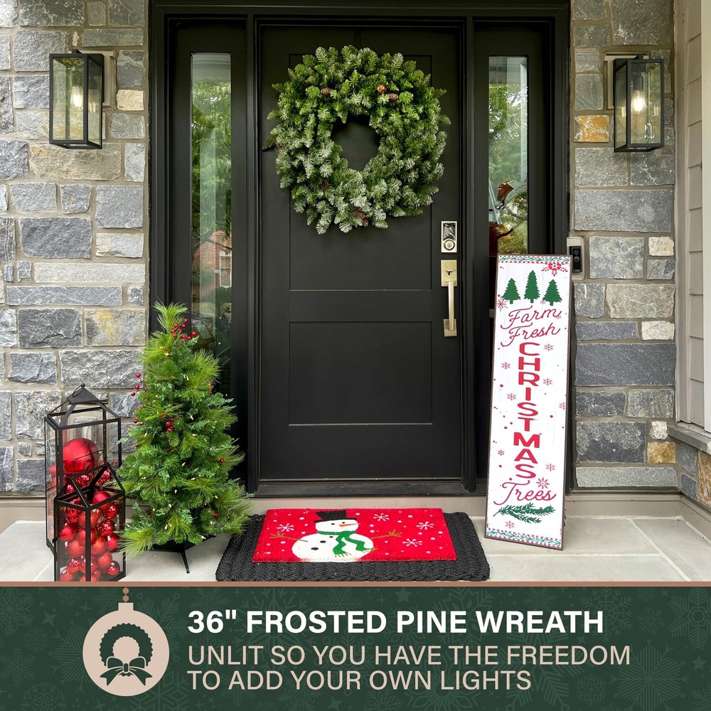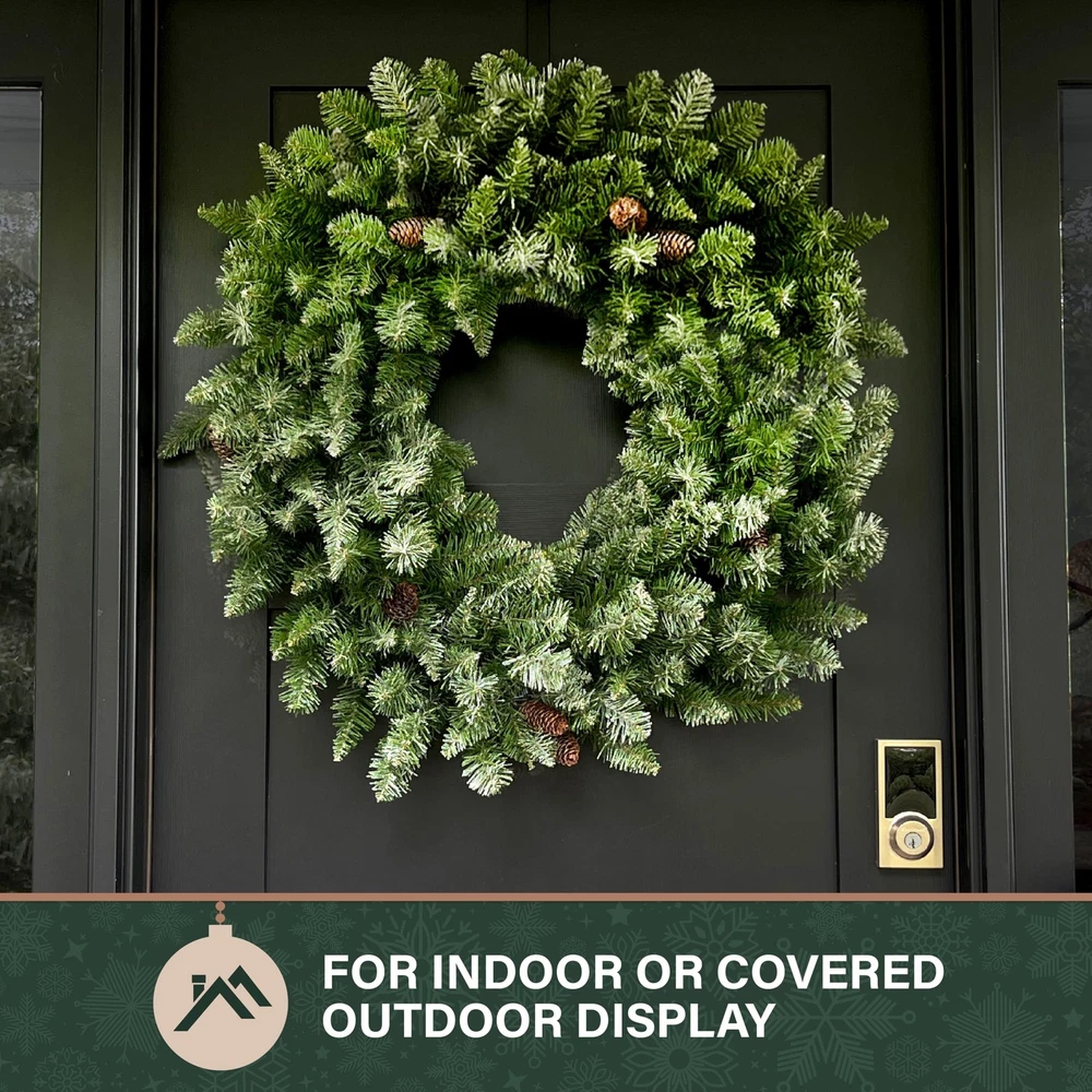 Deck the Halls: Welcome guests with this delightful 36-inch snow flocked artificial wreath on your front door, above your fireplace, or anywhere else indoors or covered outdoors Designer Finishes: Beautifully crafted with frosted pine branches and trimmed with pinecones to provide years of enjoyment Timeless Elegance: A long lasting alternative to a traditional live door wreath High Quality Materials: This realistic wreath is designed using high quality artificial materials that are flame retardant, nonallergenic, and crafted to last season after season No Assembly: Festive wreath is preassembled so all you need to do is remove from box, fluff, and hang and requires no maintenance from year to year