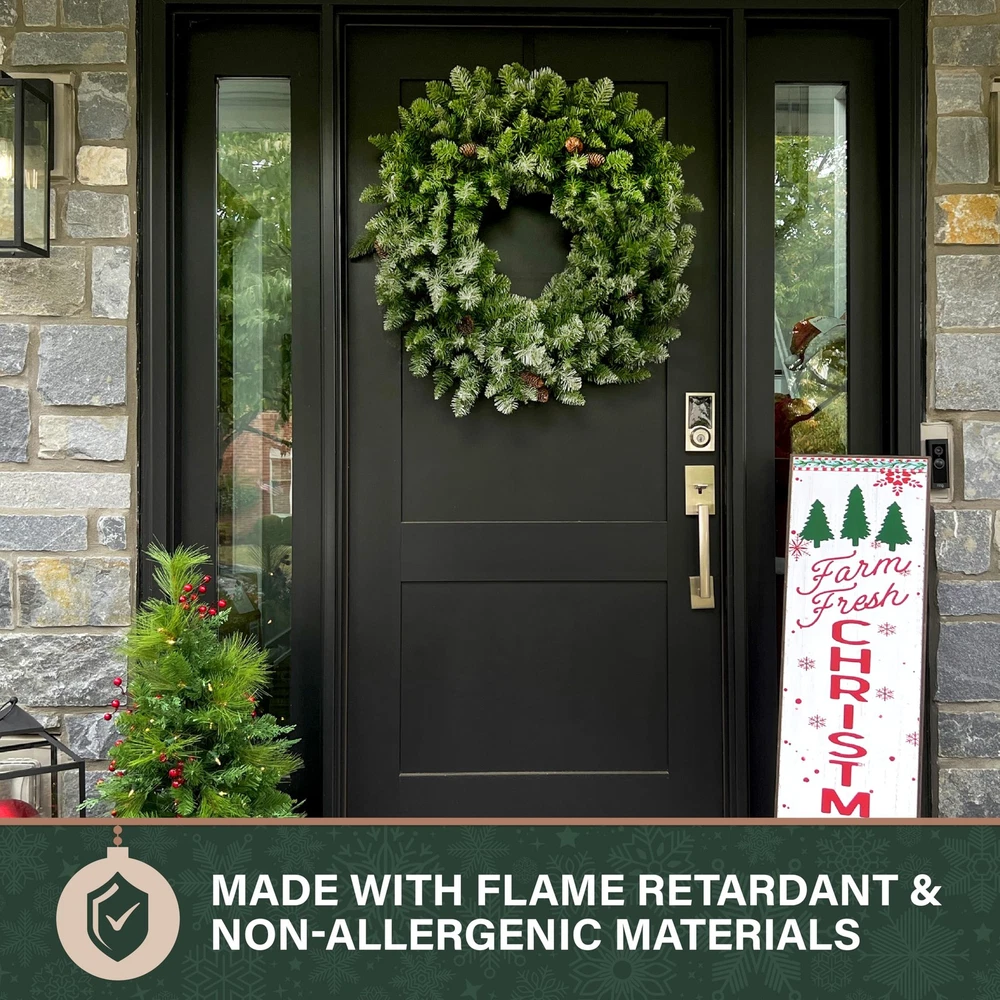 This frosted pine wreath is absolutely stunning! The realistic flocked branches and natural-looking pinecones add such elegant charm to my front door. It’s lightweight yet durable, and the quality is impressive—no shedding or fading. Perfect for winter décor, it brings cozy holiday vibes without any maintenance. Love that it’s flame-retardant and safe for indoor or covered outdoor use. A gorgeous, timeless piece that elevates my home’s festive look!