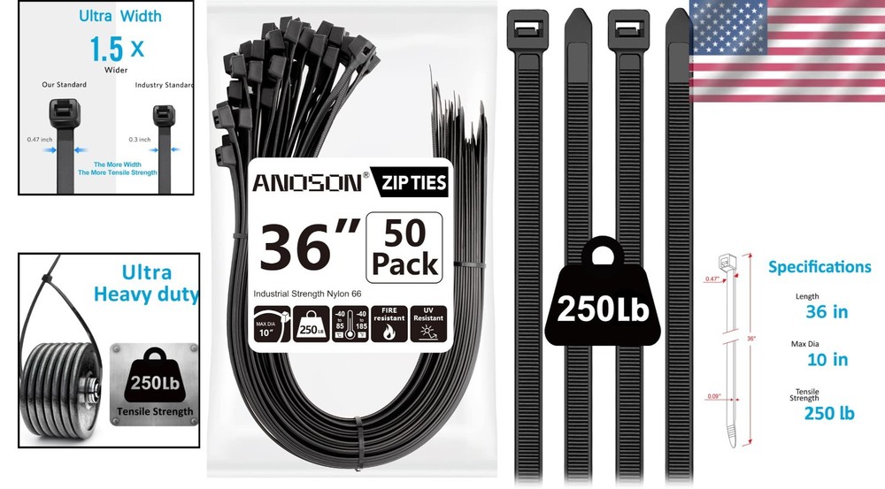 UV Resistant 36 Inch Zip Ties - 50 Pack, 250 lbs Strength for Indoor/Outdoor Use ‹ › ‹ › ‹ › ‹ › ‹ › ‹ › ‹ › ‹ › ‹ › UV Resistant 36 Inch Zip Ties - 50 Pack Experience unparalleled strength and reliability with our Extra Heavy Duty Zip Ties, designed for both indoor and outdoor applications. These versatile fastening solutions are not just long; they’re built to withstand the toughest conditions. Product Features: Impressive Strength: With a tensile strength of 250 lbs, our zip ties provide the durability needed for any project. Generously Long: At 36 inches, these zip ties are perfect for accommodating large bundles with a maximum diameter of 10 inches. Versatile Usage: Ideal for home, garden, garage, and various other applications, both indoors and outdoors. Specifications: Length: 36 inches | Width: 0.47 inches | Max Diameter: 10 inches | Tensile Strength: 250 lbs | Color: Black | Quantity: 50 Pack. Warranty Assurance: Enjoy peace of mind with a 1-year warranty, including a 100% refund for quality issues. Why Choose Our UV Resistant Zip Ties? Constructed from high-quality UV resistant, halogen-free nylon 66, our zip ties operate efficiently across a temperature range of -40°F to 185°F, ensuring durability in any environment. Unlike standard zip ties, ours feature a wider 0.47 inch design for added strength, making them ideal for heavy-duty applications. Their self-locking mechanism ensures a secure, tight fit, ensuring your connections remain intact. Multi-Purpose Applications From organizing cords and cables for electronics to industrial and construction uses, these heavy-duty zip ties excel in any setting, making them a staple in your toolkit. Don’t compromise on quality—choose our UV Resistant 36 Inch Zip Ties for all your fastening needs. Order your 50 pack today and be prepared for any project that comes your way! Important Safety Tips: WARNING: Keep plastic bags away from babies. WARNING: Use within the specified temperature and tensile limits. WARNING: Keep sealed for long-term use. Shipping Free & Fast Shipping - We offer free shipping to most of the USA with a normal delivery time of 3-10 businessdays. However, due to various situations, additional delivery time (up to 3 weeks) may be required for some items. Alternative Carriers - We may use alternative carriers (e.g. USPS, FedEx, UPS, etc.) to ensure your package arrives safely and on time. Due to the use of multiple carriers, we are unable to provide a tracking number automatically. Handling Time - Orders are processed and shipped within 1-5 business days of receiving cleared payment. Shipping Restrictions - Shipping to Alaska, Hawaii, Puerto Rico, Guam, and other US territories may incur shipping charges or delivery restrictions. Please contact us before ordering, or your order can be refunded/cancelled. State Restrictions - There may be restrictions based on your state of purchase. For example, certain items may not be shipped to California due to state regulations. Contact for Tracking Updates - If you require tracking updates or have any concerns about the delivery of your order, please feel free to contact us, and we will be happy to assist you. Return Please see our ebay return policy. We do not accept return on most products. This is to avoid customers mis-using ebay returns. All sales are final. Please be sure to check the return policy listed at the top of the listing. In rare cases, we may accept returns, if the buyer pays both ways shipping and 20% restocking fee. If you are un-sure of return policy of a particular item, please ask before buying. Payment We accept all major credit cards, PayPal, and Apple Pay for your convenience. Your payment information is secure and encrypted to ensure a safe and seamless transaction. Please complete your payment within 3 days of purchase to avoid any delays in shipping. Feedback Your feedback is extremely important to us. We strive to provide the best products and customer service possible. If you are satisfied with your purchase, please take a moment to leave us a positive review. If you have any concerns or issues with your order, please contact us before leaving negative feedback. We are committed to resolving any problems and ensuring your satisfaction. Contact Us If you have any questions or concerns, please feel free to reach out to our customer support team. You can contact us through the eBay messaging system. We are available Monday to Friday, 9:00 am to 5:00 pm EST, and we will do our best to respond to your inquiry within 24 hours. Buy it now and enjoy a pleasant shopping experience! UPC: Not Set Unit Quantity: 50 Material: Nylon,Nylon 66 Features: Heavy Duty,Self-Locking,UV Resistant,Flame Retardant Brand: Unbranded Type: Cable Ties Color: Black Tensile Strength: 250 lb Item Width: Not Set Finish: Natural Item Length: 36 in MPN: Not Set Unit Type: Unit Number in Pack: 50 Country/Region of Manufacture: Not Set Manufacturer Warranty: Not Set