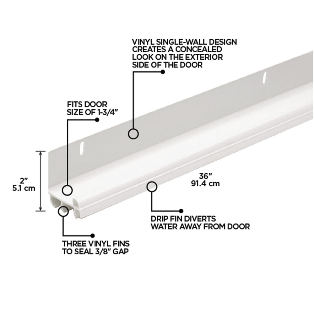 Product Description 43816 36-Inch L-Shaped Door Bottom with Vinyl Fins From the Manufacturer 36-Inch L-Shaped Rigid Vinyl Door Bottom with flexible vinyl fins. Screws Included. For Use with Saddle Threshold. Fits 1-3/4-Inch Doors. Designed to be used with smooth top thresholds to seal out drafts from the bottom of your door. Helps make your home more comfortable Fits 1-3/4-Inch thick by 36-Inch wide doors Seals up to 7/16-Inch gap between bottom of door and threshold Durable white vinyl construction Vinyl seal provides All-season protection against drafts, moisture, dust and insects Slotted screw holes for easy adjustment