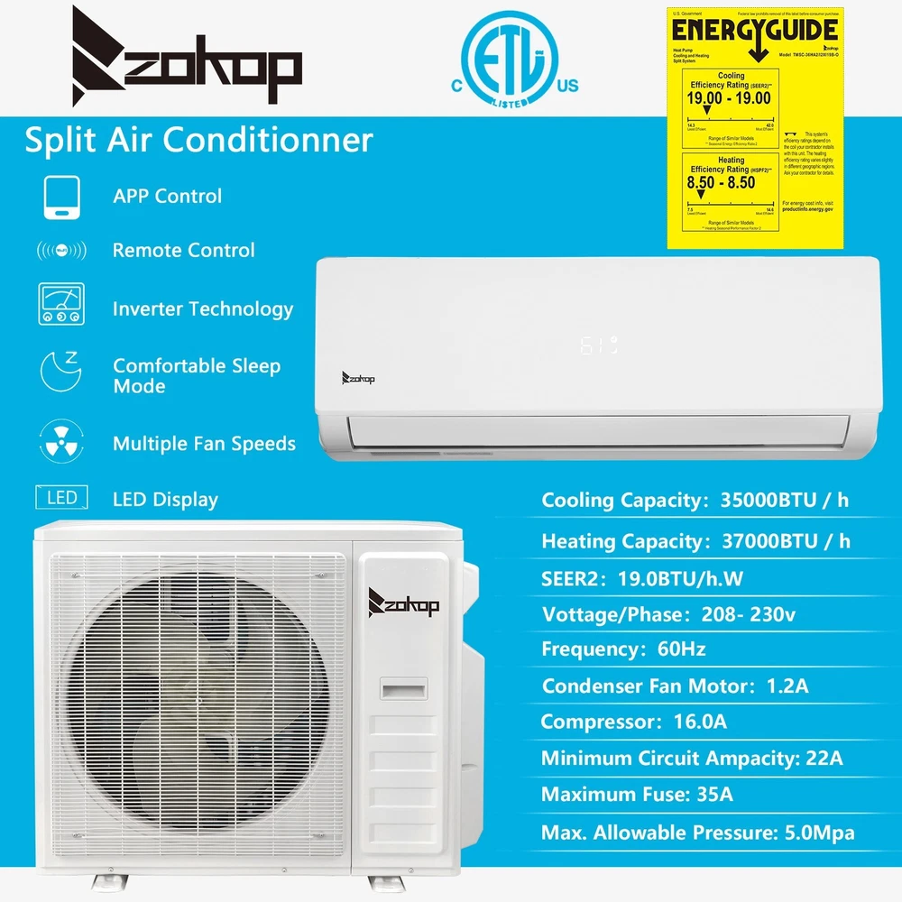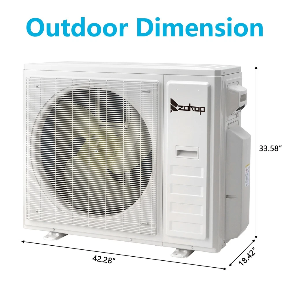 36000 BTU 3 Zone 2 x12K+18K BTU Mini Split Air Conditioner Heat Pump AC Ductless ZOKOP 3 Zone Ductless Mini Split Air Conditioner Heat Pump System, 21 SEER2 Ductless AC with 2 Indoor Air Handlers, 1 Outdoor Condenser, 25ft Installation Kit (12K+12K+18K) Introductions: ZOKOP smart Split Type Type Inverter Air Conditioners with heating function are made with high quality compressor, high speed pure copper motor & inner spiral copper tube which are powerful to quickly cool down / warm your home, office, garage or apartment for maximum comfort in quiet operation, perfect appliance in hot Summer or cold Winter. Comparing with others, machine featured with high SEER grade, which means that it is more energy efficient and much money saving! This unit also has Sleep, Turbo, ECO, Mute and Timer functions. These functions help you enjoy the true individual comfort. Let the ZOKOP Mini Split Air Conditioner 3-Zone be the solution to your home's heating and cooling needs. Features: 1. [MULTIPLE ROOMS] Comes with 3 indoor air handlers 12,000 BTU+12,000 BTU+18000BTU with separate controller for individual rooms and 1 outdoor condenser. Enjoy individual temperature controls in each room for ideal climate control. This unit provides cooling and heating for up to 2100Sq. Ft ( two indoor unit recommended area 550 Sq. Ft., another one 1000 Sq. Ft. ) and able to work in environments as low as 5 degrees Fahrenheit. 3 pcs 24.6ft copper pipes (Standard size 1/4" & 3/8" outer dimension) and 2 installation kits included. The length for drain pipe is 78.7". Featured with Cooling, Heating, Dehumidifying and Fan only modes in one compact unit. It is ideal for using in home's bedroom, living roo, kitchen, office, apartment, garage and so on. 2. [Energy Saving] ZOKOP the speed of the air conditioner equipped with frequency converter directly affects the service efficiency of the air conditioner. The frequency converter is a control system used to control & adjust the speed of the compressor to make it always in the best speed state, so as to improve the energy efficiency ratio (at least 35% more energy-saving than the conventional air conditioner). This 21 SEER2 12000BTU+12000BTU+18000BTU, 208/230V~60Hz, AHRI Certified AC unit with a heat pump(up to 5℉/-15℃) is featured high quality compressor for more efficient cooling and longer working life; Higher SEER grade & Eco-friendly design which leads you for money saving ( please confirm voltage before making purchase) . 3. [Quiet Cooler & Heater] Ultra Silent at only 28-49 dB(A) and beautifully built adds a touch of elegant charm to your room. In sleeping & mute mode, It's able to maintain the temperature while you are sleeping. And you can use the 24-hour timer in combination to free you from additional worries. Featured with 4-way swing function, unit provides scientific airflow in your room to suit your comforts in just a few minutes. Best choice to decorate your home. 4. [Smart Operation] Operating this conditioner is an easy-understanding and enjoyable cooling experience (61-88degree Fahrenheit ). We can set all functions on remote control (Fan Speed Selection, Sleep Mode, 24 Hour Timer, ECO Mode, Turbo Mode, and Mute Mode). Built-in microprocessor chip & sensor in the remote controller makes it more convenient to operate the air conditioner from a distance. Digital LED display controls offer precise temperature adjustments and the remote control lets you control the air conditioner from across the room. 5. [Washable Air Filter] This indoor AC machine comes with a permanently washable and easy cleaning air filter. Keep your air conditioner running more efficiently by cleaning the filter once a month. Specifications: 3*Indoor Unit: 1. Color: White 2. Power Supply: 208/230V, 60Hz 3. Cooling : Rated Capacity: 12000Btu/h, 18000Btu/h Rated SEER2: 21Btu/W.h, 21Btu/W.h Rated EER2: 9.5Btu/W.h,9.5Btu/W.h 4. Heating: Rated Capacity:12600Btu/h, 19000Btu/h HSPF2 Rating (Region IV): 8.2Btu/W.h,8.2Btu/W.h 5. Operation temperature: (16~31)degree Celsius/(61~88)degree Fahrenheit 6. Use the air conditioner in the following temperature conditions: Indoor(cooling/heating): 17 ~32degree Celsius(63 ~90degree Fahrenheit)/0 ~27degree Celsius(32 ~80degree Fahrenheit) Outdoor(cooling/heating): 15 ~55degree Celsius(59 ~131degree Fahrenheit)/-15 ~24degree Celsius(5 ~75 degree Fahrenheit) 7. Moisture removal: 1.6L/h, 2.2L/h 8. Indoor air circulation/Hi : 520/450/380m³/h, 1030/790/730m³/h 9. Indoor noise level at cooling(Turbo/High/Med./Low/Mute): 45/42/35/30/28dB(A), 49/47/42/37/32dB(A), 10. Application Area: 12000BTU Up to 550 sq.ft. , 18000BTU Up to 1000 sq.ft 11. Certificate : AHRI, ETL 12. 12000BTU: Indoor Dimensions: 81.1x29.2x20.5cm(31.9x11.5x8.1inch) Indoor Package dimensions: 88.5x36.6x27.8cm(34.8x14.4x10.9inch) Indoor Net weight: 9.5kg/20.9Ibs Indoor Gross weight: 12.7kg/28Ibs 13. 18000BTU: Indoor Dimensions: 101×31.5×22cm(39.8x12.4x8.7inch) Indoor Package dimensions: 109.6×39×30cm(43.2x15.4x11.8inch) Indoor Net weight: 12.5kg/27.6Ibs Indoor Gross weight: 15.3kg/33.7Ibs 1* Outdoor Unit : 1. Cooling Capacity: 28000BTU/h 2. Heating Capacity: 28000BTU/h 3. SEER2: 20.0BTU/h.W 4. Rated Voltage: 208/230V~60Hz 5. Refrigerant type: R454B/2200g/77.66ozs 6. Outdoor Dimensions: 97.8x42.1x80.3cm(38.5x16.57x31.61inch) 7. Outdoor Package dimensions: 102.2×48×83.5cm(40.27x18.9x32.96inch) 8. Outdoor Net weight: 54kg/119lbs 9. Outdoor Gross weight: 68kg/127.9lbs 3*Copper pipes : 1. Connecting Pipe: Gas 3/8''-24.6FT/7.5M Liquid 1/4''-24.6FT/7.5M 2. Signal Cable Length: 24.6FT/7.5M 3. Drain Hose:6.6FT/2M Package Includes : 3* Indoor box includes : 1 x Indoor Unit 1 x Remote Control 1 x Screw Pack 1* Outdoor box includes: 1 x Outdoor Unit 4 x Outdoor feet rubber 3*Copper pipes box includes: 1 x Copper pipes set(24.6FT) 1 x Signal Cable(24.6FT/7.5M) 1 x Drain pipe(6.6FT) 1 x Drain pipe adapter 2 x Sealant 2 x Wall sleeve cover 2 x Pipe tape 1 x Insulation pipe 1 x Wall sleeve