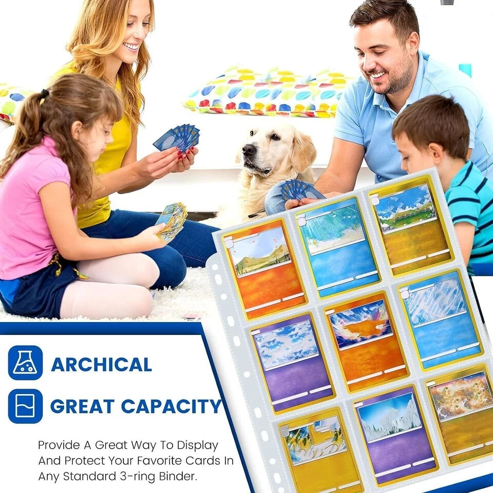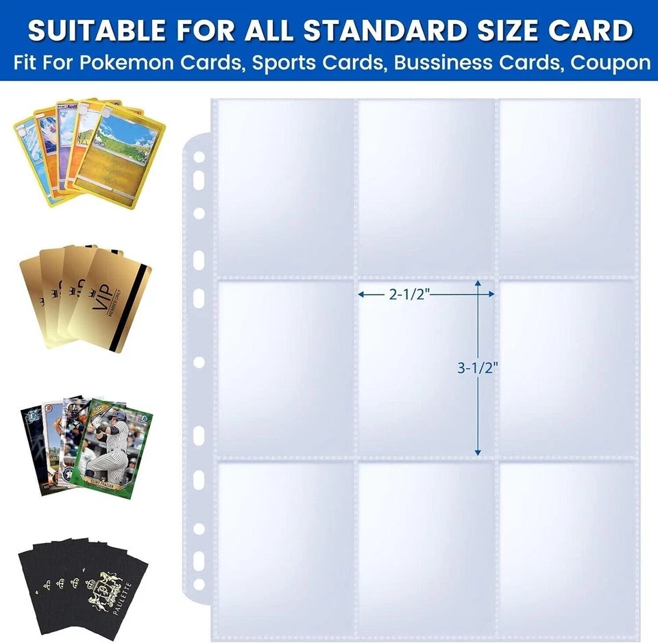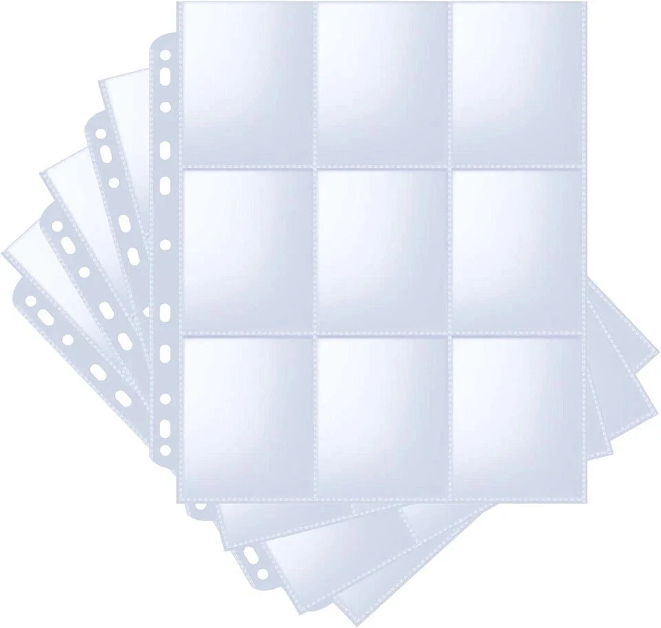 36-pack Trading Card Sleeve Pages 9-pocket Binder Sheets for Sports Game Cards 36pack Trading Card Sleeve, 9 Pocket Card Sleeves Binder Sheets for 3 Ring Binder, 11 Holes Trading Card Binder Sleeves Fit for MTG, Baseball, Game, Business Cards, Coupon Material Polypropylene (PP) Color Clear Style Sports Max Input Sheet Capacity 36 About this item 36 Pack! Holds 648 Cards: 9-pocket for each page protector, you can put two cards in one slot back to back to display your trading cards, sports cards, business cards, coupons, Kpop photocards within 2-1/2" X 3-1/2" pocket. 11-Hole Punched Design Fits All Standard Binders: Compared to others provide 3 holes photo sheets, we have 11 holes pre-punched which allows the card sleeves binder sheets to fit in any standard ring binders, such as 2/3/4/11 ring standard binder. Premium Quality: Made of heavy-duty polypropylene(PP) which is waterproof and dustproof. Reinforced heat-sealed seams, acid-free & non-stick for long-term use and no-fuss card storage. Top Loading Pockets: Make it easy to keep cards securely stored and easy to access, but won’s slide out easily. Convenient for inserting and removing postcards frequently. Optimum Clarity: With crystal clear PP football card sleeves offer complete transparency for checking through and organizing your favorite game cards.