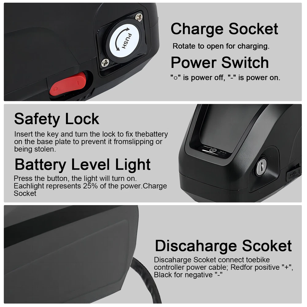 π Battery Type 36V 10Ah ebike Battery Pack for 200Watt-750Watt Electric Bicycle Rechargeable π Battery Voltage 36 Volt π Battery Capacity 10 Amp Hours π BMS(Battery Management System) 10s 30Amp π Continue Discharge current 30Amp π Rated Discharge Current (A) 50Amp π Instantaneous Discharge Current 75Amp π Compatible Model For 200W/250W/300W/350W/400W/480W/500W/750W/800Watt Electric Motorcycle Kit π Compatible Brand Universal π Feature Cost-effective alternative to Samsung, Panasonic π Charge Cutoff Voltage (V) 42V +/-1V π Discharge Cutoff Voltage (V) 25V+/- 1V π Cell Size 18650 3.7Volt 2500mAh π Cell Quantity (parallel*series) 40 PCS π Cell Combination 4parallel 10-series(10s4p) π Charger Type 42V 2A 5.5mm x 2.1mm DC Adapter π Chargring Voltage 42 Volt π Chargring Current 2A ~ 5A π Standard Charge Current (A) 2A π Charge Time under Standard Charge Current 5 hours π Fast Charge Current (A) 5A π Charge Time under Standard Charge Current 2 hours π Charge Temperature Range 0 ~ 55Β°C/32 ~ 131Β°F π Discharging Temperature Range -20Β°C~70Β°C/-4 ~ 158Β°F π Storage Temperature Range 0Β°C ~ 30Β°C /32 ~ 86Β°F π Battery Weight About 4.7kg/10.36lbs π Battery Power 200W/250W/300W/350W/400W/480W/500W/750W/800Watt Note The Parcel can't be sent to Las Vegas,Hawaii,also PO Box address Our Advantages 1.Factory e-shop insure cost effective and high quality 2.Pass CE, ROHS, BASTO,UL,UN38.3) 3.US domestic market orders will be shipped out by FEDEX from oversea's warehouse(1-3 working days after payment).The parcel will be delivered within one week. Warranty Warm tips 1. According to transportation requirements, battery can not be fully charged. Please fully charge the battery once you receive it to activate the battery for maximum capacity. 2. In order to keep the highest power and longest using life, make sure to charge the battery at least every three months once timeοΌif prepare storage for a long time make sure keep battery capacity above 80%. 3. Battery should be placed in a dry environment, far away from fire and water. 4. Make sure you buy the suitable battery or motor kits, please check the size and the model carefully before you buy it! 5. When the battery capacity is less than 20%, please charge in time to ensure the battery life. 6. We will check every parcel before shipping, since we cannot control the state of transportation, please contact us in time when you receive damaged goods. We will handled it properly. Important notice for recycling of used batteries *As a professional battery distributor, we strictly abide by local laws and regulations to ensure battery quality, transportation and storage safety, environmental protection. *According to the battery regulation, batteries must not be disposed of with household ordinary waste. *Consumers are obliged to dispose of the used batteries to the professional recycling agency for proper disposal. They must not be arbitrarily throw into the trash. Please protect the environment!