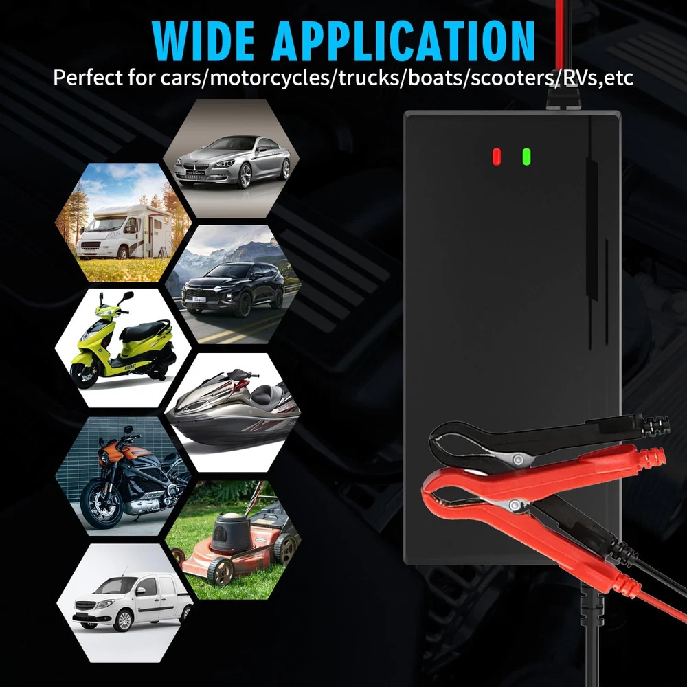 36 VOLT BATTERY CHARGER Widely Used: Ideal for 36 Volts Rechargeable Deep Cycle LifePo4 Lithium Iron Phosphate Batteries. Providing max 8 amps charging current quickly fill your golf cart, ultra-high power, deep cycle battery charging, do not damage the battery. Suitable for Golf Cart, cars, trucks, marine, agricultural vehicles, ships, motorboats Lawn,Mower, Boat, SUV etc.… Protection and Maintenance for 36V Lithium Battery: Fast intelligent charger, Multilevel Protections guard against Over voltage protection, Software over voltage protection, over-temperature protection, short circuit protection, current limiting protection and reverse polarity protection with Cooling system,refractory material, safe and reliable. Safe and Secure - Automatic Shutdown when fully charging. Smart and Efficiently 43.8V Lifepo4 smart charger: It is implemented the special 2-stage constant current/constant voltage (CC/CV/Cut off) charge algorithm. This charger protects your LiFePO4 battery's delicate structure by boosting charging efficiency and maximizing lifespan through its careful utilization of the CC/CV algorithm regardless if the battery has a BMS or not.【2 LED indicator light】When charging,LED 1 Red Power on, LED 2 Red charging/Green full charged Golf Cart 36V Battery Charger-Optimized for Any Climate: More precise charging in hot and cold climates because of our new integrated thermal sensor. Avoids under-charging in cold weather down to -13℉, meanwhile, avoids over-charging in hot weather up to 104℉。Automatically and intelligently adjust charging current to prolong battery life. Durable Quality and Cooling System: The durable shell and cooling fan allow the charger's exterior to function as a heat sink with over-heating protection. In the test, it makes more than 30,000 POH(power on hours).To recharge and maintain Lithium-Ion Phosphate (LiFePO4) batteries — maximizing their performance and lifespan, we suggest using a dedicated lifepo4 battery charger to ensure you get the best out of your Lifepo4 Lithium batteries. Product Description