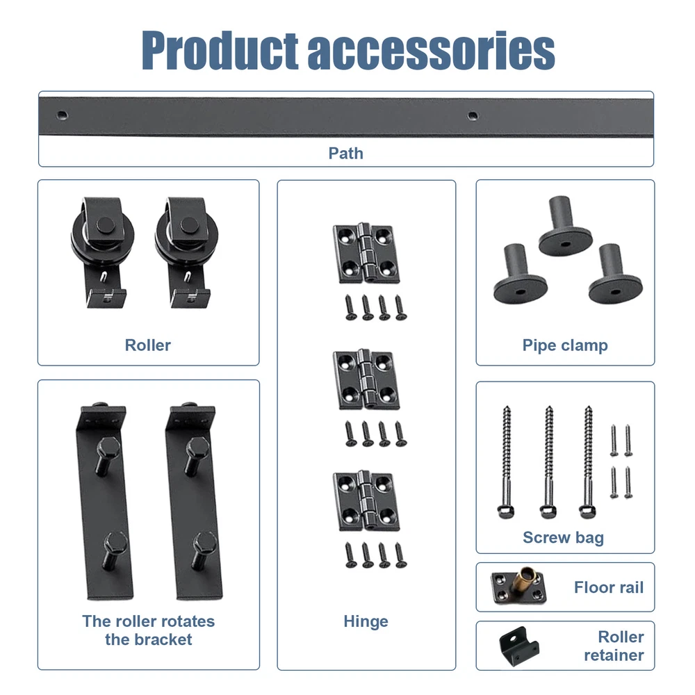Store category Sign Up Now ! You may also like Product Description Bullet Points: Application Safety: Seamlessly integrating with your home's aesthetic, our folding door kits offer a safe design that's ideal for children, ensuring a bestly wide range of applications while conserving your living space. High-Grade Quality: Created using carbon steel, our Barn Door Hardware features high-quality nylon wheels and rollers that are wear-resistant, delivering outstanding durability and strength when it matters most. Hassle-Free Installation: Our barn door hardware provides a hassle-free installation process with detailed instructions and intuitive components. The bi-fold sliding design saves space while providing a total width solution, giving you more room and time for other things. Versatile Use: Make your barn door unique with this complete hardware set, suitable for 35mm-45mm door thickness. All accessories included for different needs, door not included. Perfect fit ensured. Multi Applications: Our Barn Door Hardware is built with a strong load-bearing capacity, making it perfect for various living spaces such as living rooms, study rooms, and restaurants. With its smooth and quiet slide, it ensures reliable performance for heavy use in homes and other commercial applications. Transform any doorway into a beautiful focal point with our Barndoor Hardware! Safe for children with durable, wear-resistant materials. Total width adjustable to fit your preferences or living situation. Upgrade your space with this stylish and functional addition. Specification: Name: Barn Door Hardware Colour: Black Material: Carbon steel Track Size: about 36 inches/91cm Track Splicing Method: 3 pieces Scope of Application: Door panel thickness 0.5-50mm Packing List: 3* Track 2* Scroll Wheel 2* Roller Swivel Stand 1* Roller Holder 3* Spacers 3* Hinge 1* Floor Rail 1* Sealing Strip 1* Screw Pack 1* Instruction Manual 3* Pipe Clamp 35mm 4* Wood Screws M8*90 4* External Hexagonal Machine Wire M10*60 4* Cover M10 Notes: 1. Due to the different monitor and light effects, the actual color of the item might be slightly different from the color which is showed in the pictures. 2. Please forgive a slight measuring deviation due to manual measurement. 3. Door is Not Included. Payment Delivery details Terms of sales About us Feedback & DSRs Payment Before you palce an order, please kindly make sure that you have a paypal account. We accept PAYPAL payment only. Payment should be completed within 2 days after auction closed, or unpaid dispute will be filed for an closing auction. An unpaid case will be filled after 4 days. Delivery details We ship to your eBay address. Each package will be shipped to US by UPS Regular Parcel with tracking number. Please check your shipping address carefully before checkout, it can't be changed if order completed. All items will be shipped within 1-2 business day upon receipt of payment.Orders placed on weekend will be shipped within 3 days. If you do not receive your item in 7-10 business days.please contact us immediately for further assistance. We will be responsible for any damages or losses incurred in the shipping process. About us We maintain high standards of excellence FIVE STAR and strive for 100% customer satisfaction! Positive Feedback is very important to us. We hope that you contact us immediately Before you give us neutral or negative feedback, so that we can satisfactorily address your concerns. We promise to offer the lowest price and high quality produce. Our working time: From Monday to Friday(9:30 am to 18:00pm), we don't working on holidays ,hope you can understand and know that , thank you. Please always talk to us via ebay Message. We appreciate your business and look forward to growing our e-Bay sales with satisfied customers. Feedback Contact us If you have any questions, please feel free to contact with us by ebay Message during our business hours ( 9:30a.m. to 5:30 p.m.), or email us through eBay, we will try our best to help you to resolve it. For any presale or after-sale questions,please do feel free to email us! Due to the time difference, each email will be replied within 1 working day,and weekend will be delayed a bit. Feedback