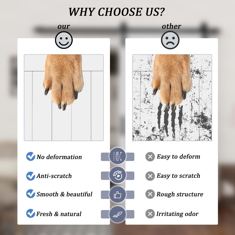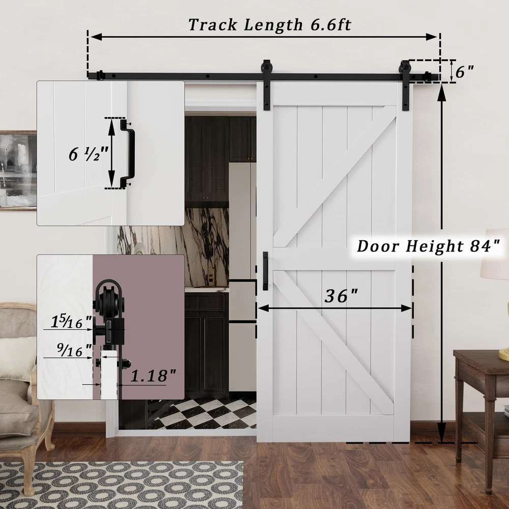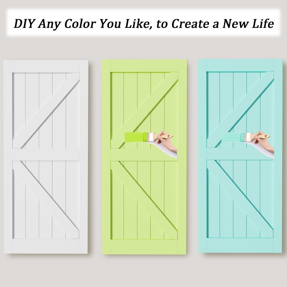 Sliding Barn Door with Hardware Track Kit, DIY Assembly, K-Frame, White Widely Use: The barn door is a perfect match with your interior room, storage room. Whether you're renovating your home or building from scratch, the White Barn Door with Hardware Kit is the perfect choice for adding a touch of sophistication and durability to any room. NO Need for a Craftsman: The package include Barn Door Slab, Sliding Hardware Kit, Handle, Floor Guide, and Installation Tools, Detailed Instruction. We also provide professional online installation guide, if you encounter any problems when you receive or use the product, please feel free to contact. (THE DOOR IS NEED TO ASSEMBLE) Easy Install: We provide step-by-step graphic & text installation parsing manual, you can also get professional installation guide from our online service. 【Water-Resistant & Scratch Resistant】 Pre-finished white paint water-resistant barn door surface is considered for durability, longevity, and ease of cleaning. High-quality solid sliding barn door surface with a flat and thin MDF can also strengthen the protection of the barn door surface, especially for families with pets. 【Easy to Install】 All wood panels are mitered for a snug fit, it is easy to assembly. Barn door is pre-drilled. A simple assembly is required, just install the rail on the wall and hang on the door, then you could have a perfect sliding barn door. 【Ideal for Various Scenarios】 Perfect for a kitchen, bedrooms, storeroom, dining room area or an elegant transition between spaces, barn doors enhance and unify your space with light and beauty, durability and beauty for long years of enjoyment. 【Package List】1x Barn Door, 1x Track Kit, 1x Handle, 1x Latch Lock, 1x Floor Guide, and Installation Manual. (Each door comes with separated planks and easy to put together) 【Guaranteed Service 24/7 Stand By】 Packaging comes with detailed barn doors and hardware included installation manual, which can be intuitively installed by yourselves. If there's any problem, please let us know, our professional Customer Service Team will actively answer them for you.