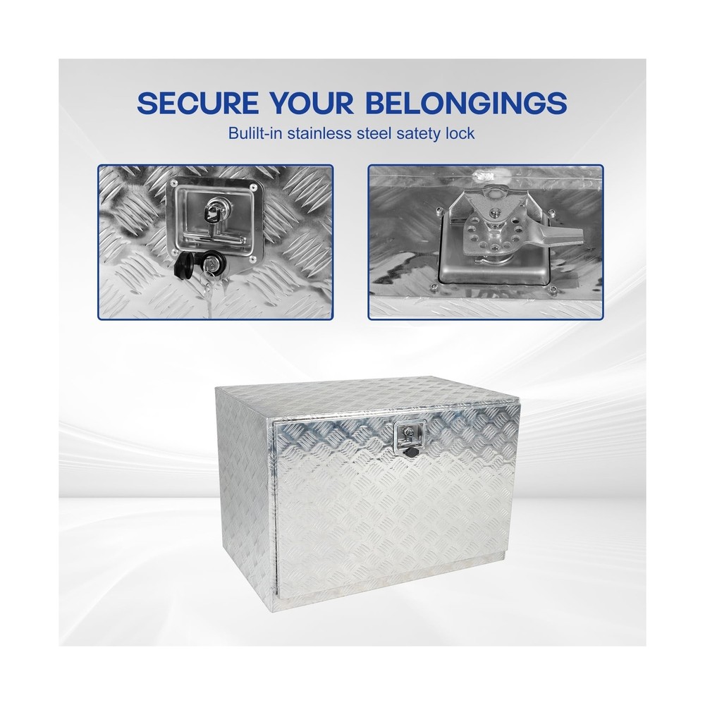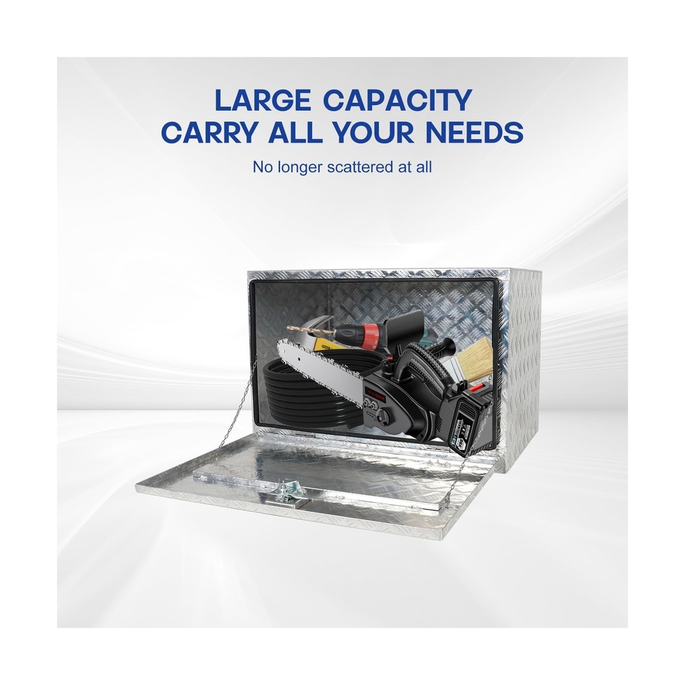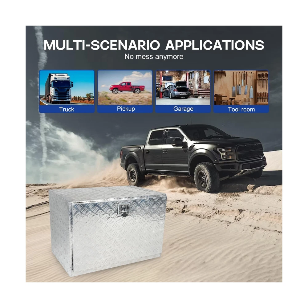 36"X24"X24"Sliver Aluminum Heavy Duty Pick-Up Truck Bed 6 Bar Tread Tool Box Trailer Storage Tool Box With Lock & Keys Description Description:100% brand new, Never been tried or installedMaterial: AluminumOverall Dimensions: 36"X24"X24"(L x W x H)Position: Truck Bed, UnderbodyColor: Sliver Featrues: Our tool box is designed to save space and provide extra storage in your truck bed. This tool box is constructed of heavy duty textured aluminum for maximum durability. The door features a over- hanging lip which resists water from getting inside. Fold up door provides full access. Built-in lock ensures all items are kept safe and secure. This aluminum underbody tool box is perfect for storing your tools in your vehicle or at home.Package Includes:1 X Aluminum Truck Bed Tool Box with 1 Key Features: High Quality: This tool box is constructed of heavy duty textured aluminum for maximum durability. 5 bar tread pattern and polished finish offers excellent corrosion and rust resistance, providing years of long-lasting durability. Size: 36"(L) x 24"(W) x 24"(H), perfect for storing your Tools in your Vehicle or at Home.Our tool box is designed to save space and provide extra storage in your truck bed. Fold Up Door:The door features a over-hanging lip which resists water from getting inside. Fold up door provides full access,roviding ease of mind in any Weather Condition.The door features a weather-resistant rubber seal for keeping all items inside dry and safe. Built in Lock:This aluminum box has a lock and 2 keys so you can safely use it to prevent things from being lost.In-built lock offers greater security for all your items. Fitment:This toolbox is versatile and can be used in trucks, RVs, ATVs, trailers, garages, job sites, flatbeds, camper hook racks, luggage racks, pickup trucks, or dump trucks. Product Details: Brand: frperce Color: Silver Material: Aluminum Special Feature: Foldable Style: Modern Brand: frperce Color: Silver Material: Aluminum Special Feature: Foldable Style: Modern Recommended Uses For Product: Tools Product Dimensions: 36"L x 24"W x 24"H Water Resistance Level: Water Resistant Opening Mechanism: Hinge Number of Items: 1 Unit Count: 1.0 Count Item Package Quantity: 1 Closure Type: Latch Manufacturer: frperce Part Number: LS0459 Item Weight: 35.2 pounds Item model number: LS0459 Size: 36"X24"X24" Number Of Pieces: 1 Special Features: Foldable Date First Available: November 3, 2023 Delivery We Do Not Ship Outside of the Continental US. Return Policy All items qualify for returns within 30 days of receipt. Buyer is responsible for return shipping on any item that is not damaged. Feedback We take our reputation seriously, we buy and sell online, so we understand the value of trust. If you are unsatisfied with your order, please contact us and we will work with you to resolve it to your satisfaction.