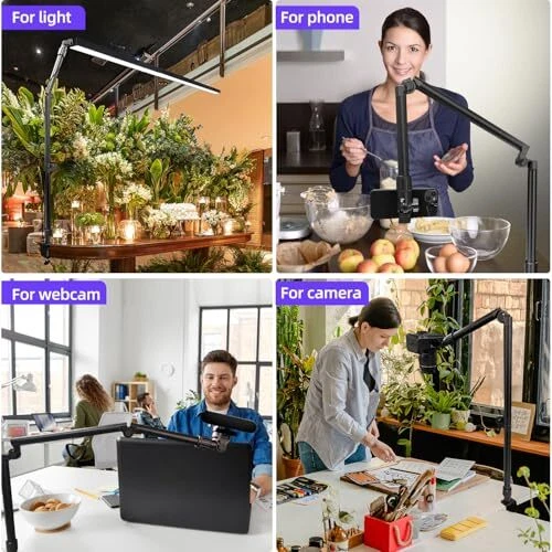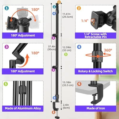 Return Policy Fast Delivery Trusted seller 37" Overhead Camera Mount Desk Stand, 3-Section 360° Adjustable Articulating Metal Arm with 1/4" Screw and Phone Holder, Foldable Webcam Stand for DSLR Camera Ring Light Projector Product Description Taller & Greater Load Capacity: Our overhead camera mount boasts an exceptional 37.4 inch/95 cm length, providing up to 3 times higher than its counterparts. Light stand can bear a load up to 11 lbs in a horizontal state and 22 lbs in a horizontal state High Quality: Three-Section mic boom arm is made of aluminum alloy, and c clamp is made of iron, longer service life. All-Metal webcam stand provides super safe and stable for your valuable devices Adjustable & No Shaking: The top and bottom of table stand are 360° rotatable, and each joint can be flexibly adjusted 180° bending. Our overhead phone mount with fixed gear solves the problem of the arm moving and falling over time due to gravity C Clamp Saves Space: Suitable for desks up to 2.4 inch in thickness, super clamp is a space saving tool to support the stand while keeping your desk clean and tidy. The rubber pads also prevent scratches on tabletop surfaces Wide Compatibility: Camera rig is suitable for light, microphone, projector, making it perfect for live streaming, video recording, Zoom meeting. Phone holder with a cold shoe provides extra convenience and can hold other devices to use at the same time Easy To Install: Package includes Camera Desk Mount Stand, C Clamp, Phone Holder. To install, secure C-clamp to table, install magic arm and adjust it to appropriate angle, then lock knobs. It comes with exquisite boxes making it an ideal gift for friends Shipping Returns Payment Shipping Shipping is FREE to all addresses other than APO/PO boxes in the lower 48 states. All our stock ships from US-based warehouses. Shipped via USPS or UPS (depending on location and package weight) Unless stated otherwise, all orders will ship within 24-72 hours of your payment being processed. Check our feedback to see the great reviews of FAST shipping we offer. Returns Seller does not accept returns Payment We currently accept payment via eBay managed payments only. Once payment is cleared, we will dispatch your shipment within 1-3 business days. Please refer to the "Shipping" tab for more information regarding shipping speed to your destination.