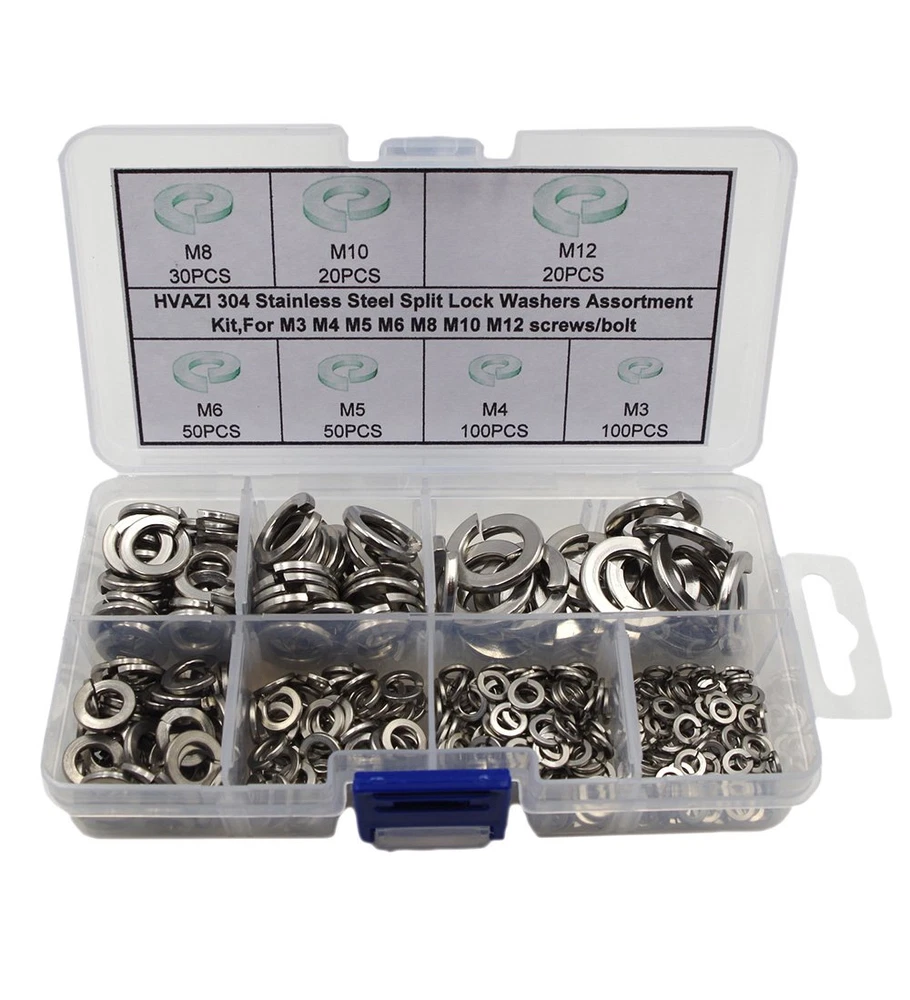 Metric 7 sizes Screw/Bolt Stainless Steel Split Lock Washers total 370 Pieces Suitable for metric M3,M4,M5,M6,M8,M10 M12 screws/bolt All products are made of 304 Stainless Steel 304 Stainless steel Split Lock Washers have good chemical resistance and may be mildly magnetic Meets DIN 127 specifications;All contained in a compact and see through compartmented plastic Box.Easy to install Product description: These washers have a locking feature to resist loosening from vibration. As a screw is tightened, these washers flatten to add tension to the joint and prevent loosening from small amounts of vibration. Package include: Stainless Steel Split Lock Washers For M3/M4/M5/M6/M8/M10/M12 Screw/Bolts total 370 pieces. Come with the plastic box: List(Type,Outer Diameter/Inner Diameter/Thickness,Quantity): Split Lock Washers For M3 6mmx3mmx0.8mm, 100pcs; Split Lock Washers For M4 7mmx4mmx0.9mm, 100pcs; Split Lock Washers For M5 9mmx5mmx1.2mm, 50pcs; Split Lock Washers For M6 11.5mmx6mmx1.6mm, 50pcs; Split Lock Washers For M8 14.5mmx8mmx2.0mm, 30pcs; Split Lock Washers For M10 17.5mmx10mmx2.2mm, 20pcs; Split Lock Washers For M12 21mmx12mmx2.5mm, 20pcs; Packing contents: HVAZI 370PCS 304 Stainless Steel Split Lock Washers For M3/M4/M5/M6/M8/M10/M12 Screw/Bolt Packed in a plastic box.