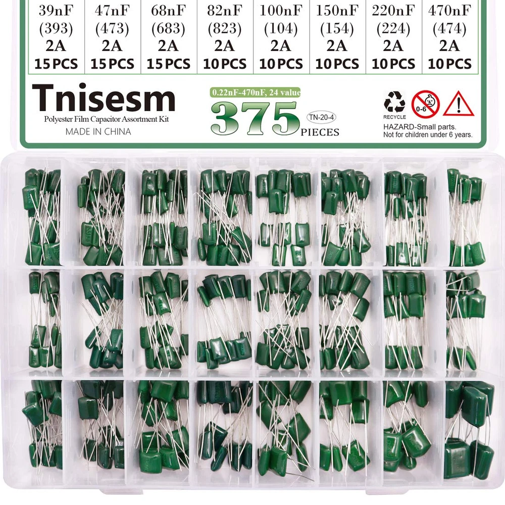 Neighborhood service 375 Pcs 24 Value Metalized Mylar Polyester Film Capacitors Assortment Kit 0.22Nf - 470Nf 100V in a Box Tn-20-4 ENJOY THE FEATURES High quality Polyester Film Capacitors Assortment Kit. Dielectric Material: Polyester ; Rated Voltage: DC 100V; Capacitance Tolerance: ±5% ; Operating Temperature: -40 ~ +85 degree Celsius Capacitance Model: 0.22nF - 470nF (0.22nF /0.33nF /0.47nF /0.56nF/ 0.68nF / 1nF / 2.2nF / 2.7nF / 3.3nF / 3.9nF / 4.7nF / 6.8nF / 10nF / 15nF / 22nF / 33nF / 39nF / 47nF / 68nF / 82nF / 100nF / 150nF / 220nF / 470nF) Package Quantity: 375 Pcs (24 Values in total),in a transparent storage case for quick access and protection. Excellent Humidity Resistance, Miniature Size, Wide Capacitance, Reliable Performance. Wide Applications in Computers, Data Processing, Telecommunication, Industrial Control, etc. Different sizes can meet your different needs Product Description Product description Color Green Voltage Rating 100V Capacitance Tolerance ±5% Operating Temperature -40 ~ +85 degree Celsius A variety of Capacitors and Resistor are available Tinker, DIYer and hobbyists must! Great for repair and modification of TV, LCD monitor, radio, stereo, game console, microwave, prototyping, etc. Suitable for repairs and small projects. Item model number Tn-20-4 Capacitance Tolerance 5 Color Mylar Capacitors Material Polyester Shape Rectangular Operating Voltage 100 Volts Package Dimensions 10 x 7.13 x 0.67 inches; 9.14 ounces 7.13 inches x 10.0 inches x 0.67 inches. Weight: 9.14 oz PAYMENT We accept all payments via Ebay using Credit Cards , PAYPAL , Apple Pay and many others SHIPPING We are always working hard to ensure your package arrives as soon as possible. Please understand that some factors like weather, high postal traffic, and the performance of shipping companies are outside of our control. We offer free shipping to the lower 48 states and ship within 3-5 business days of payment, usually sooner. We do not accept P.O. Boxes. Please provide a physical address. We do not ship internationally at this time. DELIVERY & RETURN POLICY We do not offer returns unless the item violates eBay policies. Please be aware these polices only make sellers accept returns if the item violates eBay's Buyer Guarantee. If you would like to learn more about this please visit eBay's Help Page. Thank you for your business