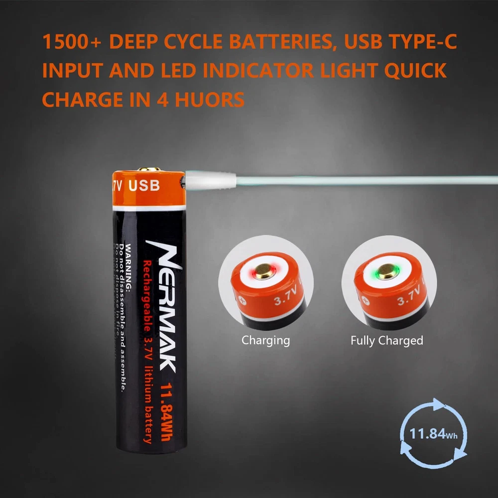 【Size Parameters】3.7V 3200mAh lithium batteries, size: 18mm(0.7 inch) diameter x 70mm(2.7 inch), (Note: they are longer than the flat-top batteries, please check the battery size before purchasing) 【Superior Performance】:Built-in USB-C port, support C-C output, you can charge your cell and other devices in case of , ordinary USB cable can be easily charged No need for additional battery charger (PD fast charging is not supported) 【Widely Uses】:NERMK 3.7V rechargeable batteries are suitable for flashlights, headlamps, toys, remote controls, microphones, radios, bike lights, bluetooth speakers, and other household devices. 【Safe and Efficient】: 3.7V battery has built-in safety protection against overcharging, over-discharging, over-current and short-circuit, with 1500+ charging cycles for longer service life, making it an ideal battery for high-frequency equipment. 【Warm Note】: 1* 3.7 Volt lithium ion battery,12 months , If you have any question for our product, us: click the "Ask a question" on our storefront or in "YOUR ORDER" options click the "seller"