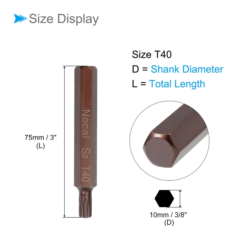 Document Attributes:* Shank Size: 10mm / 3/8"* Total Length: 75mm / 3"* Bit Type: T40 * Material: S2 SteelWhat Is Included:* 1 Piece x Torx Screwdriver BitApplications & Features:--- Those bits fit for electric screwdrivers, hand screwdrivers, electric drills, air drills, air batches and 3/8" (10mm) screwdriver sets.--- The torx screwdriver bits are made of S2 steel, which ensures high hardness, durability and wear resistance.--- These screwdriver bits are magnetic, which can firmly absorb the screw to prevent it from falling off.--- The star head bits are easy to install on the screwdriver handle with double ear on the sides of the bit shank.Useful Tips:--- Please apply appropriate force. Excessive force may cause the bit to slip, while insufficient force may not effectively tighten or remove the screw. Torx Screwdriver Bits 3/8" Hex Shank 75mm Long T40 Magnetic Screw Driver Bit Attributes: * Shank Size: 10mm / 3/8" * Total Length: 75mm / 3" * Bit Type: T40 * Material: S2 Steel What Is Included: * 1 Piece x Torx Screwdriver Bit Applications & Features: --- Those bits fit for electric screwdrivers, hand screwdrivers, electric drills, air drills, air batches and 3/8" (10mm) screwdriver sets. --- The torx screwdriver bits are made of S2 steel, which ensures high hardness, durability and wear resistance. --- These screwdriver bits are magnetic, which can firmly absorb the screw to prevent it from falling off. --- The star head bits are easy to install on the screwdriver handle with double ear on the sides of the bit shank. Useful Tips: --- Please apply appropriate force. Excessive force may cause the bit to slip, while insufficient force may not effectively tighten or remove the screw. Hot Item Payment 1.We accept eBay payment . 2.Payment must be received within 7 business days of auction closing. Shipping 1.We ship to your eBay or Paypal address. Please make sure your eBay and Paypal address is correct before you pay. 2.Items will be shipped within 1-3 business day when we received payment. 3.Delivery time depends on destination and other factors. Description Policy Torx Screwdriver Bits 3/8" Hex Shank 75mm Long T40 Magnetic Screw Driver Bit Attributes: * Shank Size: 10mm / 3/8" * Total Length: 75mm / 3" * Bit Type: T40 * Material: S2 Steel What Is Included: * 1 Piece x Torx Screwdriver Bit Applications & Features: --- Those bits fit for electric screwdrivers, hand screwdrivers, electric drills, air drills, air batches and 3/8" (10mm) screwdriver sets. --- The torx screwdriver bits are made of S2 steel, which ensures high hardness, durability and wear resistance. --- These screwdriver bits are magnetic, which can firmly absorb the screw to prevent it from falling off. --- The star head bits are easy to install on the screwdriver handle with double ear on the sides of the bit shank. Useful Tips: --- Please apply appropriate force. Excessive force may cause the bit to slip, while insufficient force may not effectively tighten or remove the screw. Hot Item Payment 1.We accept eBay payment . 2.Payment must be received within 7 business days of auction closing. Shipping 1.We ship to your eBay or Paypal address. Please make sure your eBay and Paypal address is correct before you pay. 2.Items will be shipped within 1-3 business day when we received payment. 3.Delivery time depends on destination and other factors.