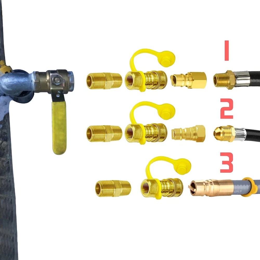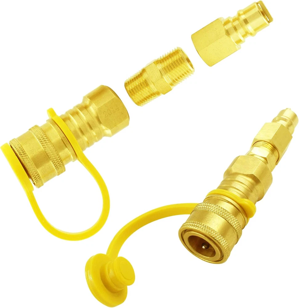 4 piece-Brass 3/8" Natural, Propane quick convert connect fittings adapter, include: 3/8 "Female Pipe Thread x 3/8"Male Flare Quick Connect /Disconnect adapter, 3/8 "female NPT x 3/8" male quick connecting full flow plug, 3/8" male NPT x 3/8" male NPT connecter, 3/8 "flare female x 3/8" male quick connecting full flow plug Sturdy material: These coupling connecter adapters and natural gas quick connecting fittings are made of 100% solid brass material, The center hex nut of these quick-connect adapters provides a solid grip while installing, not easy to break and deform, durable .ductility at high temperatures and low magnetic permeability provide a long service time This 3/8 Inch natural gas quick conversion connecting fittings kit can be applied in low-pressure natural gas or propane gas systems, suitable for Cart Style Liquid propane/ natural Gas Grill, motorhomes, trailers, ships, firepits, fireplaces, etc. 3/8" male quick connect full flow plug x 3/8" female NPT and 3/8" flare female thread with lp propane hose used in combination together can easily convert the BBQ grill and the fire pit table gas inlet to quickly connect/disconnect adapters mode, without tools, and easy to install, also easy to quick use This 3/8" quick-connect conversion coupling kit is powerful, widely used, and has many quick connection methods modes, suitable for all 3/8 connection gas cookers, fire pit quick connection; if you encounter this/8" If you have any questions about the quick-connect conversion coupling kit, please contact us directly through the Amazon platform (MCAMAPS). Get a 100% refund and technical support services within 24 hours Product Description 3/8“ Quick Connect Disconnect Adapter 3/8" Female NPT Thread x 3/8" Male Flare Quick Connect Disconnect. 1/2 PSI High Quality 100% Brass Fitting.Easy to install, no tools required Add a convenient connect/disconnect method ,automatically shuts off flow when you disconnect the hose 3/8" Quick Disconnect plug to 3/8“ Flare Female Thread 360-degree rotating 3/8" flare female x 3/8" quick disconnect plug connecters usually convert BBQ ovens, fire pits, etc. with 3/8" flare male connectors for quick disconnect adaption, Easy Connect and discount by the plug, Better to use and easy to use High Quality 100% Brass Fitting, operating temperatures range from-53 to 121 °C/-65 to 250 °F, the flare with threa fitting threads pipes provides a tighter seal which is non-leaking and safer 3/8" Quick Disconnect plug to 3/8“ Female NPT Thread 3/8" quick disconnect plug x 3/8" female NPT thread Connecter is used to convert all gas cooktops with 3/8 male NPT connector for quick disconnect High Quality 100% Brass Fitting, operating temperatures range from-53 to 121 °C/-65 to 250 °F,The connection between NPT thread and NPT thread cannot be fully screwed in place, it is sealed by the tightness of the thread, and must be tightened with a wrench 3/8" NPT Male to 3/8"NPT Male Thread 3/8 NPT to 3/8 NPT male brass equal hex nipples. NPT thread has a 60° taper, so usually unable to screw the thread to the end. 100% Premium solid brass nipple, thicker and stronger, durable, threads are deep and accurate, Used to connect female pipes with same diameters, or extending the pipe length. Apply to plumbing connections, compressed air, hydraulic, refrigeration, instrumentation, gas and other applications, hex nipples for easy tightening and loosening. Operating pressure: 1200 psi; Temperature range of -65°F to +250°F (-53°C to +121°C). It's hard connect way and in most cases do not require sealant. Use a 3/8 inch quick connect/disconnect adapter to connect to the BBQ grill. The BBQ grill inlet is a quick connect method and the 3/8 inch quick plug to connecting propane hose. Use a 3/8 inch NPT female or 3/8 inch flare female plug adapter Install to connect on the Mr heater, barbecue grill or gas generator has 3/8 Male thread fiiting adpater The 3/8 inch quick connect/disconnect adapter to connect the propane hose. In this way, they also form a quick connection/disconnection method when used 3/8" male NPT x 3/8" male NPT adapter plus 3/8 "Female Pipe Thread x 3/8" Inch Male Flare Quick Connect Disconnect adapter to connect the home backyard gas pipe to 3/8" Quick Connect Disconnect adapter Powerful 4 Piece 3/8" Natural/LP Gas Brass Quick Connect Fitting Adapter Sets Made of 100% high-quality brass, widely used Convert BBQ grills and fire pits to quick connect / disconnect method ,automatically shuts off flow when you disconnect the hose. Convert Gas power generator to quick connect / disconnect method ,automatically shuts off flow when you disconnect the hose.