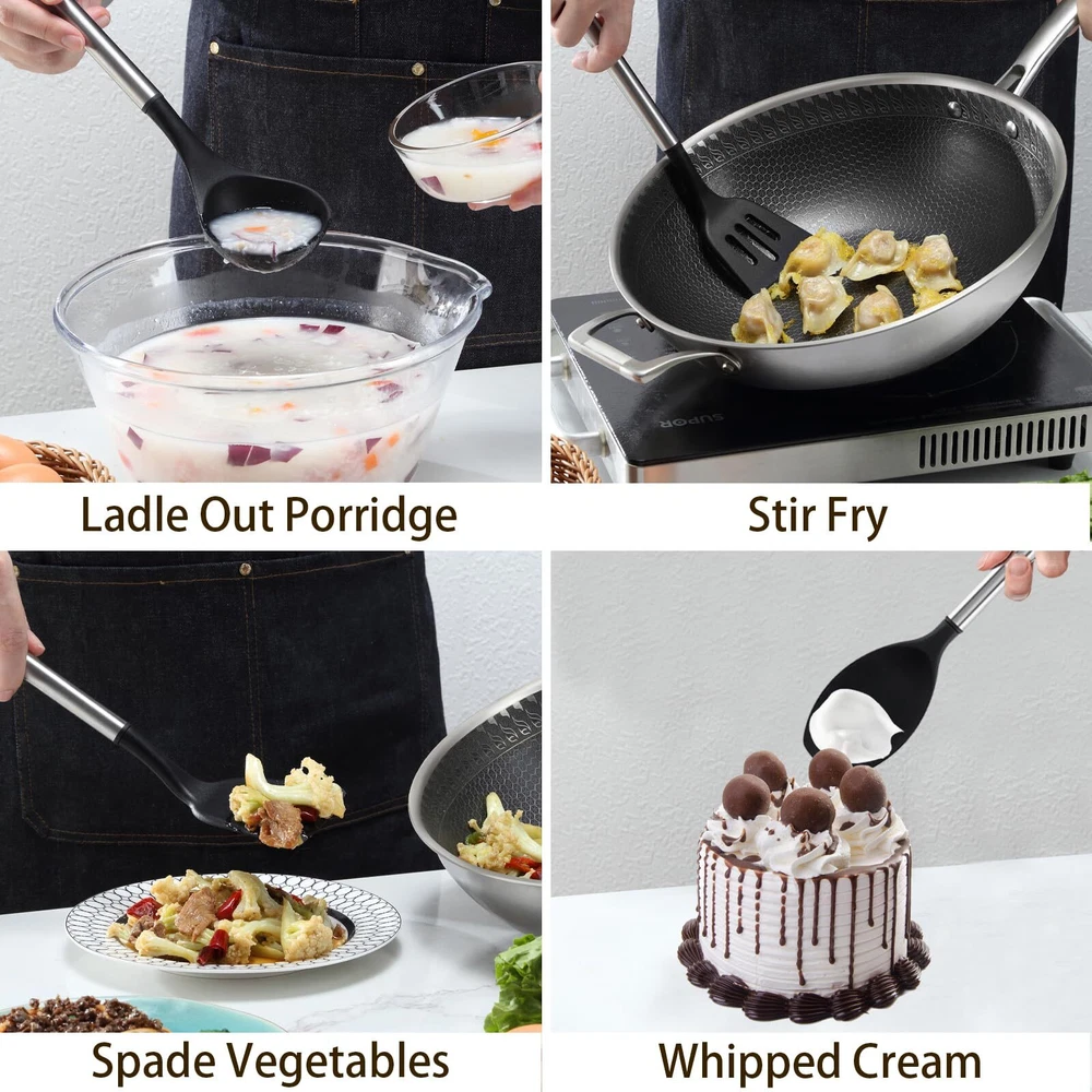 【38-Piece Silicone Kitchen Utensils Include】Hanging Hook x 10, Measuring Spoon x 5, Measuring Cup x 5, different sizes of Spatula x 3, Oven Mitt x 2, Solid Spatula x 1, Slotted Spatula x 1, Solid Spoon x 1, Slotted Spoon x 1, Soup Ladle x 1, Handled Strainer x 1, Spaghetti Spoon x 1, Brush x 1, Kitchen Tongs x 1, Egg Whisk x 1, Kitchen Scissors x 1, Peeler x 1, Utensils Holder x 1. A single purchase will put together whatever kitchen gadgets you need without the need for multiple purchases 【High Quality Food Grade Silicone】Our kitchen utensils set is made of healthy and non-toxic silicone, so there will be no odor and no chemical reaction with any food and drink when cooking. Using it will not cause any health burden. It is recommended to soak the cooking utensils set for 30 minutes when using for the first time, and then dry them well to eliminate the initial odor 【High Temperature Resistance】 our silicone spatula can withstand high temperatures up to 180°C and does not melt or deform easily. Compared to other materials, our kitchen set has a longer service life. The flexible material also reduces noise and does not scratch the bottom of the pan 【No Stain Hiding Design】 High quality stainless steel handle of our kitchen utensils set with holder is healthy and durable, rust-proof and corrosion-resistant. The craftsmanship is exquisite with no gaps, easy to clean. If you think it's a hassle, you can put our kitchenware in the dishwasher to clean it and free up your hands 【Kitchen Essenti】Our cooking utensils have both spoon set and spatula set, as well as kitchen shears, peeler and other kitchen tools, which can fully meet your cooking and baking needs. The handle is designed with thoughtful hooks for easy storage and drying. In addition, the silicone utensil set also comes 10 hanging hooks and 1 utensil holder, providing you with a neat and organized kitchen experience 【Rapid Response After-Sales Service】 It is our pursuit to satisfy every customer. If you have any questions about our kitchen utensil set, please feel free to contact our customer service, we will reply and deal with it as soon as possible