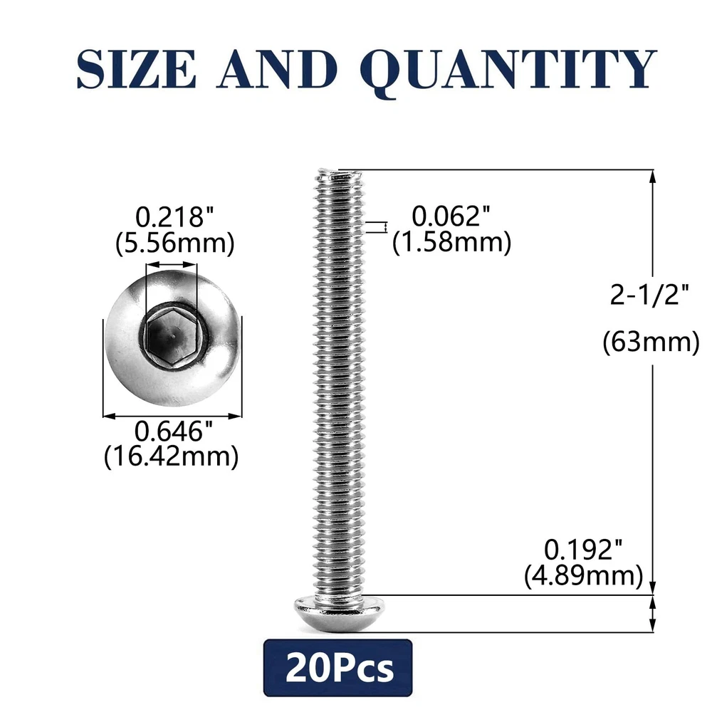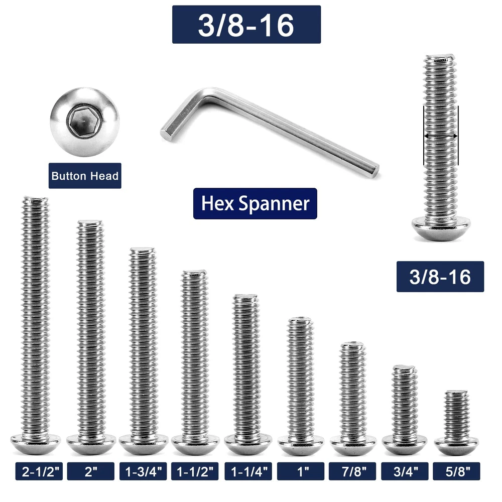 RUGGED AND DURABLE - Button Head Socket Cap Bolts Screws made of high-quality 18-8(304)Stainless Steel,which has higher corrosion resistance and anti-rust effect than ordinary bolt, longer service life, not easy to damage, more solid. Product Size - Thread Diameter: 3/8"; Thread Pitch: 1/16"; Screw Length: 2-1/2". Head Diameter: 0.646". Please check specfication by picture 2 WIDE RANGE OF APPLICATIONS - Button Head Socket Cap Bolts Screws can be widely used in the home and office appliance, communication equipments, ship assembly , the mechanical industry and small repairs around shops, garages or home furniture fasteners. VALUE PACKAGING AND EASY TO USE - This Button Head Socket Cap Bolts Screws bolt package contains 20Pcs , They are ideal for use at home, in the office or at work. INTIMATE SERVICE - focus on customer satisfaction, if you have any questions or are not satisfied, you can contact us by email, we will solve all your problems as soon as possible.