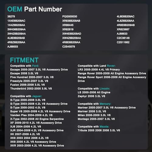 38279 Belt Tensioner Assembly with Pulley for Ford Escape 2008-2012 Land Rover LR3 Range Rover Jaguar XF XJ8 XJR XK XK8 XKR Lincoln LS Zephyr Mercury Mariner Milan Mazda 38279 Belt Tensioner Assembly with Pulley for Ford Escape 2008-2012 Land Rover LR3 Range Rover Jaguar XF XJ8 XJR XK XK8 XKR Lincoln LS Zephyr Mercury Mariner Milan Mazda OEM part numbers include 38279, 1X4E6B209AC, 1X4Z6B209AA, among others for precise identification. Compatible with various Ford, Jaguar, Land Rover, Mazda, and Mercury models from 2000 to 2010. Designed with high-grade materials for durable construction and reliable performance. Ensures optimal belt tension to prevent slippage, extending engine life and improving fuel efficiency. Reduces noise and vibration for a smoother, more comfortable driving experience. Includes a service support period of 1 year or 50,000 km.