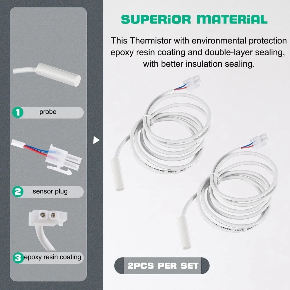 Replaces Part Numbers: Refrigerator thermostat for Dometic 3851210025 thermistor sensors. Replaces 2931863035, 2931863076, 3851059042. Applicable Model: Compatible with almost all Dometic RM,S,NDR & DM Series Models with two wire thermistor:RM1350 RM2351 RM2354 RM2410 RM2451 RM2454 RM2551 RM2554 RM2607 RM2611 RM2612 RM2620 RM2652 RM2663 RM2807 RM2811 RM2812 RM2820 RM2852 RM2862 RM3807 RM3862 RM3863 RM3962 etc.For S520 S530 S619 S620 S630 S819 S820 S830 S1521 S1621 S1631 S1821 S1831 etc. For NDR1062 NDR1292 NDR1492 etc. For DMC702 DMR702 DM2652 DM2672 Dm2682 DM2683 DM2852 DM2882 etc. Excellent Performance: Solve your refrigerator problems, the dometic 3851210025 refrigerator thermistor kit can sense temperature changes in the refrigerator and send a message to the control board Signals, which can easily solve your refrigerator temperature problems. You no longer have to worry about your fridge freezing all your food and not providing the right temperature. High Quality: This Thermistor is made from high-quality materials, with environmental protection epoxy resin coating and double-layer sealing, with better insulation sealing. Can be more accurately transmits a temperature change signal from -20°C to 105°C. Satisfaction Guarantee: We aims to provide the best service for our customer, if you're not 100% satisfied with our item, simply return it for a full refund in 60 days, no questions asked money back guarantee with 12 months’ warranty. Package Include: 2 x Thermistors
