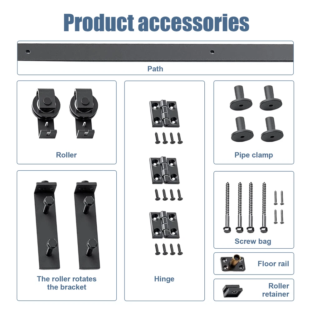 Store category Sign Up Now ! You may also like Product Description Bullet Points: Maximize Your Space: Add a touch of elegance to any room with this Rail Sliding Barn Door that seamlessly fits into different life situations. Its space-saving design concept is perfect for a wide range of applications, such as living areas, dining rooms, and study rooms. Smooth Operation: Enjoy effortless gliding with 2x roller swivel stands and 2x scroll wheels on our Rail Sliding Barn Door. Equipped with 3x hinges, spacers, a roller holder, and a sealing strip, you'll have everything you need for smooth operation. Indestructible Endurance: Our sliding barn door rail is created from excellent carbon steel that ensures good wear-resistant, solid, and durable features, ensuring you a dependable and lasting addition to your space. Modernized Setup: With pictures and text that guide you every step of the way, our Rail Sliding Barn Door is easy to install and saves time. Get detailed instructions for intuitive installation. Enhanced Durability: Engineered with a robust bearing and nylon wheel combination, this rail sliding barn door ensures practical functionality and reliable performance on a 6mm thick track. The unique design concept includes 1x floor rail for smooth operation. The durable construction, paired with the 6mm thick track, ensures longevity and ease of use. Specifications: Colour: Black Material: carbon steel Product Size: Track size: about 46 inches (117CM) Track splicing method: 3 pieces Scope of application: Door panel thickness 0.5-50MM Packing List: 3x track 2x scroll wheel 2x roller swivel stand 1x roller holder 4x pipe clamps 3x hinge 1x floor rail 1x sealing strip 1x screw pack 1x instruction manual Payment Delivery details Terms of sales About us Feedback & DSRs Payment Before you palce an order, please kindly make sure that you have a paypal account. We accept PAYPAL payment only. Payment should be completed within 2 days after auction closed, or unpaid dispute will be filed for an closing auction. An unpaid case will be filled after 4 days. Delivery details We ship to your eBay address. Each package will be shipped to US by UPS Regular Parcel with tracking number. Please check your shipping address carefully before checkout, it can't be changed if order completed. All items will be shipped within 1-2 business day upon receipt of payment.Orders placed on weekend will be shipped within 3 days. If you do not receive your item in 7-10 business days.please contact us immediately for further assistance. We will be responsible for any damages or losses incurred in the shipping process. About us We maintain high standards of excellence FIVE STAR and strive for 100% customer satisfaction! Positive Feedback is very important to us. We hope that you contact us immediately Before you give us neutral or negative feedback, so that we can satisfactorily address your concerns. We promise to offer the lowest price and high quality produce. Our working time: From Monday to Friday(9:30 am to 18:00pm), we don't working on holidays ,hope you can understand and know that , thank you. Please always talk to us via ebay Message. We appreciate your business and look forward to growing our e-Bay sales with satisfied customers. Feedback Contact us If you have any questions, please feel free to contact with us by ebay Message during our business hours ( 9:30a.m. to 5:30 p.m.), or email us through eBay, we will try our best to help you to resolve it. For any presale or after-sale questions,please do feel free to email us! Due to the time difference, each email will be replied within 1 working day,and weekend will be delayed a bit. Feedback