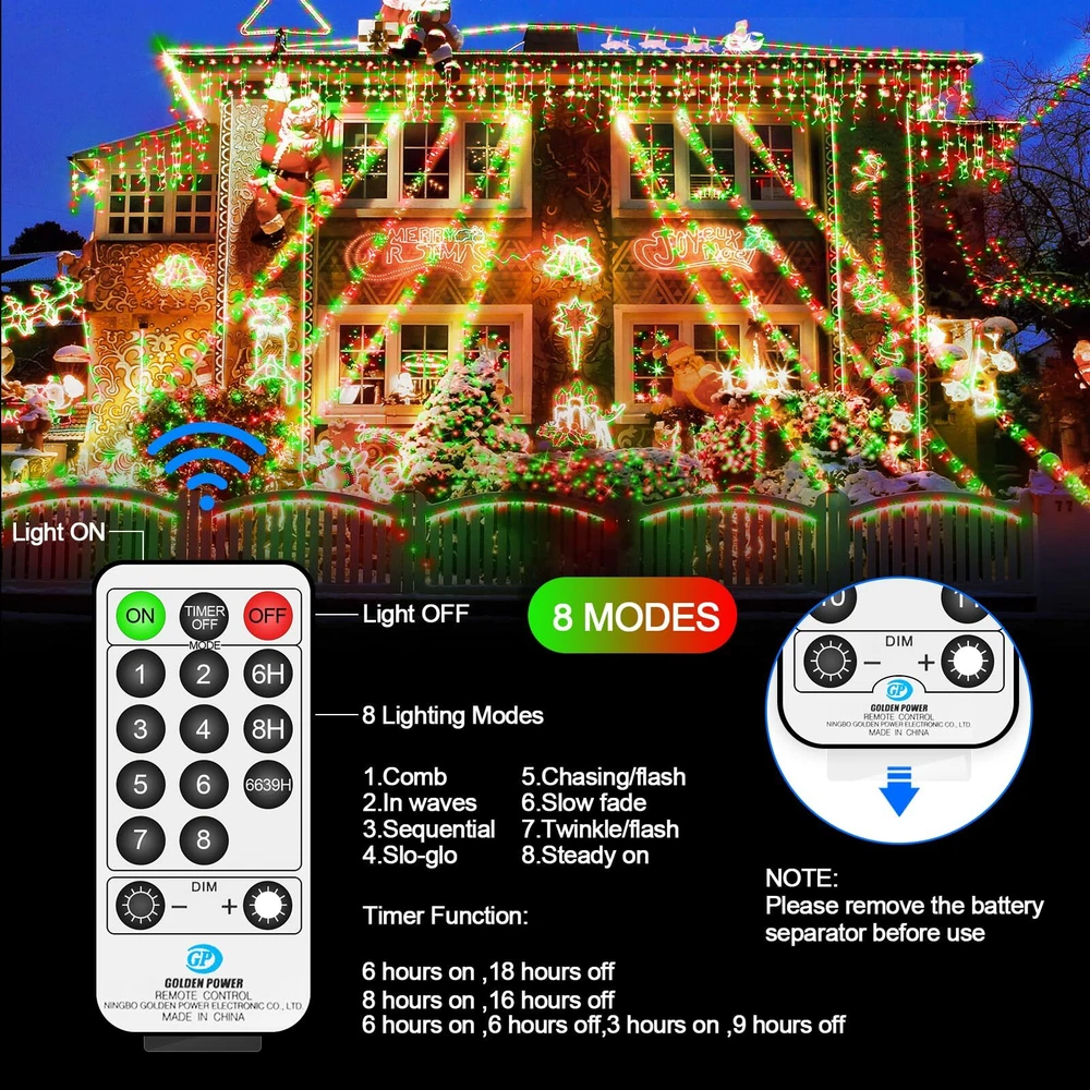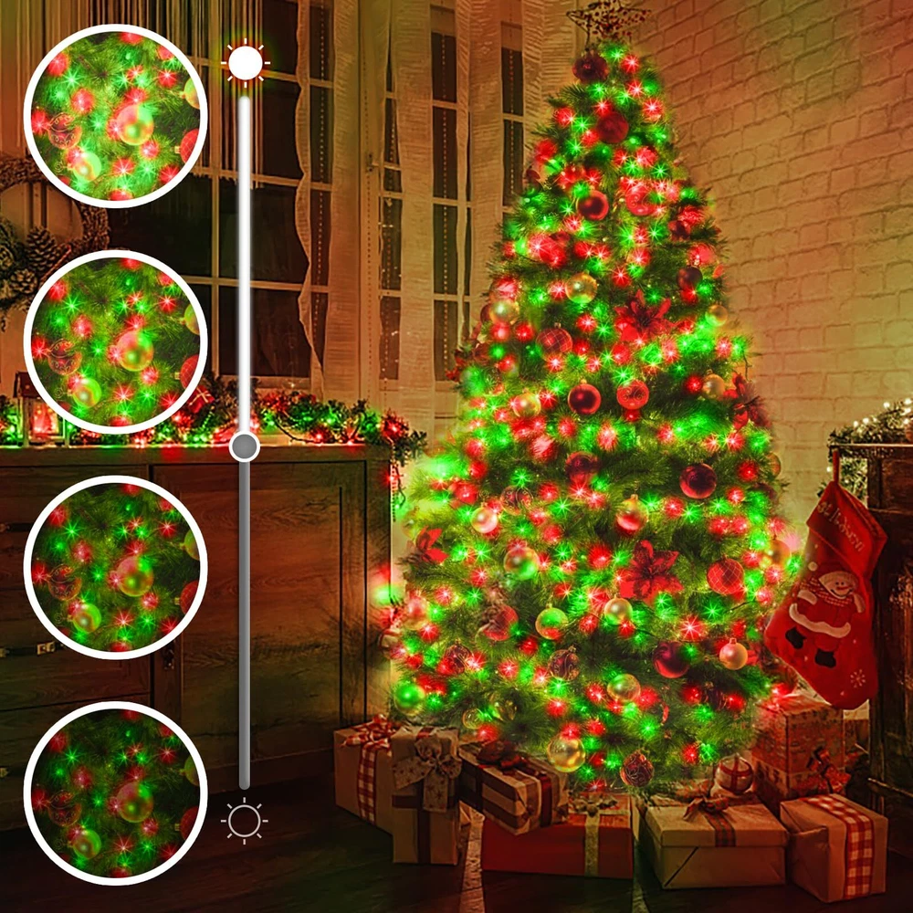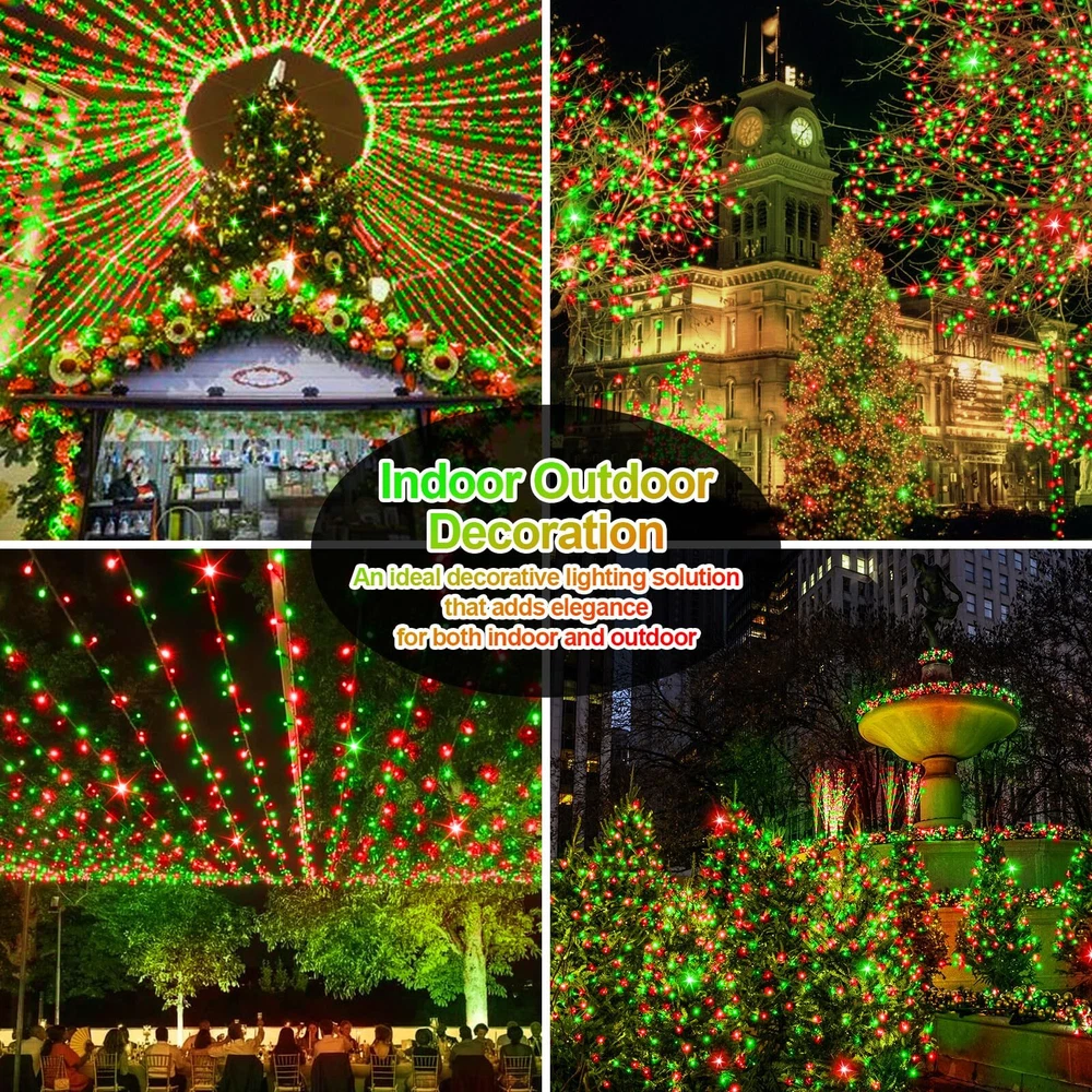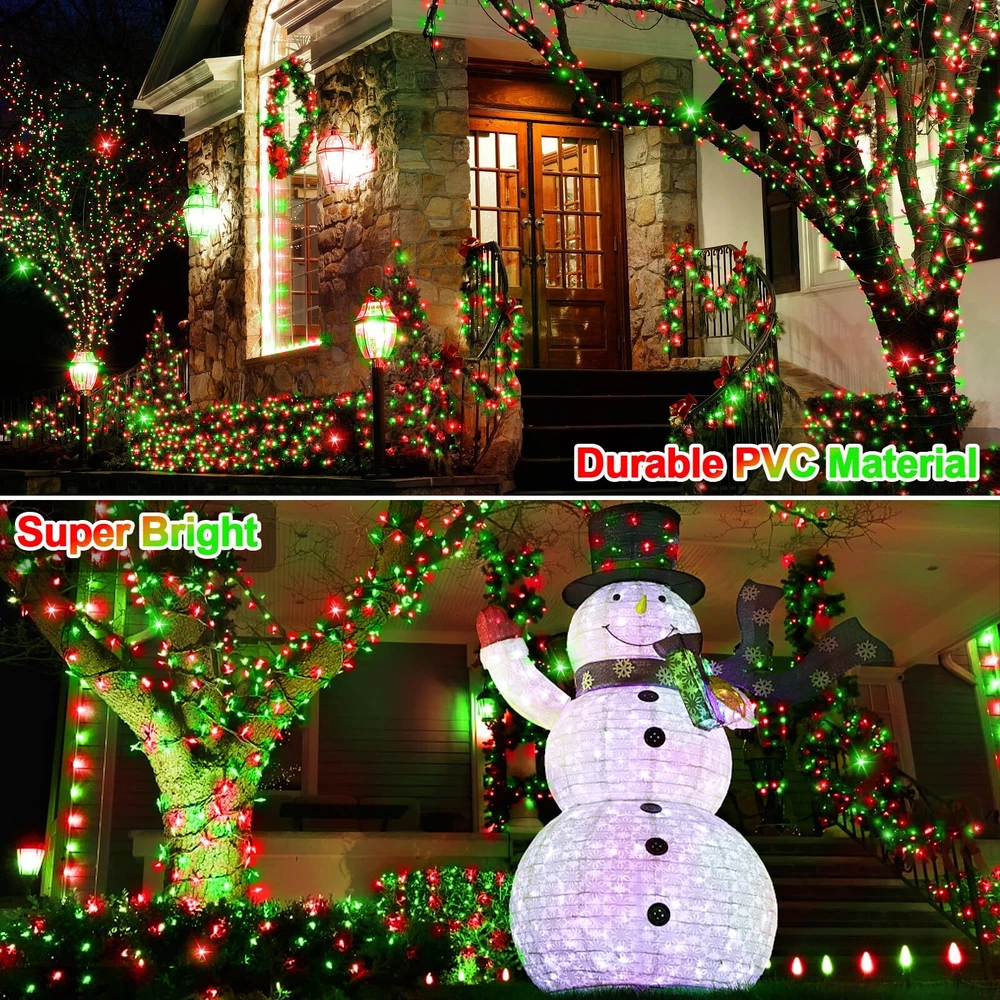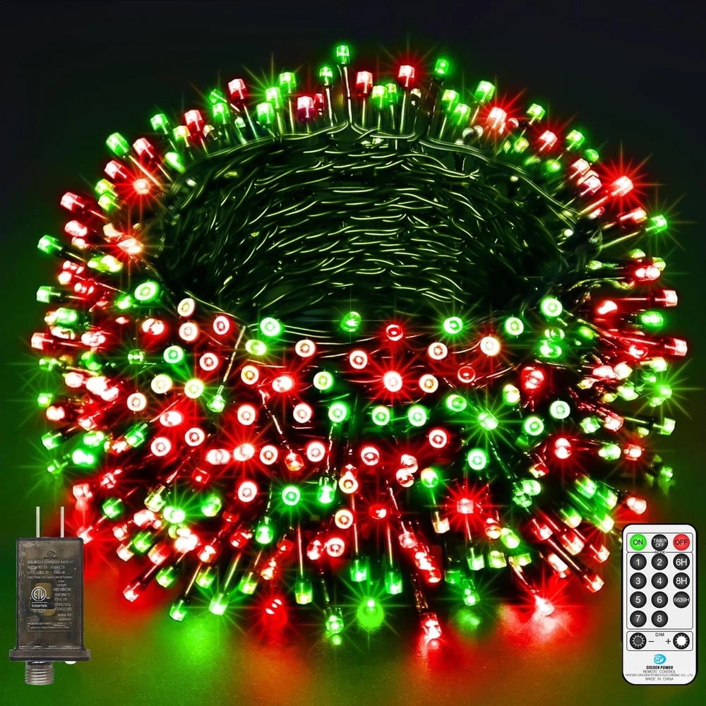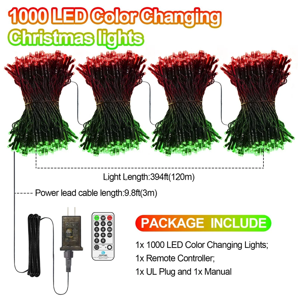 LED Super Long Christmas Lights: 1000 LED Christmas decorations length is 394 ft, and the lead wire length is about 10 ft; Outdoor decoration in the green line and greenery perfect blend more beautiful High Quality Outdoor Christmas Lights: LED string lights feature thick ABS and PVC material, which will not rust under harsh conditions. The high quality material prevents them from tangling or breaking Multifunctional LED String Lights: 8 lighting modes function; Three timer modes: 6 hours on, 18 hours off/8 hours on, 16 hours off/6 hours on, 6 hours off, 3 hours on, 9 hours off; Memory: No need to reset last time setting; 4 level brightness adjustment:25%-50%-75%-100% to meet your need Waterproof & Safe: String lights with IP44 waterproof design offer more decorative options (Note: Please keep the power plug dry); 29V low voltage plug, safe to touch What You Get: 1 x LED Christmas Tree Light; 1 x Plug in; 1 x Remote Control