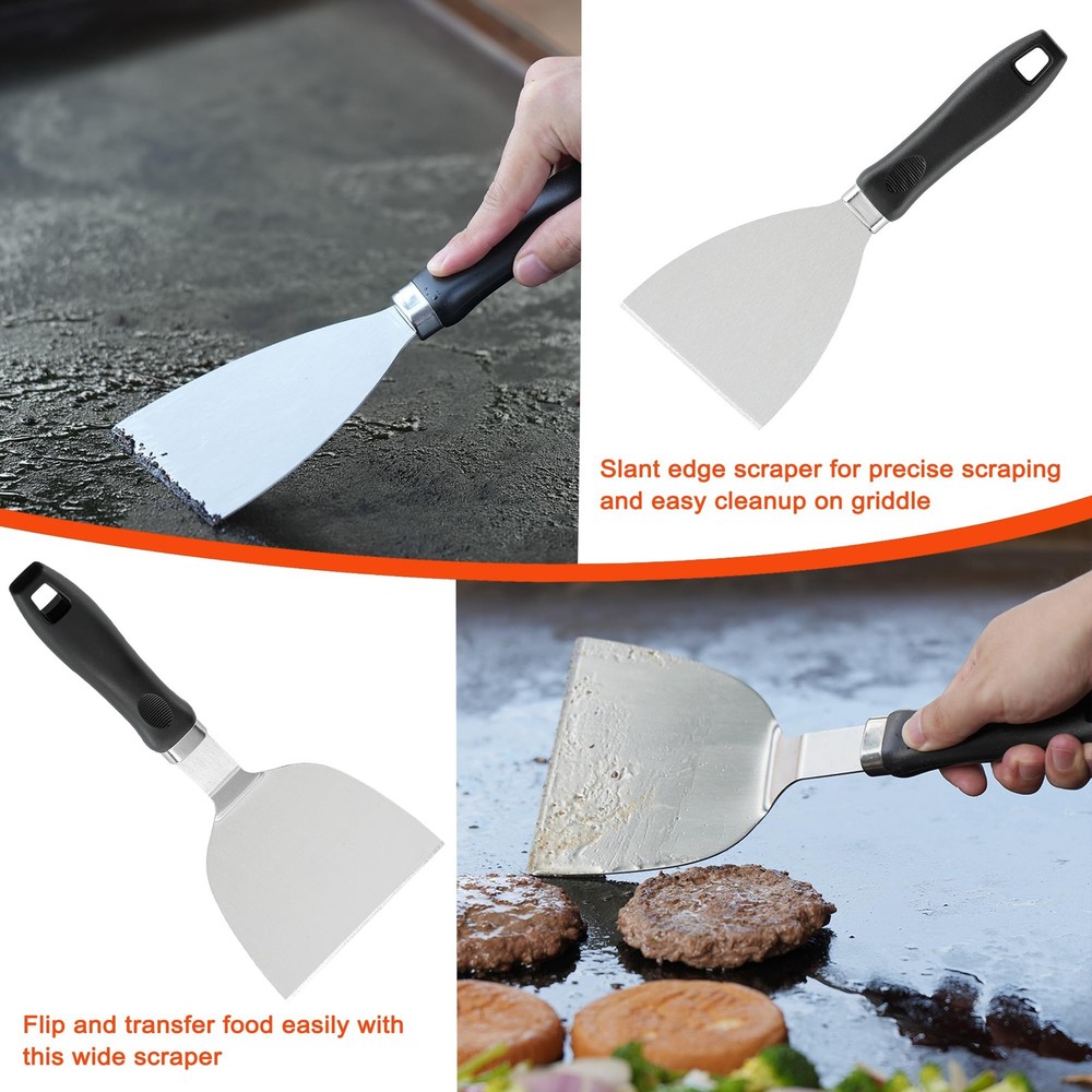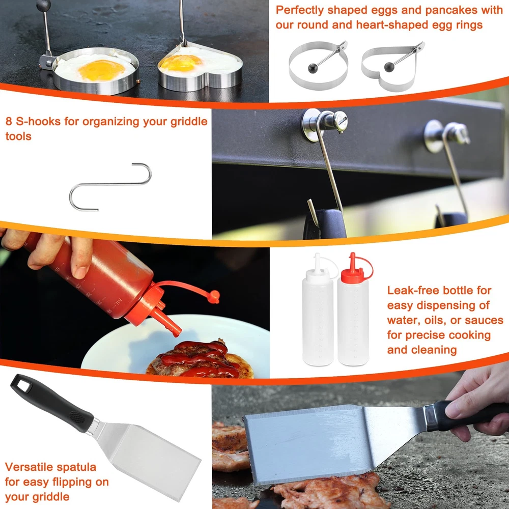blackstone griddle accessories Complete Blackstone Griddle Accessories Set: 39-piece kit featuring essential griddle tools including oversized spatulas, burger turner, melting dome, burger press, grill tongs, fork, sauce brush, scrapers, squeeze bottles, egg rings, spice shakers, silicone glove, scouring pad with handle, corn holders, and hanging hooks Durable & Easy to Clean: Crafted from high-quality stainless steel with heat-resistant, non-slip ABS handles; these Blackstone accessories are built for durability and are dishwasher safe for effortless cleaning Versatile Griddle Tools: Perfect for Blackstone griddles and other brands; ideal for flipping burgers, pancakes, veggies, and more; a comprehensive addition to your griddle accessories kit Perfect Gift Choice: Packaged in an elegant box, making this griddle accessories kit an excellent gift for birthdays, weddings, Father's Day, or Christmas; ideal for any griddle enthusiast Professional-Grade Flat Top Grill Accessories: Designed for top performance in griddle and flat top grill cooking; provides all necessary tools for a superior cooking experience