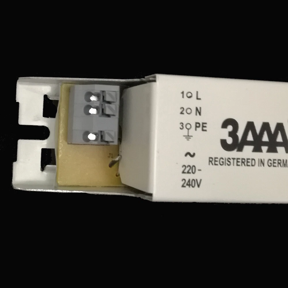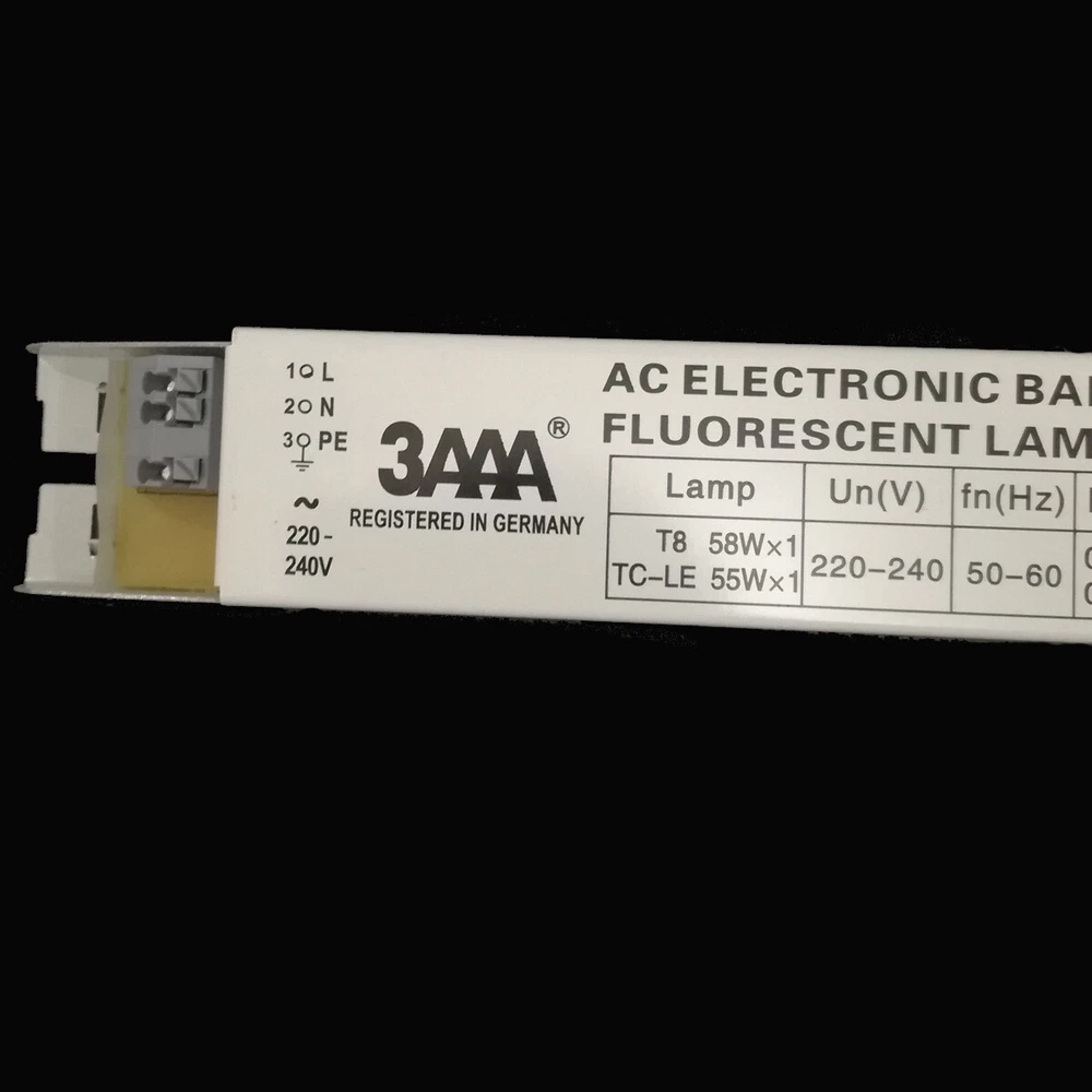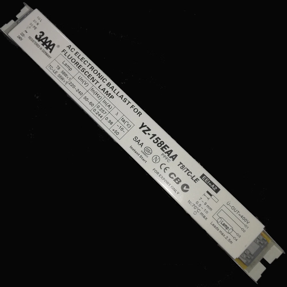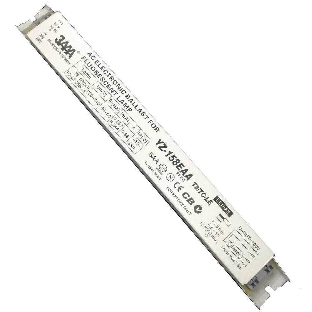 YZ-158EAA 3AAA 55-60W 220-240V Standard ECG Instant Start AC Electronic Ballast for T8 58W×1 TC-LE 55W×1 Fluorescent Lamp Attention please: The voltage of the ballast is 220V-240V , please recheck the voltage 220V-240V is suitable for use in your country or not before your order. If you place wrong order, we will not return the payment to you if the cargo shipped. Thanks for your kindly understanding. Shipping: usually it will take about 12-18days from China to US, 10-18days from China to Germany/United Kingdom/France/Spain Packing: 1 piece lighting ballast Model: YZ-158EAA T8/TC-LE PPFC Instant Start T8/PLL Standard ECG Lamp: T8 58W×1, TC-LE: 55W×1 Input Voltage: 220-240V System Power: ≤61W Power Factor:0.98 THD:<20% Ambient Temp.:-10-50 ℃ , Casing Temp.: 70 ℃ Fixing Centre:280 D mm, Dimensions: 290×30×30mm Application: S1:General office and industrial and commercial lighting S4: Emergency lighting system Product Feature: Light weight with metal material case Great compatible with lamps, no flickering Warm start which can better protect the lamp Lengthen lamp life and longer interval periods Good energy savings Automatic shutdown of abnormal conditions